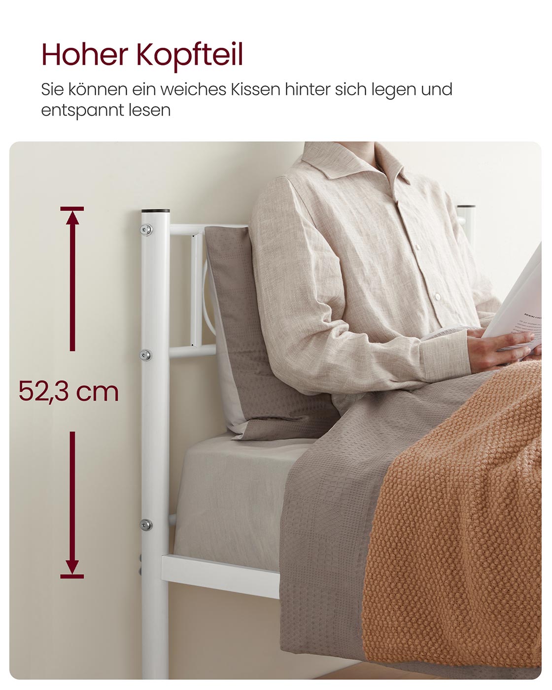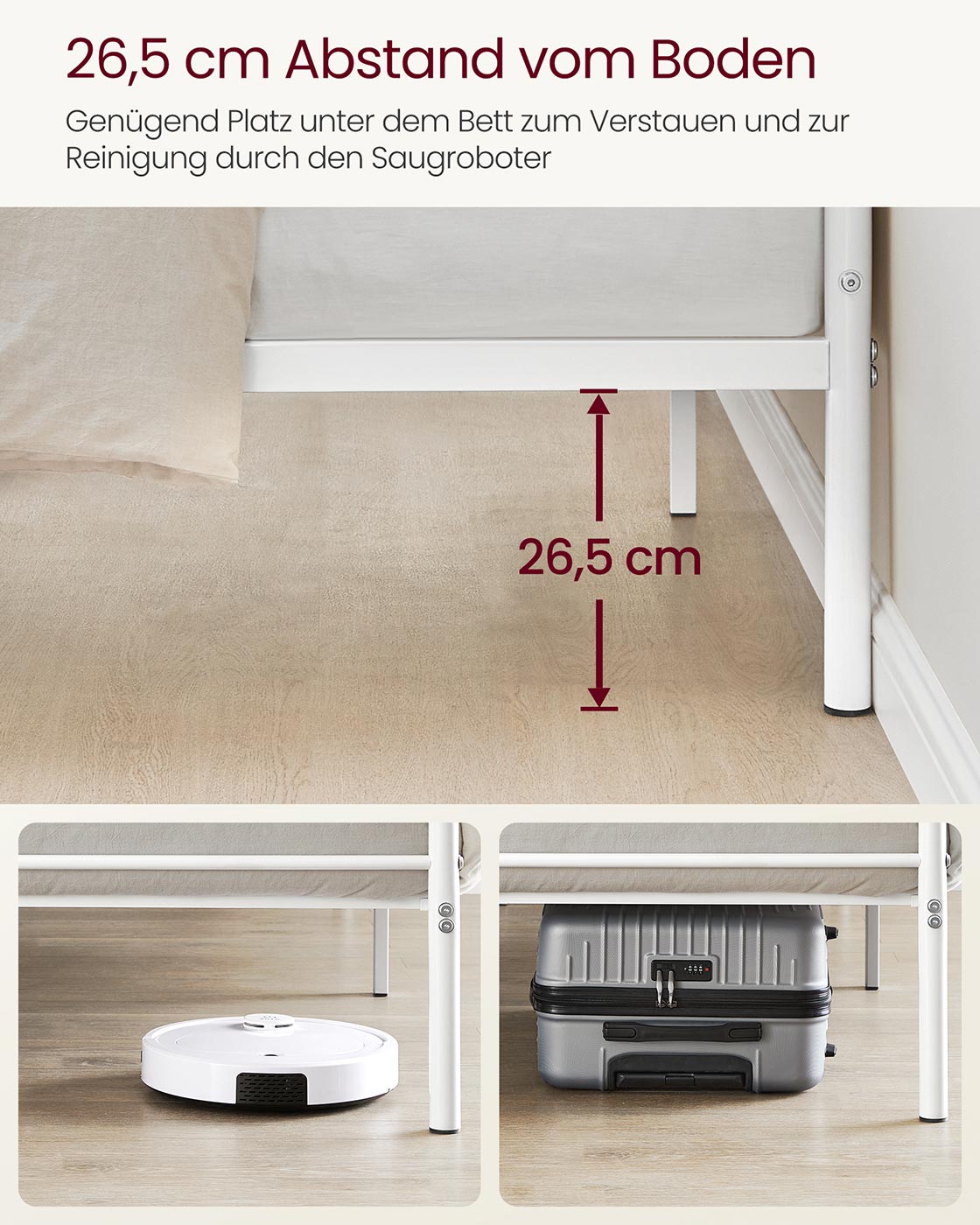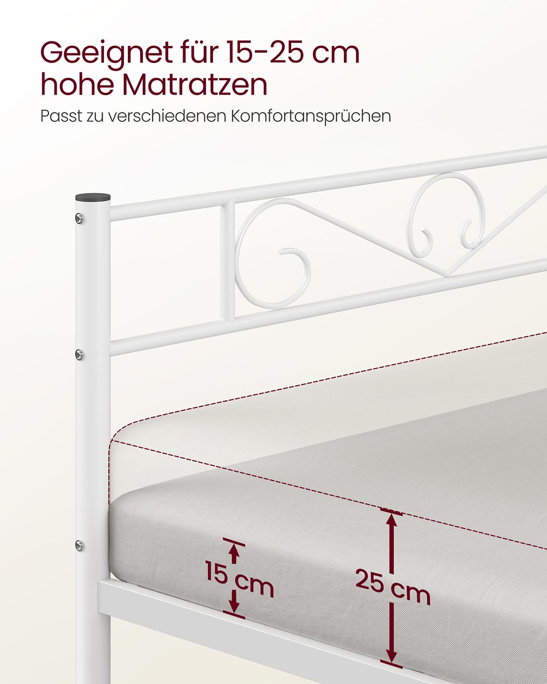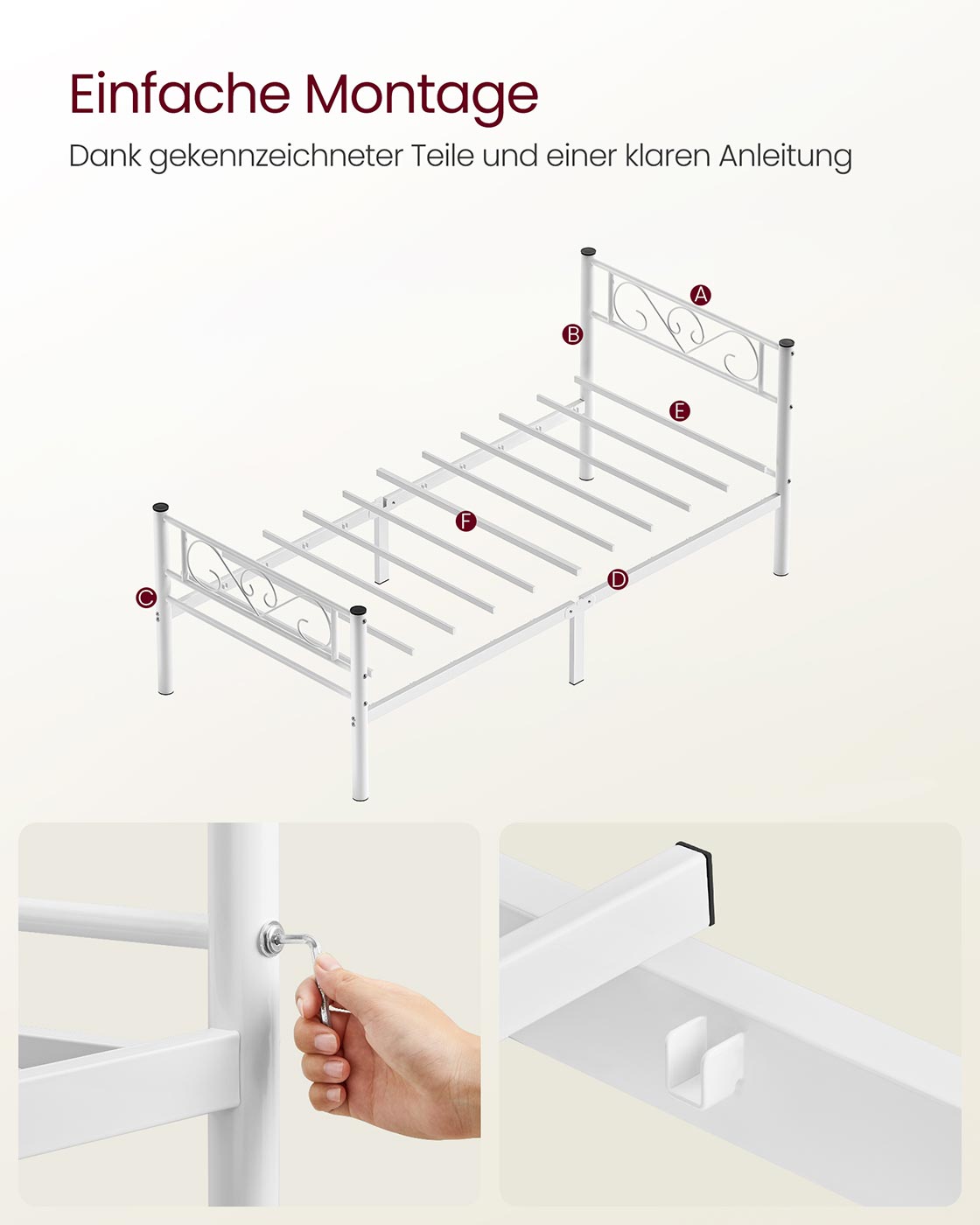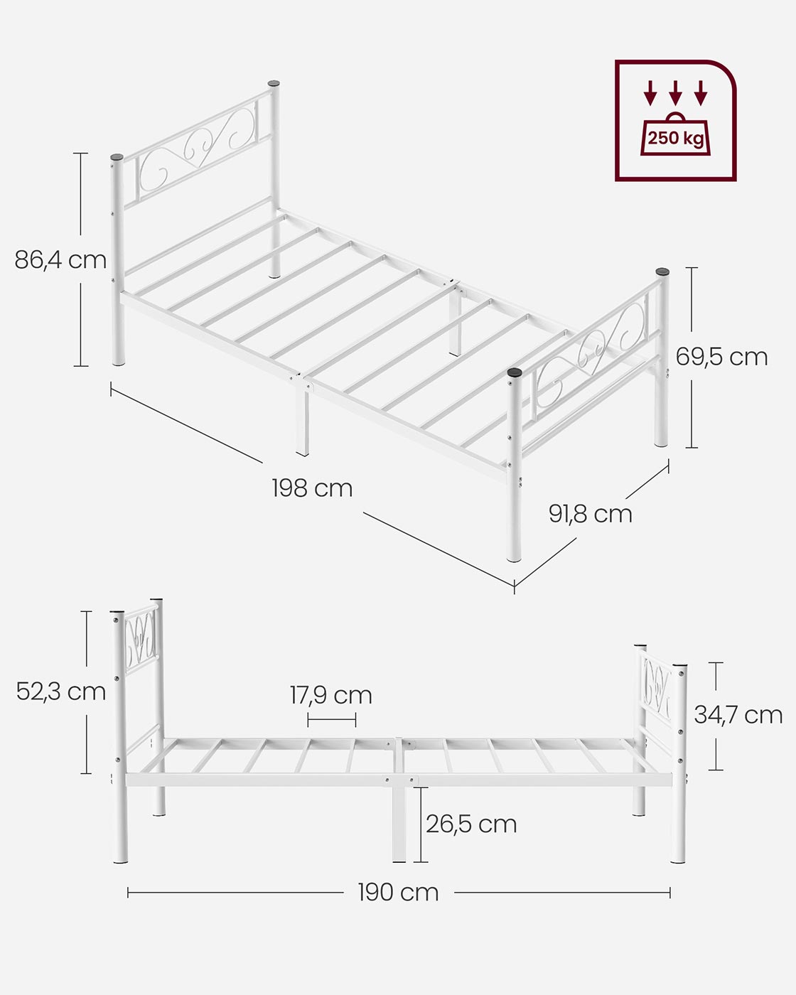No more insomnia – sweet dreams await: The difference between a sleepless night and a night full of sweet dreams often lies in the bed frame and mattress that support you throughout the night. As you make your bed, so you must lie in it! Highlights of this VASAGLE metal bed frame: – No box spring required; this bed frame supports your mattress directly. – No tools are required for assembly, everything is included in the package! – A durable metal frame, 11 metal crossbars, and 6 metal legs ensure that you lie securely throughout the night. – The attractive white finish and simple design add a modern charm to your room. Product details: – Color: White – Material: Powder-coated metal – Size: 198 x 91.8 x 86.4 cm (L x W x H) – Weight: 14.2 kg – Max. static load capacity: 250 kg Scope of delivery:- 1 x bed frame – 1 x accessory package – 1 x instructions (DE, EN, ES, FR, IT) VASAGLE notes: – Children must not stick their heads into the gaps between the metal tubes. – Make sure that all parts and screws are securely fastened before use. – A mattress is not included in the delivery.