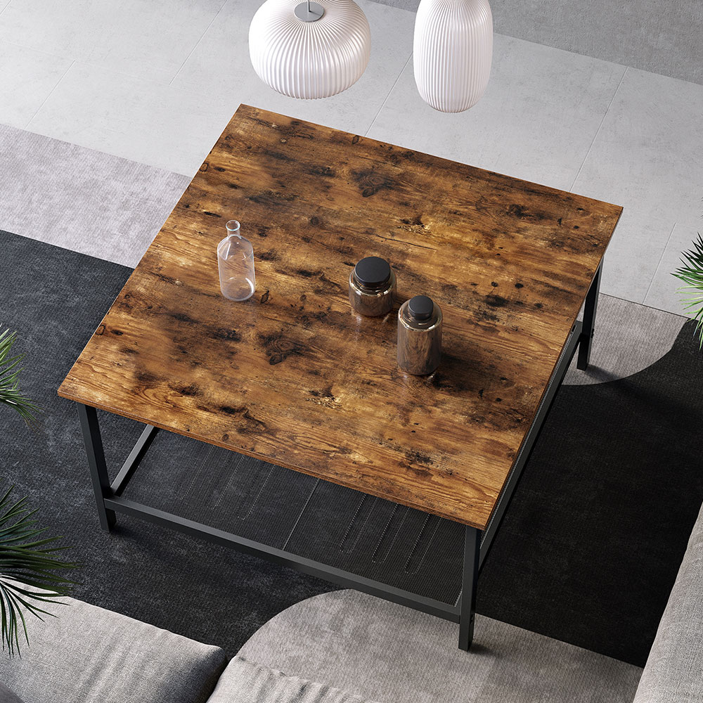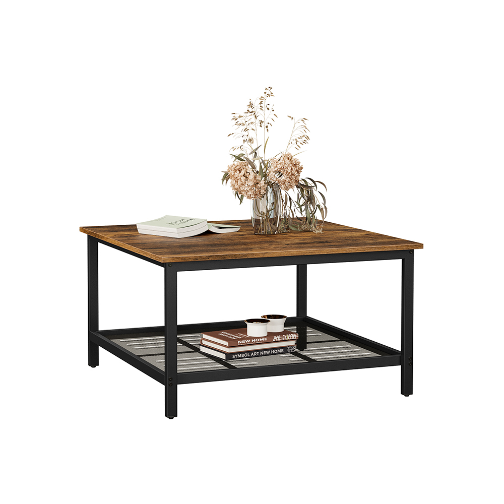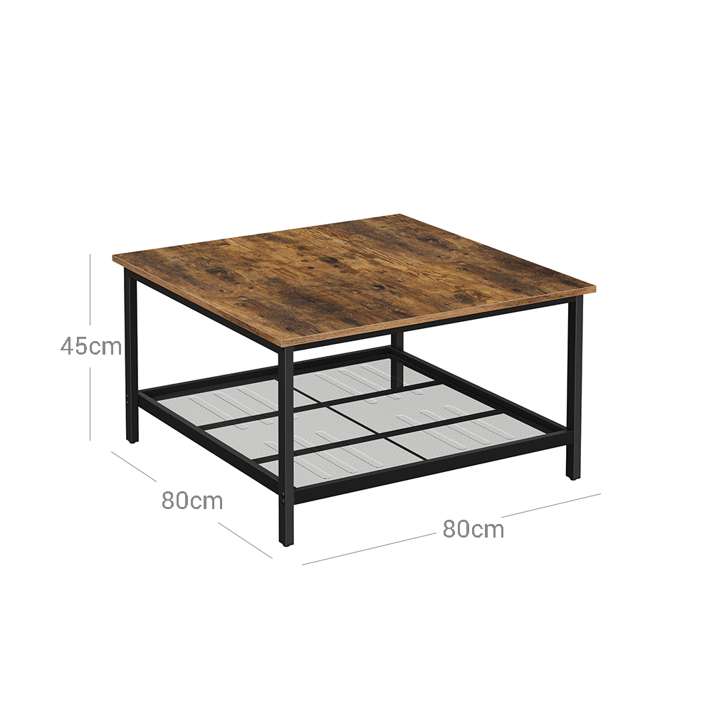Product details: – Color: Vintage brown-black – Material: Chipboard, steel – Size: 80 x 80 x 45 cm (L x W x H) – Weight: 11.6 kg – Max. static load capacity of the surface: 40 kg – Max. static load capacity of the mesh shelf: 5 kg Scope of delivery:- 1 x coffee table – 1 x accessory pack – 1 x instructions (DE, EN, ES, FR, IT) VASAGLE Notes: – For safety reasons, children are not allowed to climb on or play with the product. – The maximum static load capacity of the product is 45 kg. Do not place any heavier objects on the table.