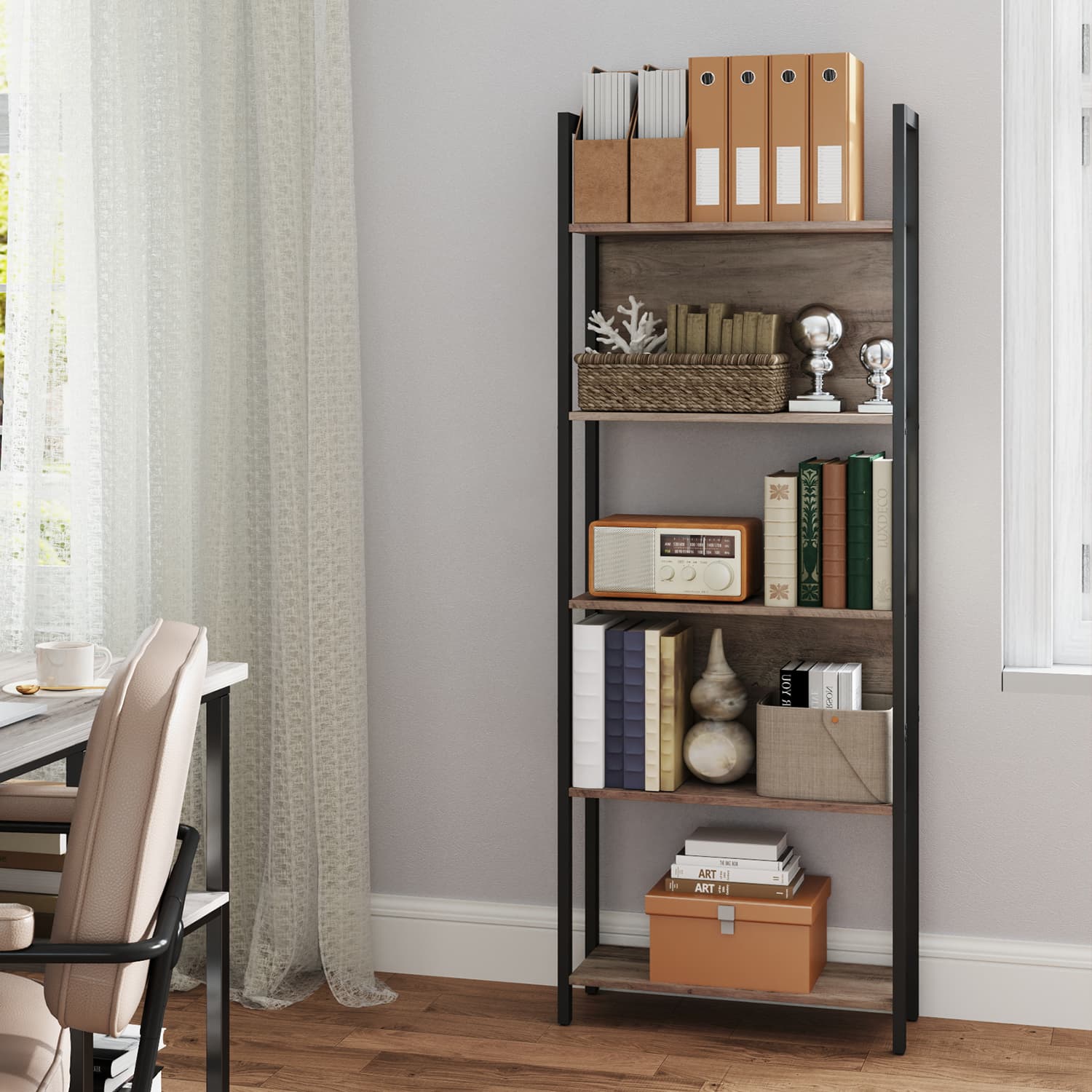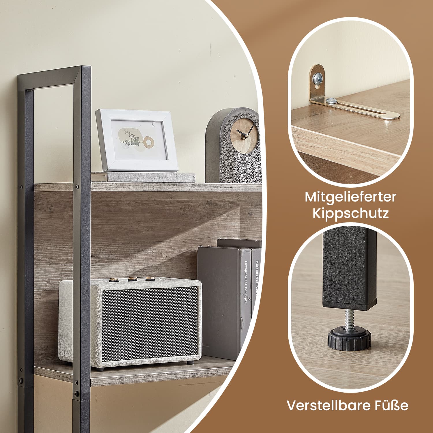 Product details: – Color: Greige-black – Material: Chipboard, steel – Size: 62 x 24 x 165 cm (L x W x H) – Weight: 14 kg – Max. static load capacity per shelf: 20 kg Scope of delivery:- 1 x bookshelf – 1 x accessory package – 1 x anti-tip device – 1 x instructions (DE, EN, ES, FR, IT) VASAGLE notes: – For safety reasons, children are not allowed to climb on or play with the product. – Please attach this product to the wall using the included anti-tip device.