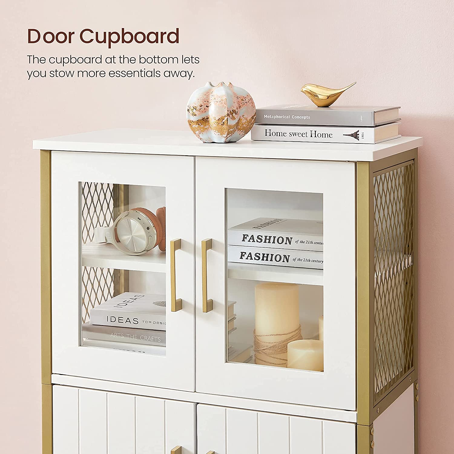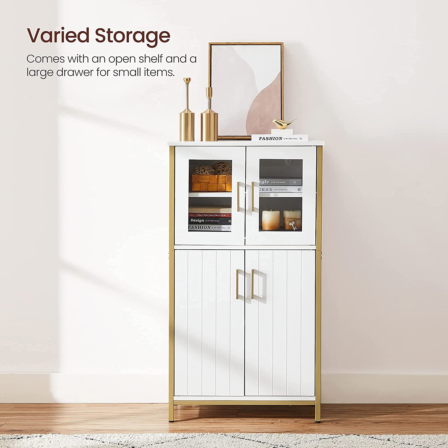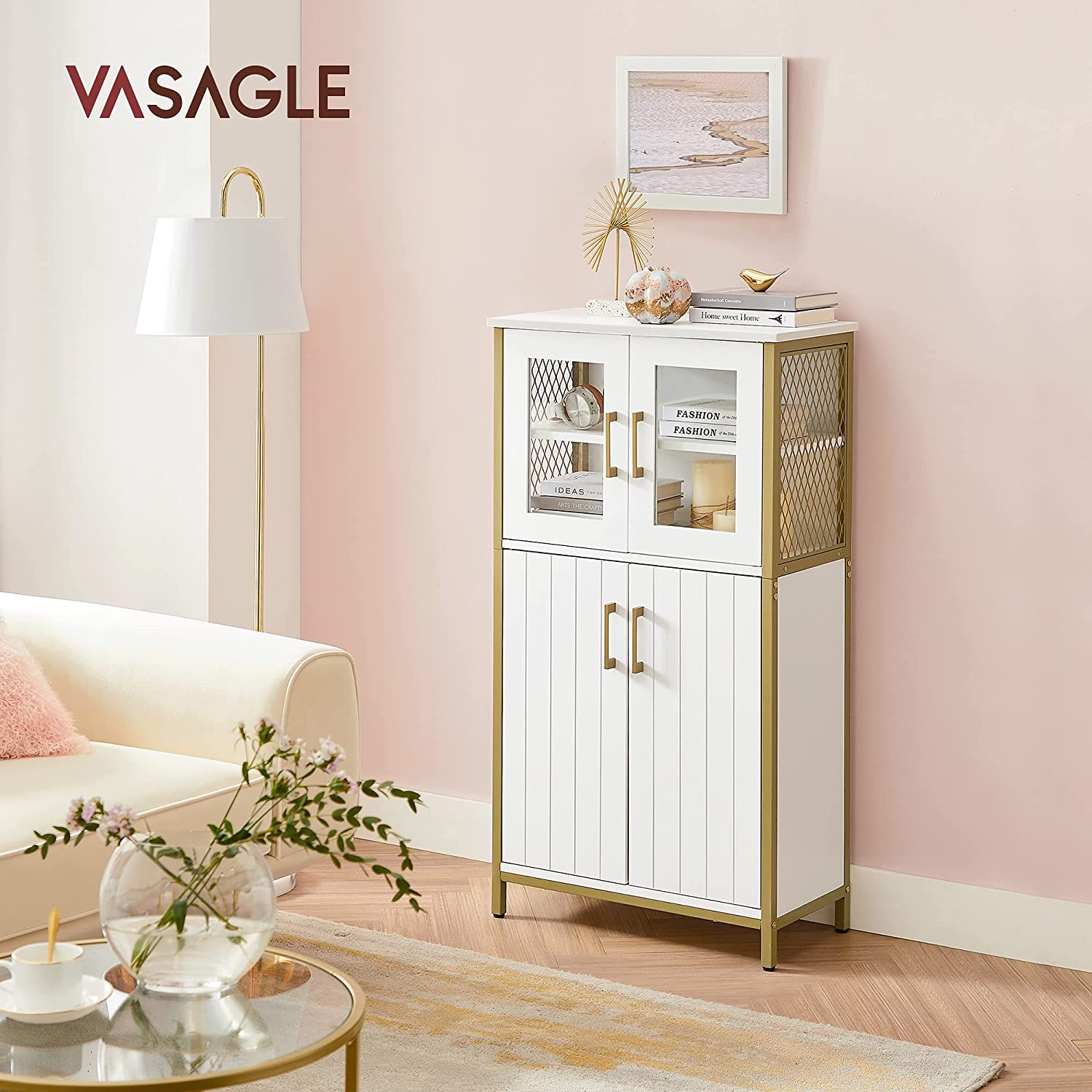 Product details: – Color: White-gold – Material: Chipboard, steel, glass – Dimensions: 60 x 30 x 108 cm (L x W x H) – Weight: 23.7 kg – Max. static load capacity of the top shelf: 30 kg – Max. static load capacity per shelf behind the doors: 5 kg Scope of delivery:- 1 x storage cabinet – 1 x anti-tip device – 1 x accessory pack – 1 x instructions VASAGLE Notes: – For safety reasons, children are not allowed to climb on or play with the product. – Please attach this product to the wall using the included anti-tip device to ensure safe use.