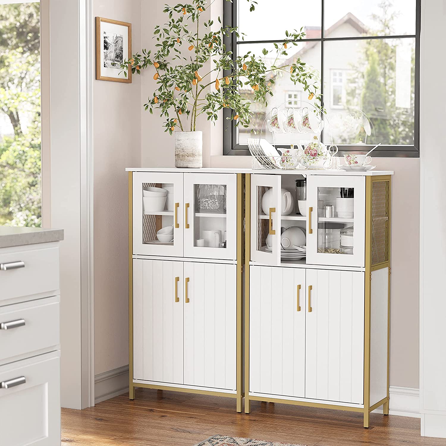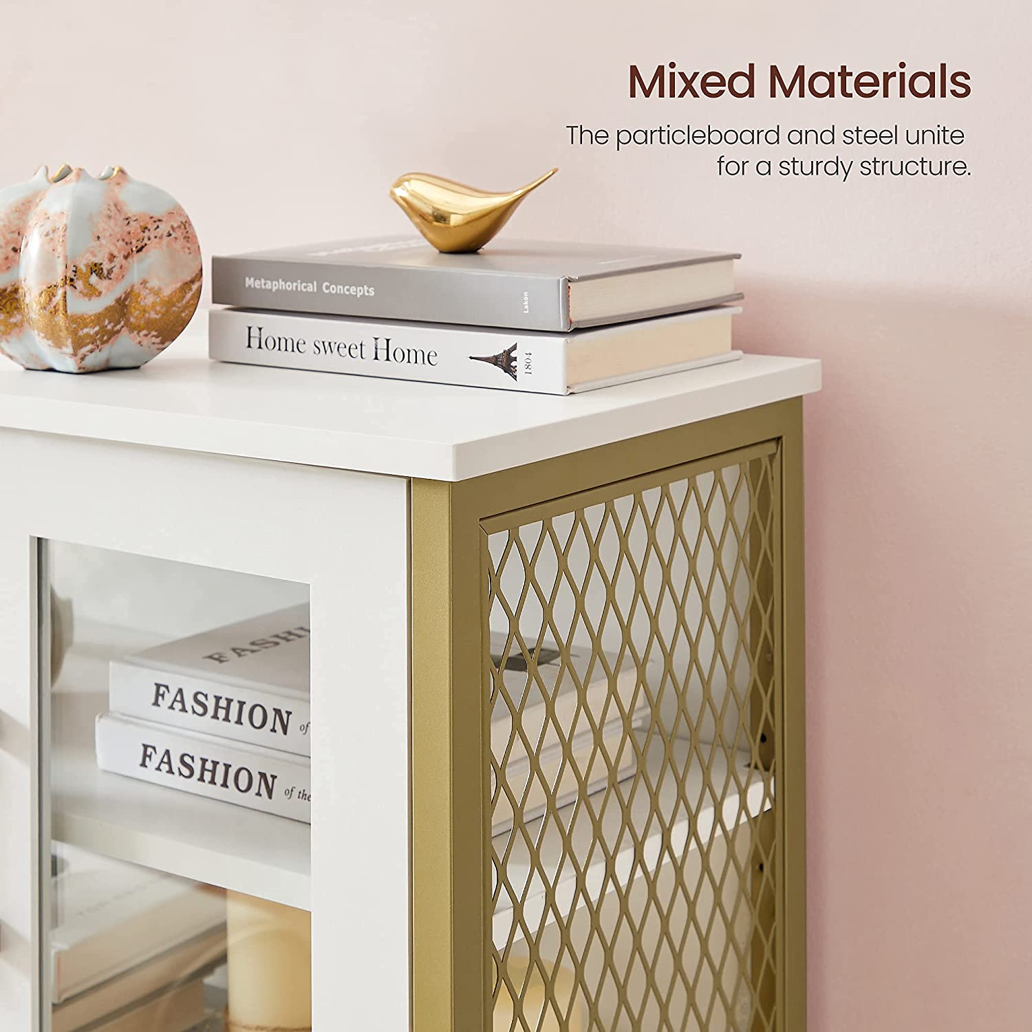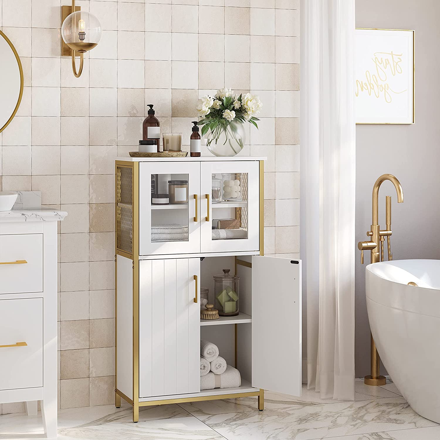 Product details: – Color: White-gold – Material: Chipboard, steel, glass – Dimensions: 60 x 30 x 108 cm (L x W x H) – Weight: 23.7 kg – Max. static load capacity of the top shelf: 30 kg – Max. static load capacity per shelf behind the doors: 5 kg Scope of delivery:- 1 x storage cabinet – 1 x anti-tip device – 1 x accessory pack – 1 x instructions VASAGLE Notes: – For safety reasons, children are not allowed to climb on or play with the product. – Please attach this product to the wall using the included anti-tip device to ensure safe use.