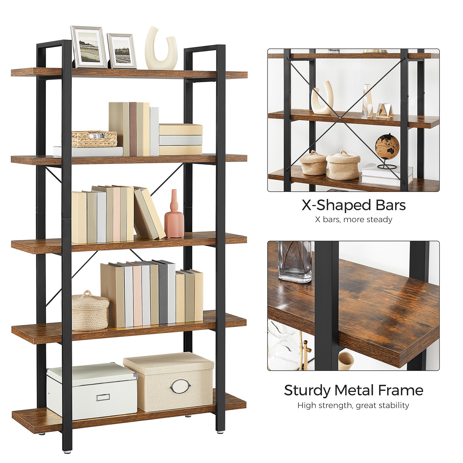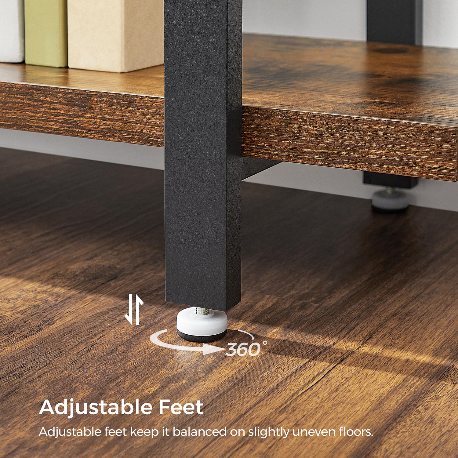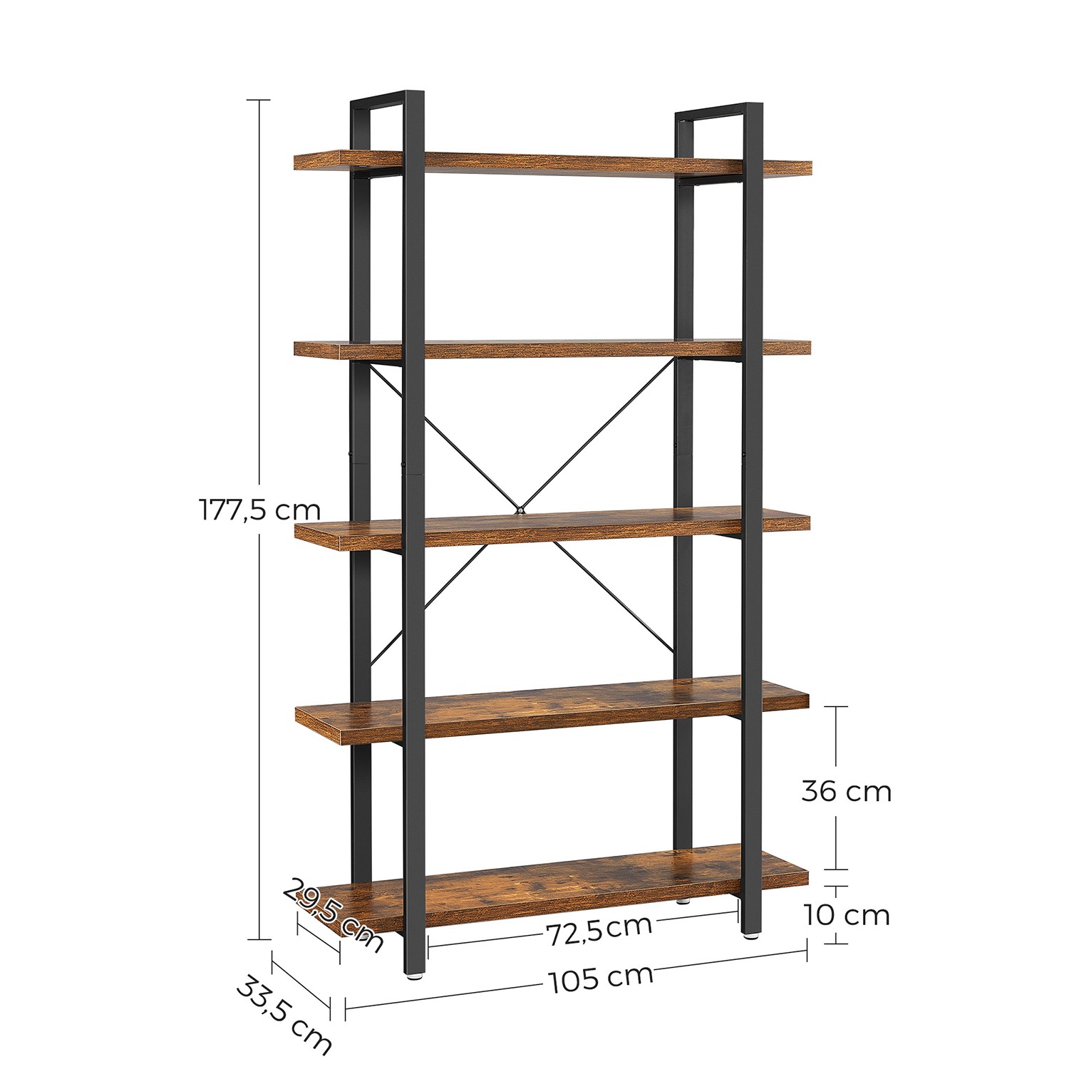 A touch of vintage here, a touch of industrial design there. The style of this living room shelf can be described as a combination of an iron frame with a trendy industrial look and precisely crafted vintage wood-based panels. The special design with wooden shelves protruding beyond the metal frame adds a unique touch.The result is an exciting look and a piece of furniture that is robust, attractive, and functional at the same time. Perfect for bookworms If you like to curl up on the couch or in bed with a good book on gray rainy days, or if you need to have helpful reference books at your fingertips in your office, this simple bookcase is just the thing. Five sturdy shelves provide plenty of space to neatly store thick tomes, romance novels, and encyclopedias. Add the finishing touches to this understated piece of furniture with plants, decorations, or picture frames!The sturdy freestanding shelf can also be combined perfectly with other furniture from the VASAGLE industrial design series! Product details: Color: Vintage brown-black Material: Chipboard, steel Size: 33.5 x 105 x 177.5 cm (D x W x H) Distance between individual shelves: 36 cm Weight: 21.5 kg Max. load capacity per shelf: 30 kg Scope of delivery: – 1 x bookshelf – 1 x container with accessories – 1 x Allen key – 1 x instructions (DE, EN, FR, ES, IT) VASAGLE notes: – Please place the product in a dry place indoors.- The maximum load capacity of a shelf level is 30 kg. Please do not place any heavier objects on the product. – Please use the anti-tip device provided.