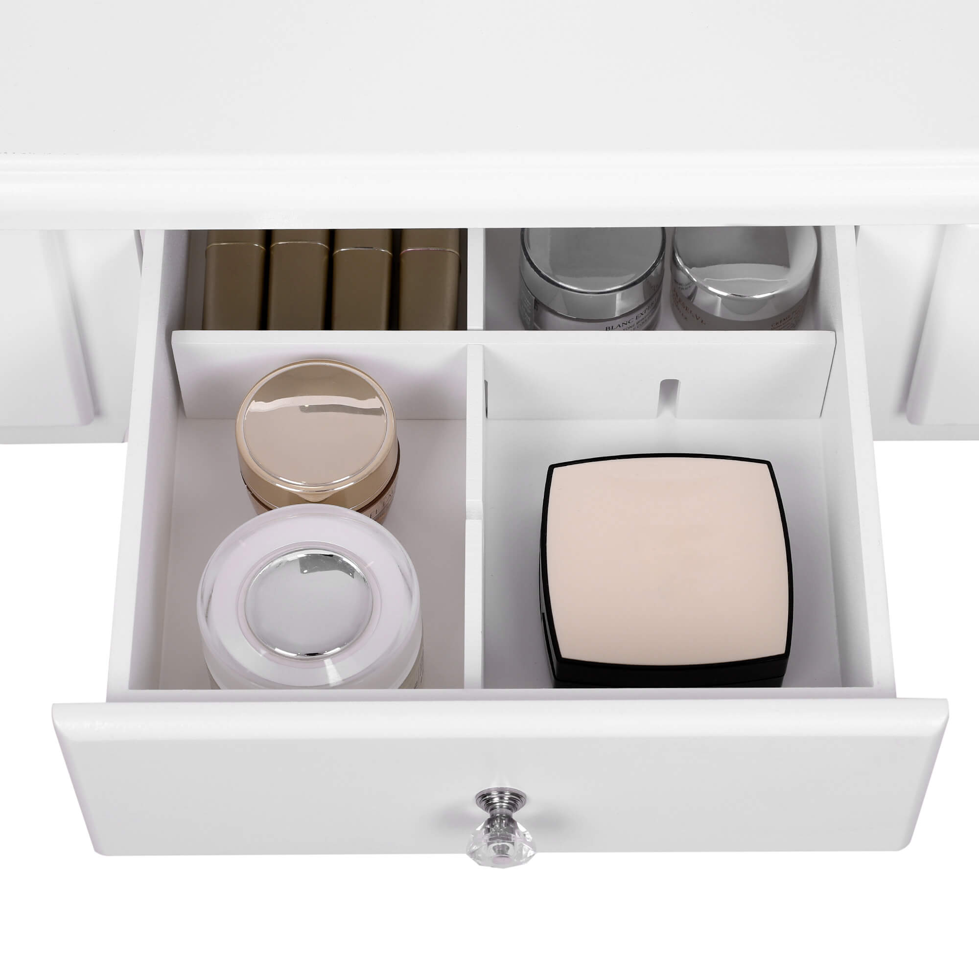 If you find yourself standing in front of a mountain of toiletries, makeup, makeup brushes, and other utensils in the morning, it’s time to get organized! With this dressing table, you can not only organize all your important accessories, but you also get your own beauty area that looks like it came straight out of a Hollywood movie. Not only will you look enchanting, but you’ll also start your day with energy and a gorgeous look. Get ready at this equally charming dressing table—the large, rectangular frameless mirror makes small or dark rooms appear larger and brighter. A decorative gem for your bedroom! Easy assembly Of course, we don’t want you to be annoyed with our products. That’s why we want to make the assembly process as easy as possible for you. Simply assemble the legs and the mirror – done! Product details: – Color: White – Material: MDF (medium-density fiberboard), pine wood (table legs), rubberwood (stool legs) – Table size: 80 x 40 x 137.5 cm (L x W x H) – Stool size: 37 x 28 x 45 cm (L x W x H) – Weight: 19 kg Scope of delivery: – 1 x dressing table – 1 x mirror – 1 x stool – 1 x container with screws – 1 x instructions (DE, EN, FR, ES, IT)