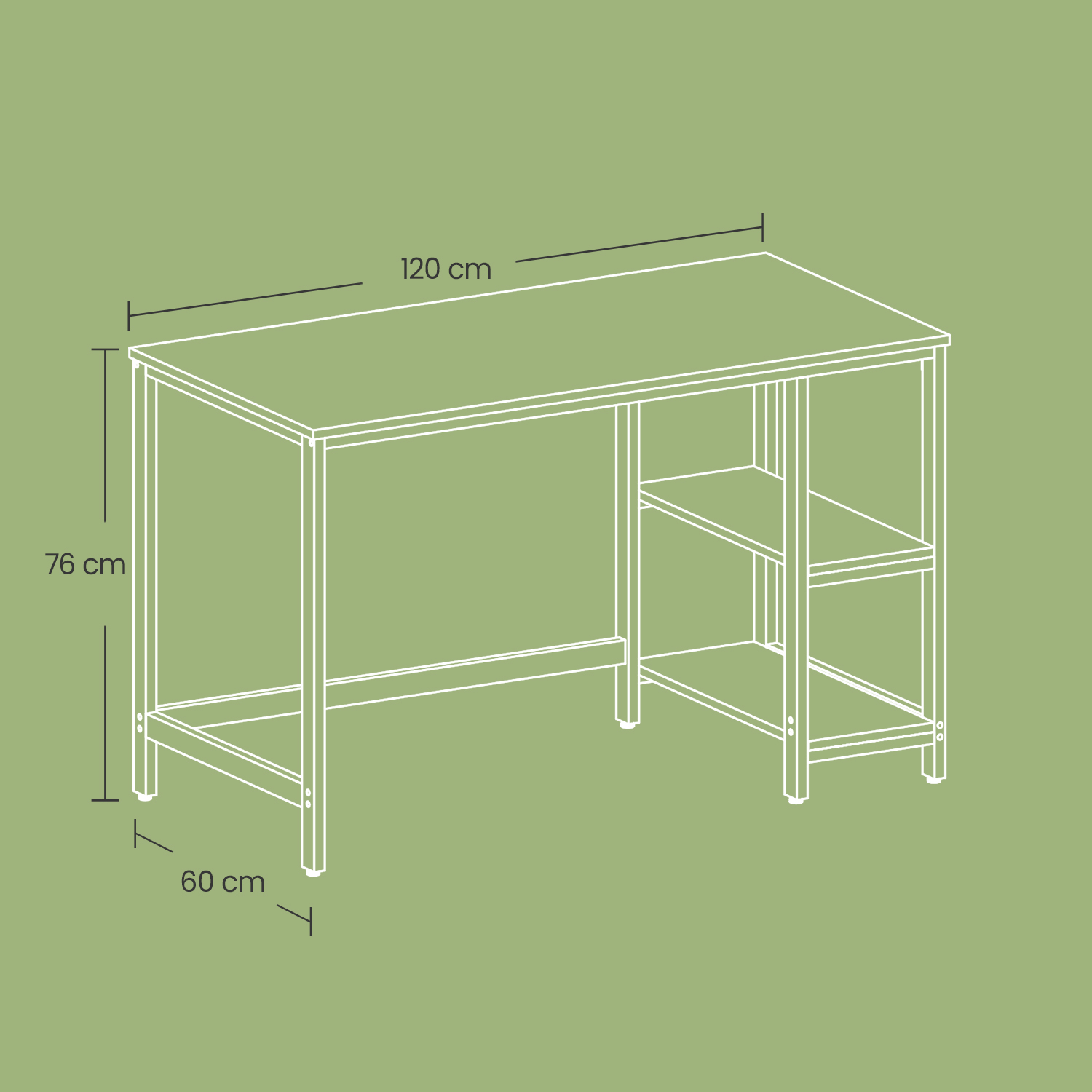 Be productive, but with style! Make your desk look as good as your work itself. Place this vintage table from VASAGLE in your office, bedroom, living room, study, or simply wherever you are most productive. The computer desk not only impresses with its stylish design, but also with its sturdy 1.2 mm thick iron frame and robust chipboard. Left or right? It’s up to you! This desk has two shelves that can be used on either the right or left side, depending on your preference! Simply turn the desk around and attach the crossbar to the bottom of the back. Place decorations, books, files, or important notes on it for quick and easy access. If you have a computer with an external drive, you can remove the upper shelf and place the drive on the lower shelf. Don’t worry about assembly. Our instructions are easy to understand and we provide the necessary tools. If you love the vintage design of this desk, take a look at the other products in the VASAGLE furniture series. Product details:Color: Vintage brown-black Material: Chipboard, steel Size: 60 x 120 x 75 cm (D x W x H) Weight: 18.8 kg Scope of delivery: 1 x desk 1 x accessory package 1 x instructions VASAGLE notes: For safety reasons, children are not allowed to climb on or play with the product.