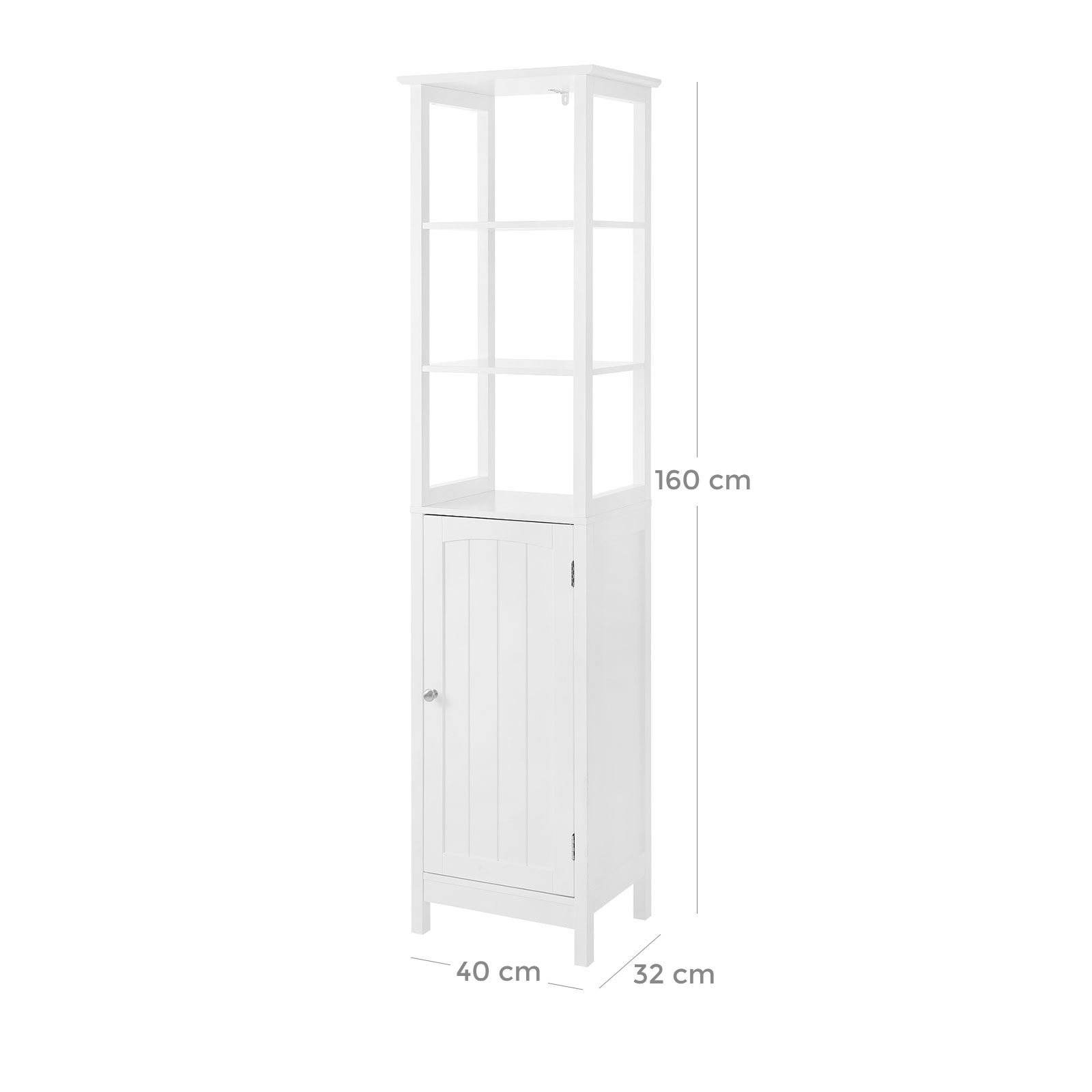Are you regularly annoyed by the chaos in your bathroom, living room, hallway, or kitchen? Then this tall cabinet from VASAGLE is just what you need. With the help of this gem, your annoyance will surely vanish into thin air. A decorative element for your home Thanks to its white lacquer finish, this country-style cabinet looks elegant and attractive. It therefore serves not only as a piece of furniture, but also as a stylish decorative element. Well-thought-out design The cabinet door can be swiveled 180° and is equipped with a chrome-plated metal handle, making it particularly easy to open. The shelf inside the cabinet can also be adjusted to 3 different heights, so you can adapt it to the size of various products as needed and protect them optimally from dust or water. 3 open compartments also offer space for additional toiletries, towels, makeup, storage boxes, and many other bathroom accessories. Product details: – Color: White – Material: MDF (medium-density fiberboard) – Dimensions: 40 x 32 x 160 (L x W x H) – Weight: 15.9 kg Scope of delivery: – 1 x tall cabinet – 1 x accessory bag – 1 x instructions (DE, EN, IT, FR, ES)