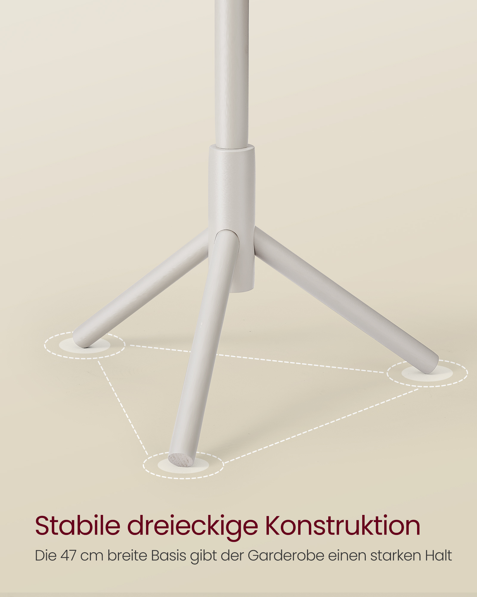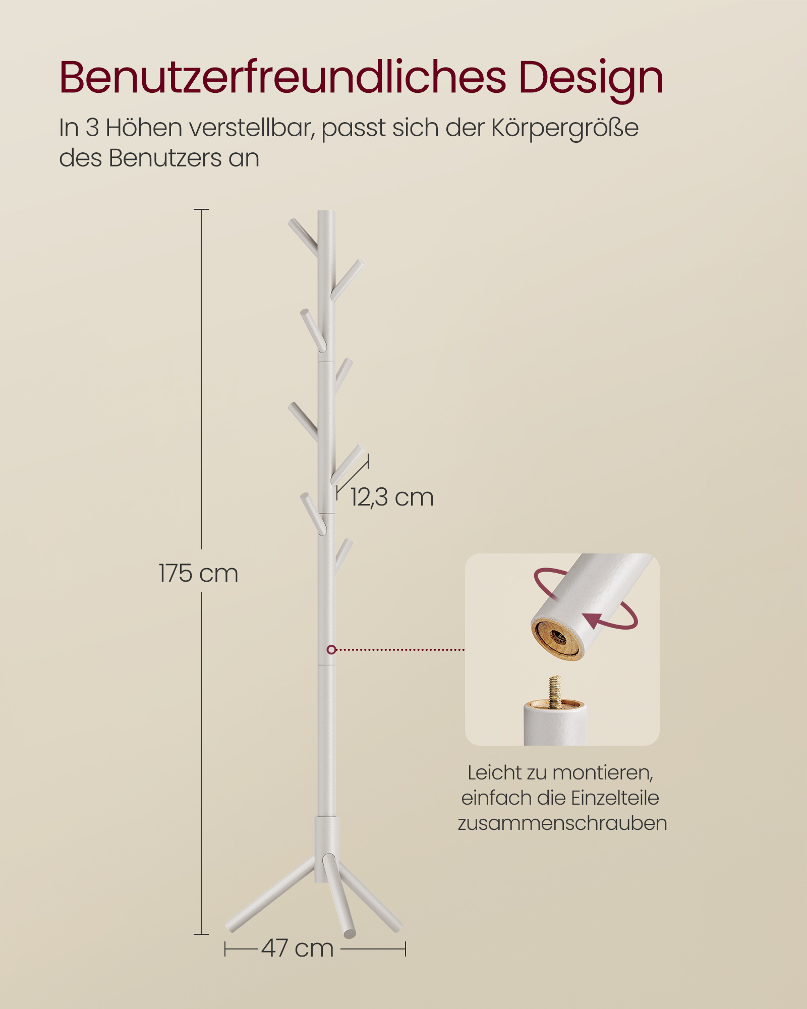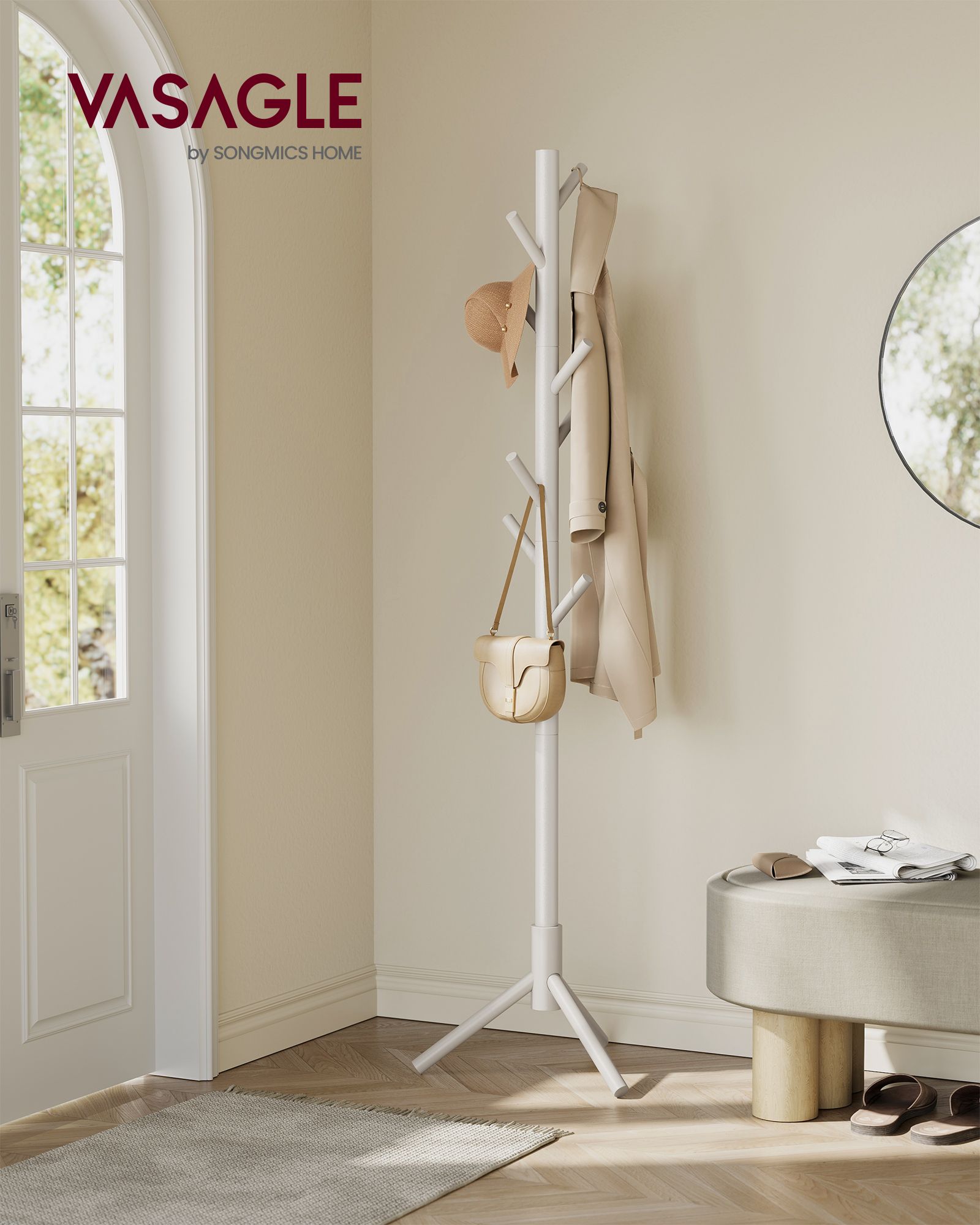 VASAGLE coat rack, free-standing coat stand, solid wood coat rack, tree-shaped, with 8 hooks, for clothes, hats, bags, hallway, entrance area, white RCR04WT