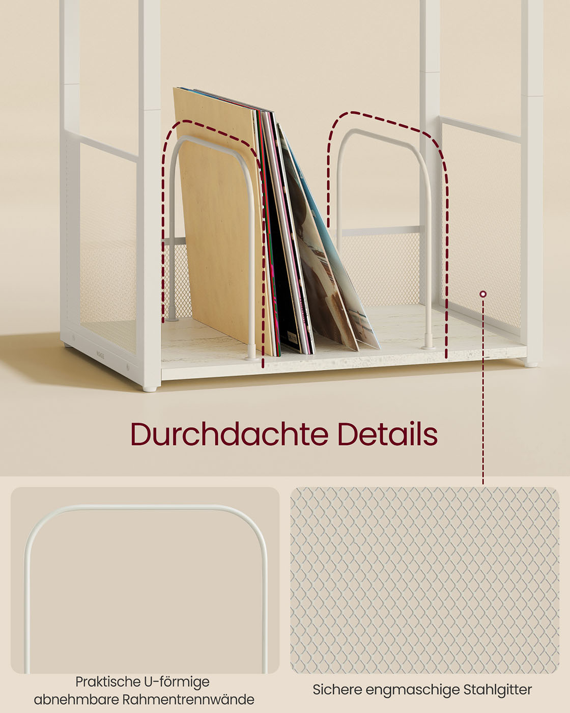 VASAGLE record player stand, 3 shelves, side table, record storage, up to 100 albums, table for living room, bedroom, vintage white LET275W01