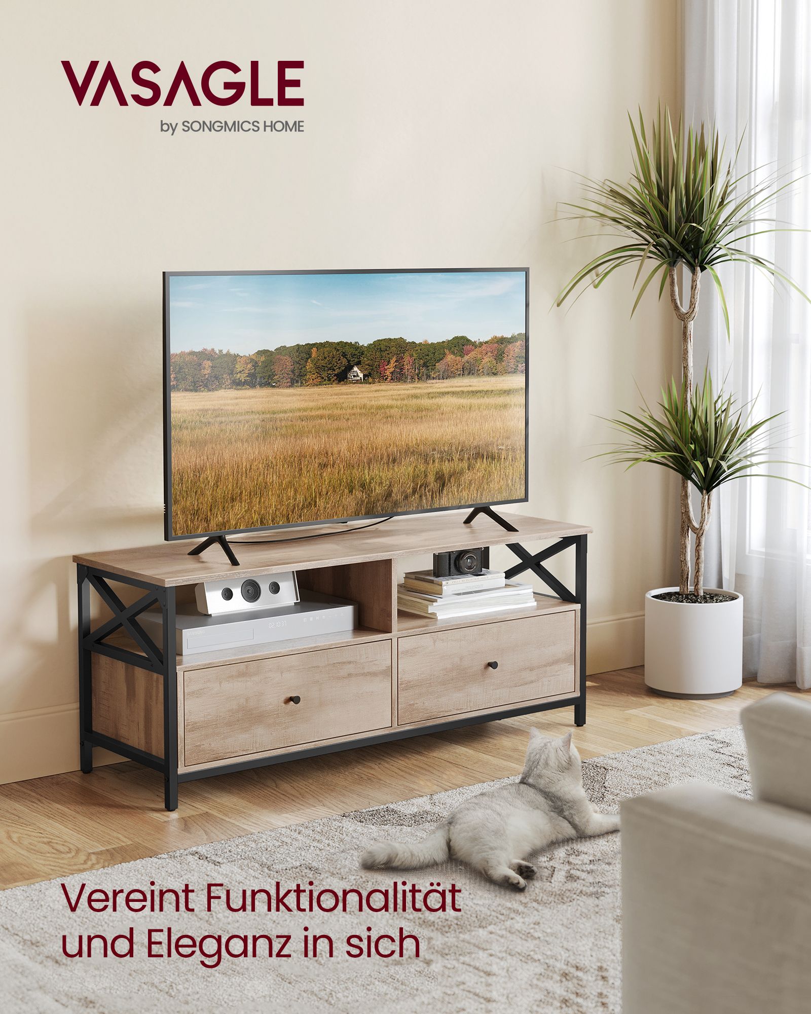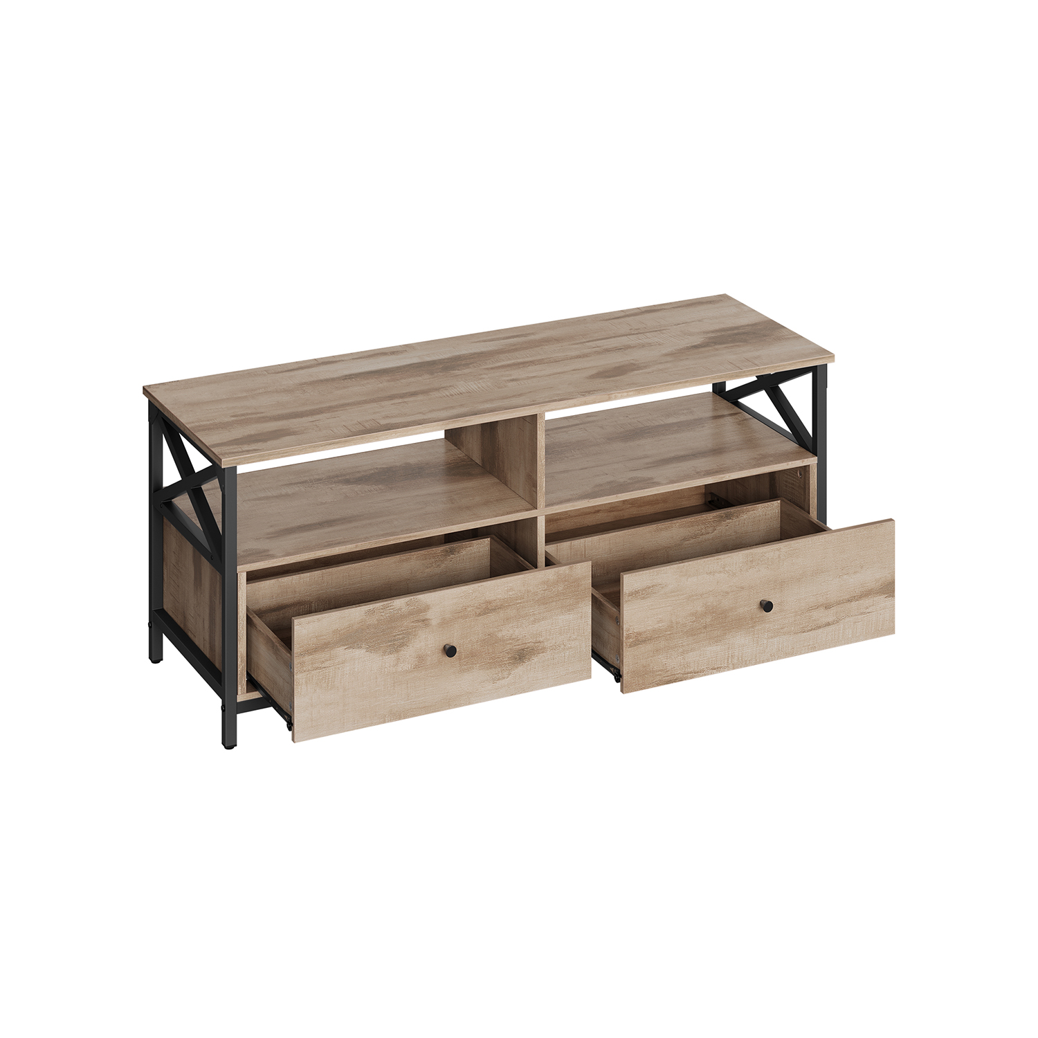 VASAGLE TV cabinet, TV stand, lowboard for TVs up to 55 inches, with 2 drawers, 2 open compartments, 120 x 40 x 50 cm, for living room, steel frame, vintage brown-black LTV300B01