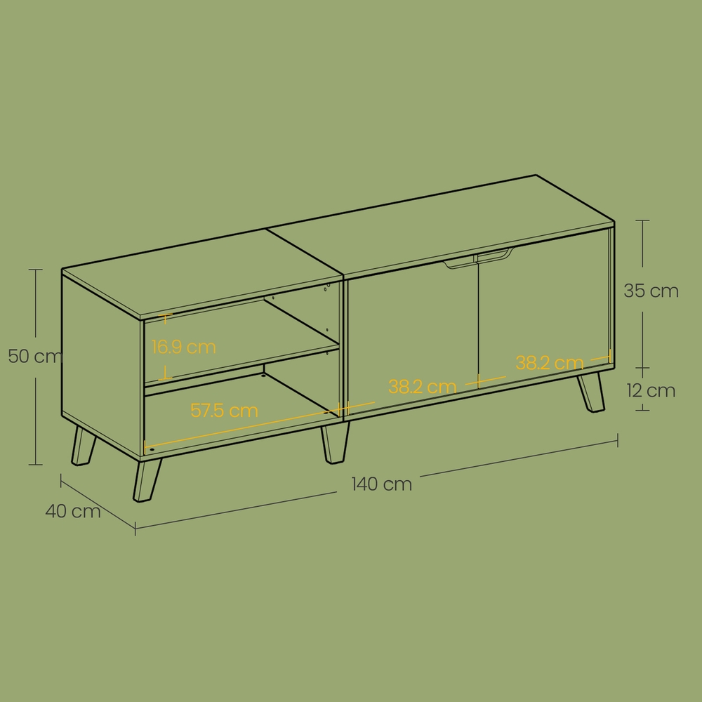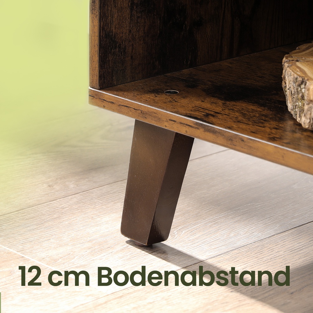 What’s on your schedule? Watching movies with your family in the living room on the weekend? How about spending a quiet movie night in the living room? However you like to spend your free time, this TV cabinet will be right there with you. Let’s reveal a secret! Want to know what’s behind the magnetic door? Okay, I’ll tell you: 2 height-adjustable shelves. By the way, the shelf on the left side of the cabinet is also adjustable! Season after season! This cabinet is made of high-quality, sturdy chipboard and will be by your side for many seasons to come. Now you can enjoy your favorite series in comfort.Product details: Color: Vintage brown Material: Chipboard Size: 140 x 40 x 50 cm (L x W x H) Weight: 26.2 kg Max. static load capacity: 50 kg Scope of delivery: 1 x TV cabinet 1 x accessory package 1 x instructions (DE, EN, FR, ES, IT)