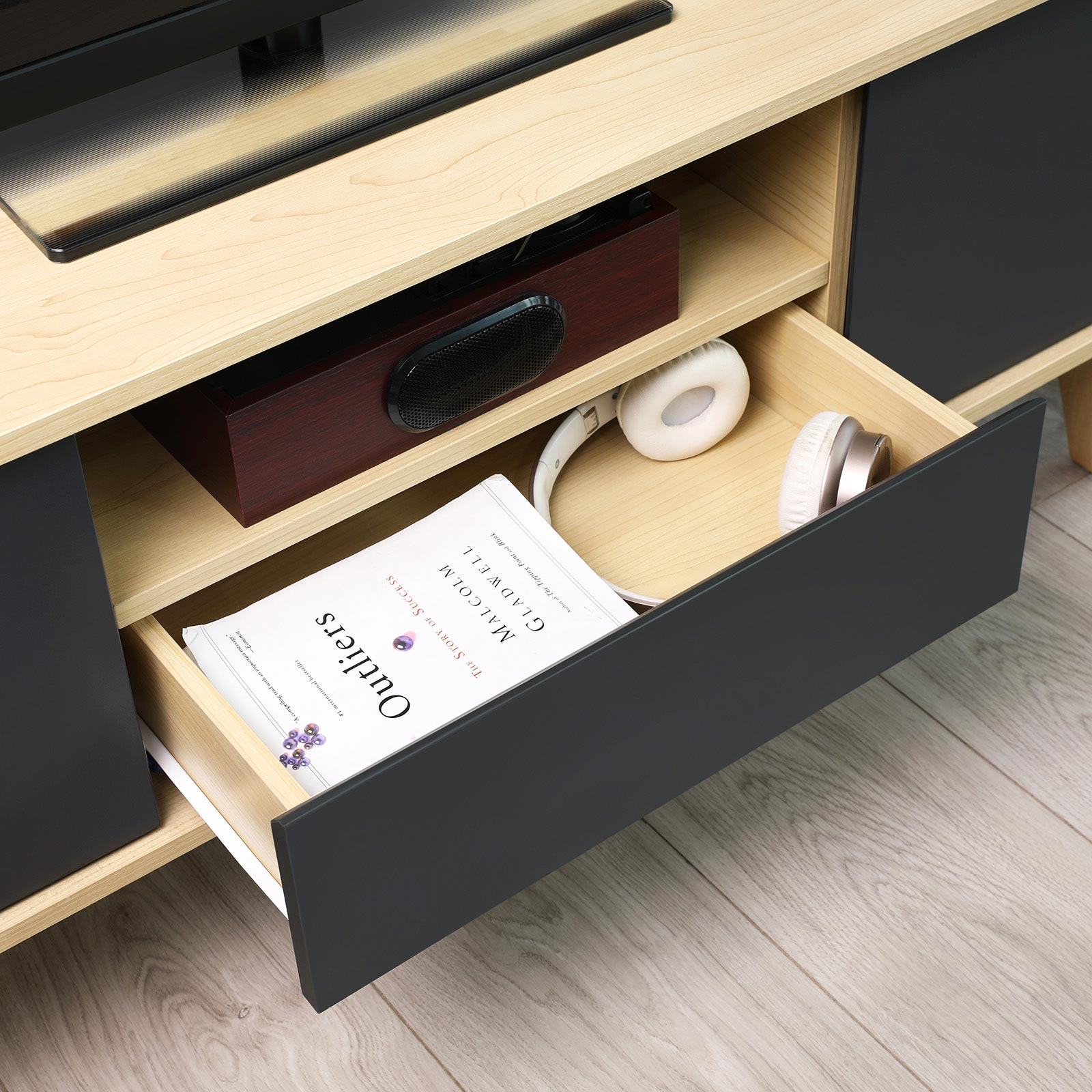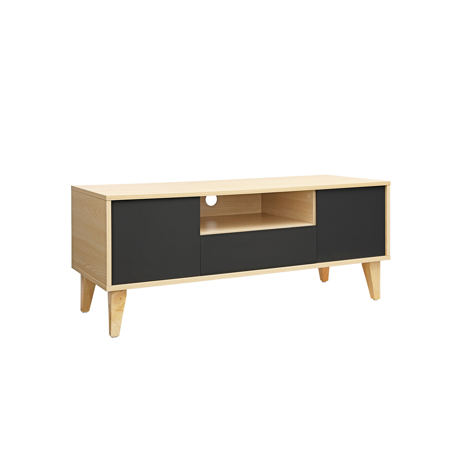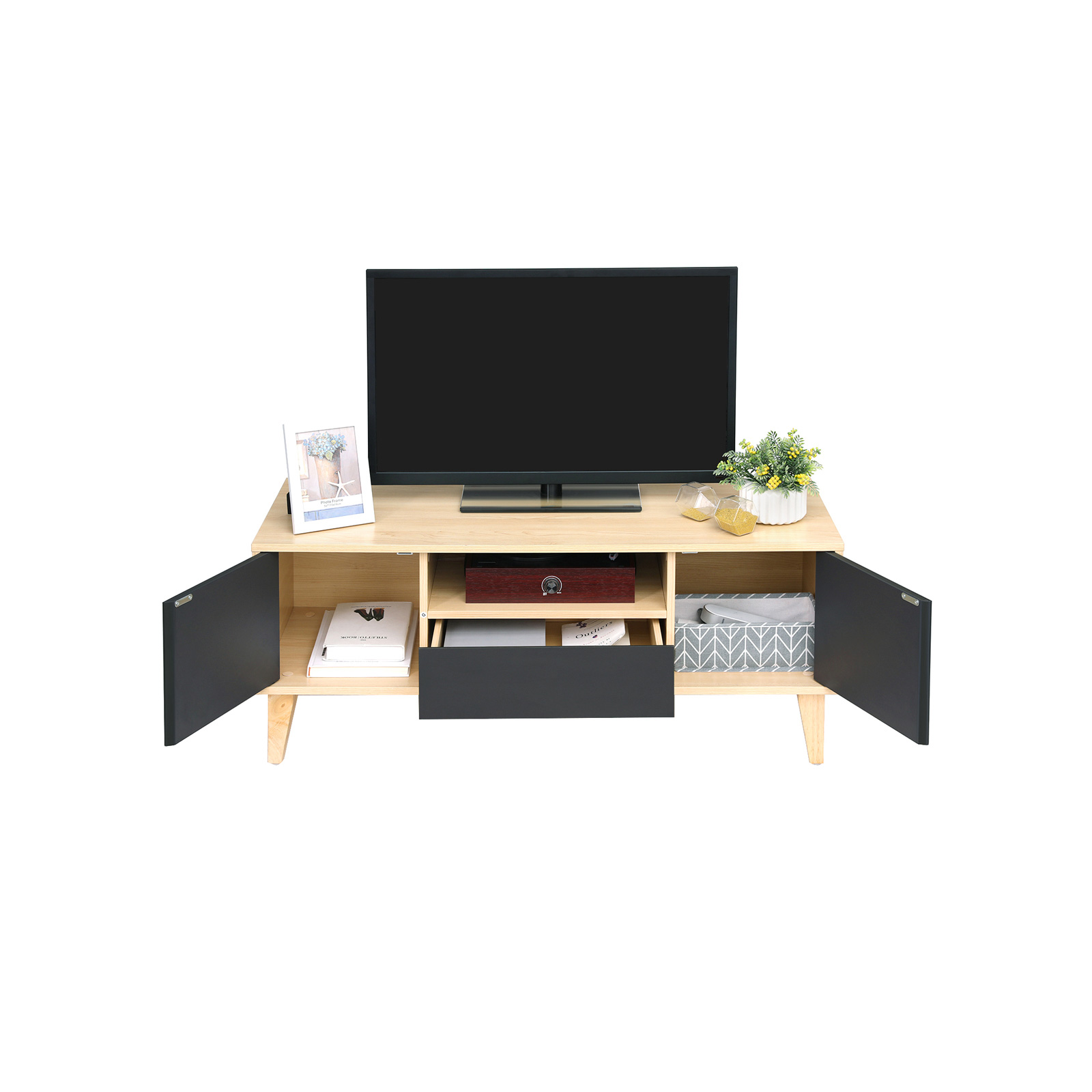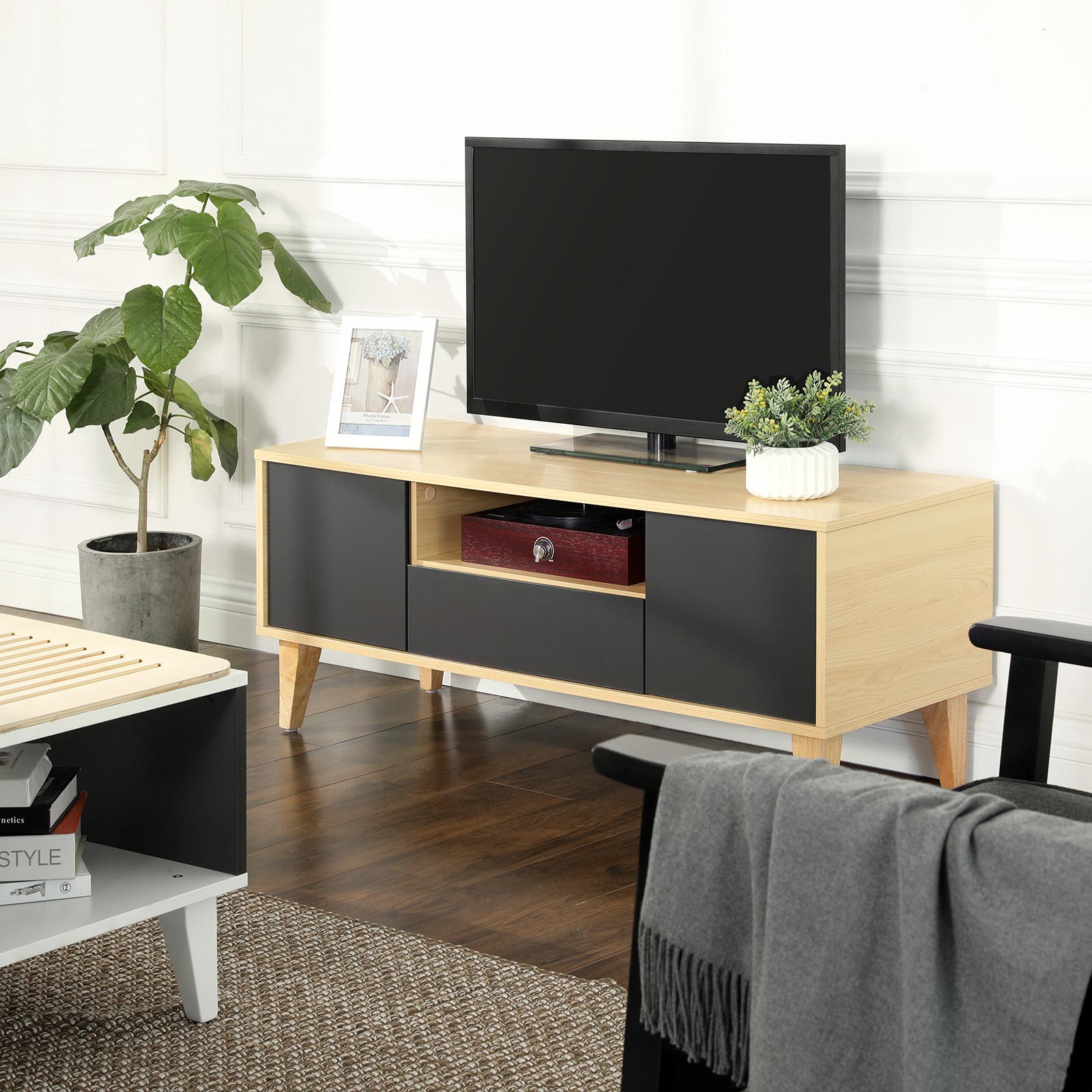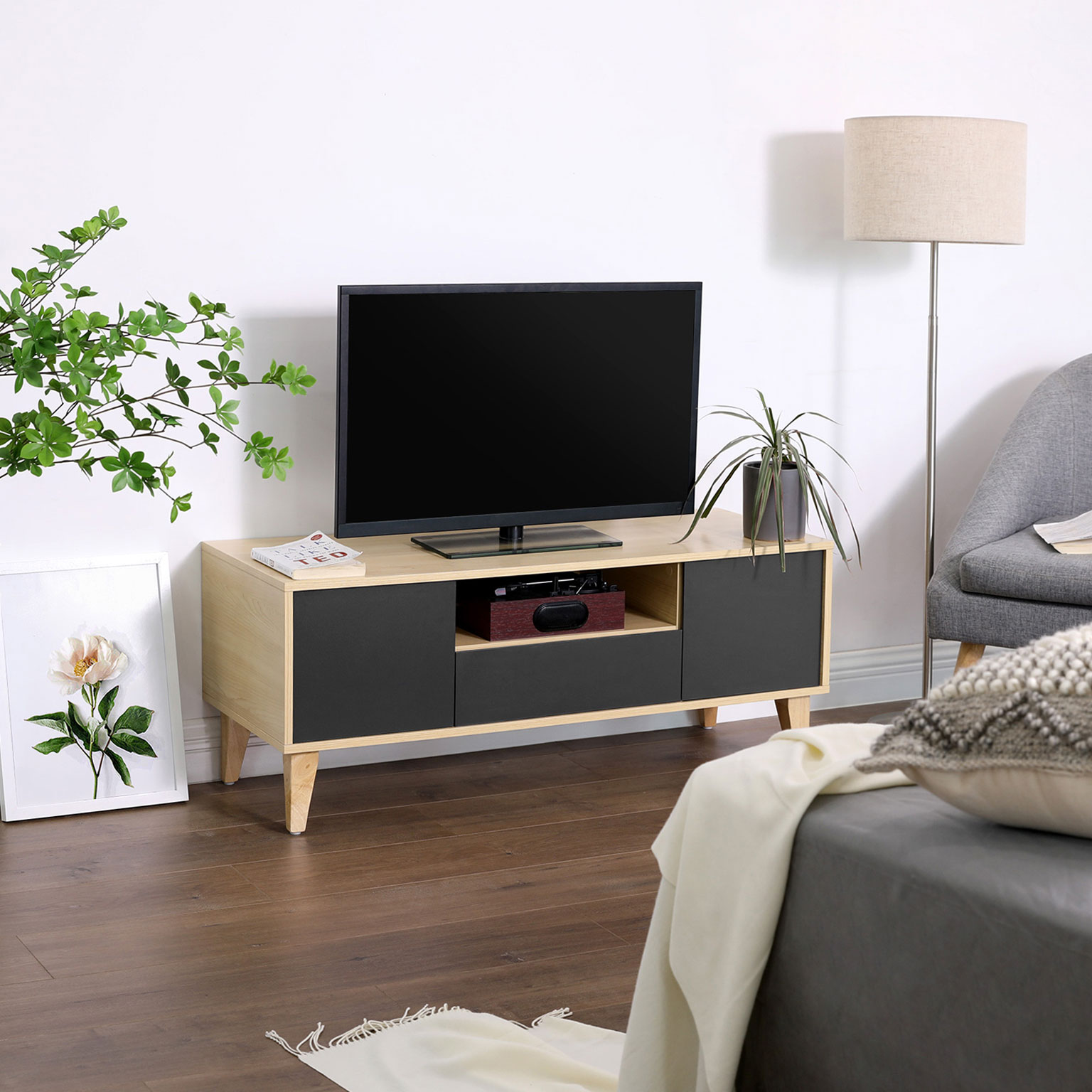 In addition to everyday and, above all, practical creations, the designers at VASAGLE are always coming up with unique pieces of furniture that stand out thanks to their unique shapes or creative color combinations. This modern TV bench in Scandinavian style will impress you with its high-quality materials and unique design. Watch TV in style Invite your friends over on Sunday afternoon and watch your favorite series together. With its warm colors and geometric lines, this TV table is the ideal accessory for relaxing in an inviting environment.Everything under control Thanks to the large tabletop, you can place either a large TV or a smaller device, as well as candles and picture frames, on the lowboard. Two small cabinets, a drawer, and an open shelf ensure that the area around your TV always looks tidy. Product details:- Color: wood-effect gray – Material: chipboard, solid wood legs – Size: 110 x 40 x 45 cm (L x W x H) – Weight: 20.5 kg – Max. static load capacity: 30 kg Scope of delivery:- 1 x TV table – 1 x accessory bag with assembly tools – 1 x instructions (DE, EN, ES, FR, IT) VASAGLE notes: – Children are not allowed to climb on or play with the product. Also keep children away from the sharp corners of the table. – Please assemble the product strictly according to the instructions. – The product should not come into contact with water. – Please keep sharp or pointed objects away from this product to avoid damage to the surface.