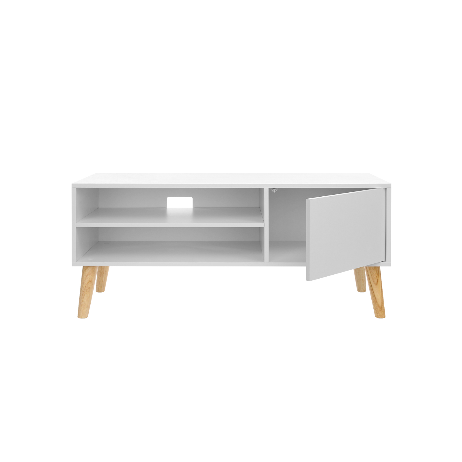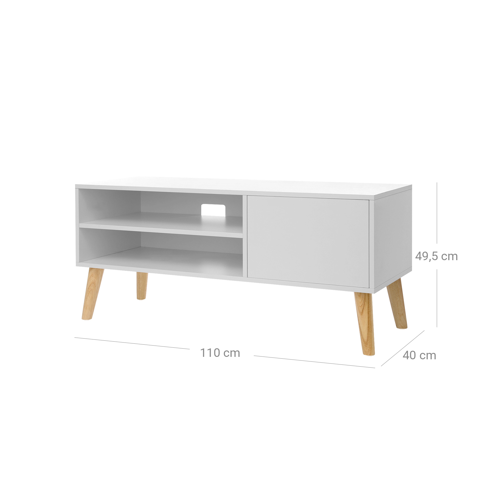 Scandinavian-style furniture There is a reason why Scandinavian-style furniture is so popular: it always looks great, no matter where you put it.This lowboard fits in with numerous interior styles and looks great in your living room, bedroom, or office. With 2 shelf levels, a cabinet door that opens with light pressure to reveal even more storage space, and a large table surface, this TV shelf offers plenty of space for your TV, game consoles, cable boxes, and many other items.Proven VASAGLE quality This TV cabinet is made of chipboard and can hold up to 50 kg. The slanted legs are made of rubberwood, which makes them extra stable. They are attached to the body of the TV stand with sturdy screws and wooden dowels, so they always stay in place and provide excellent support.If you like this Scandinavian-style TV stand, you should also check out the other matching furniture from VASAGLE! Product details: – Color: white-natural color – Material: chipboard, rubberwood – Size: 110 x 40 x 49.5 cm (L x W x H) – Weight: 17.4 kg – Max. static load capacity: 50 kg Scope of delivery: – 1 x TV table – 1 x container with accessories – 1 x instructions (DE, EN, FR, ES, IT) VASAGLE notes: – Please keep children away from the corners of the table, as this could result in injury. – Please lift the table when moving it. Do not drag it across the floor. – Please do not press too hard on the cabinet door, as this could cause damage.