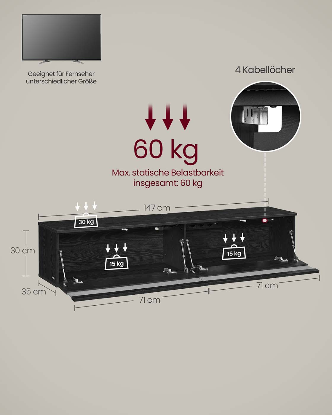 Max. static load capacity of the top panel: 30 kg