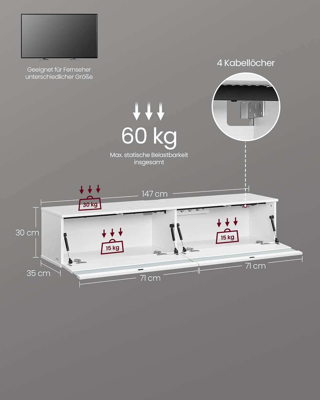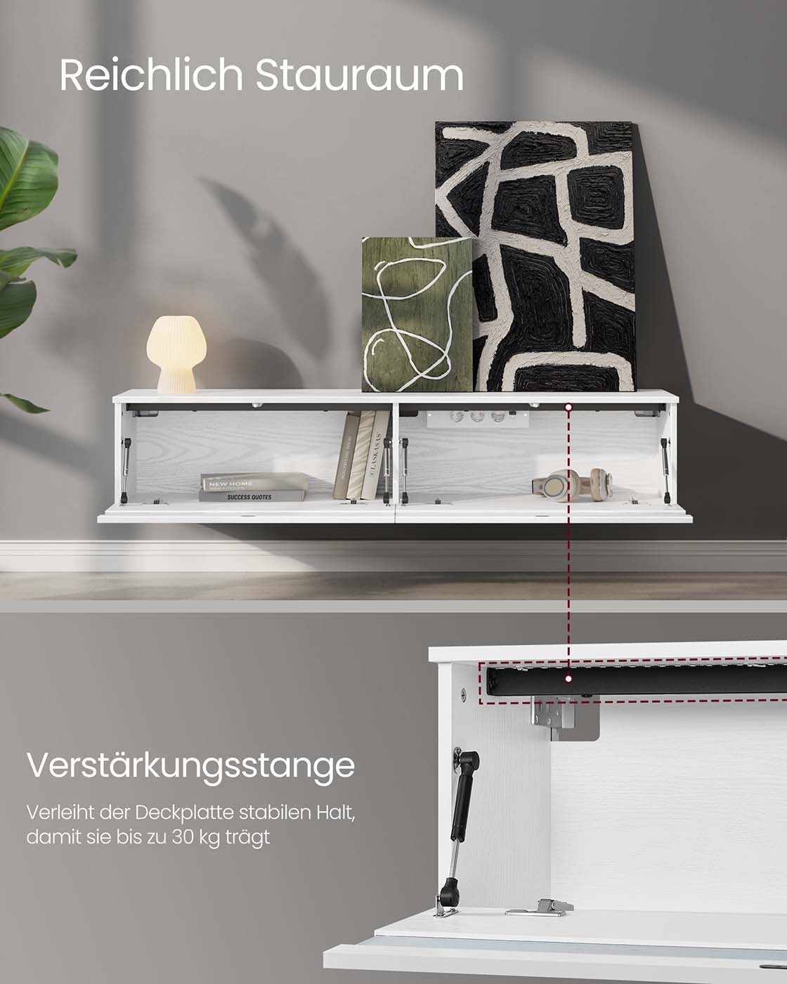 VASAGLE TV lowboard, wall-mounted TV board, wall cabinet, for various TVs, TV table, for living room, modern, 147 x 35 x 30 cm, ebony black LTV133B02