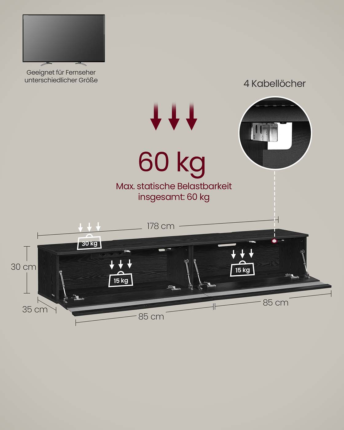 Max. static load capacity of the top panels in total: 30 kg