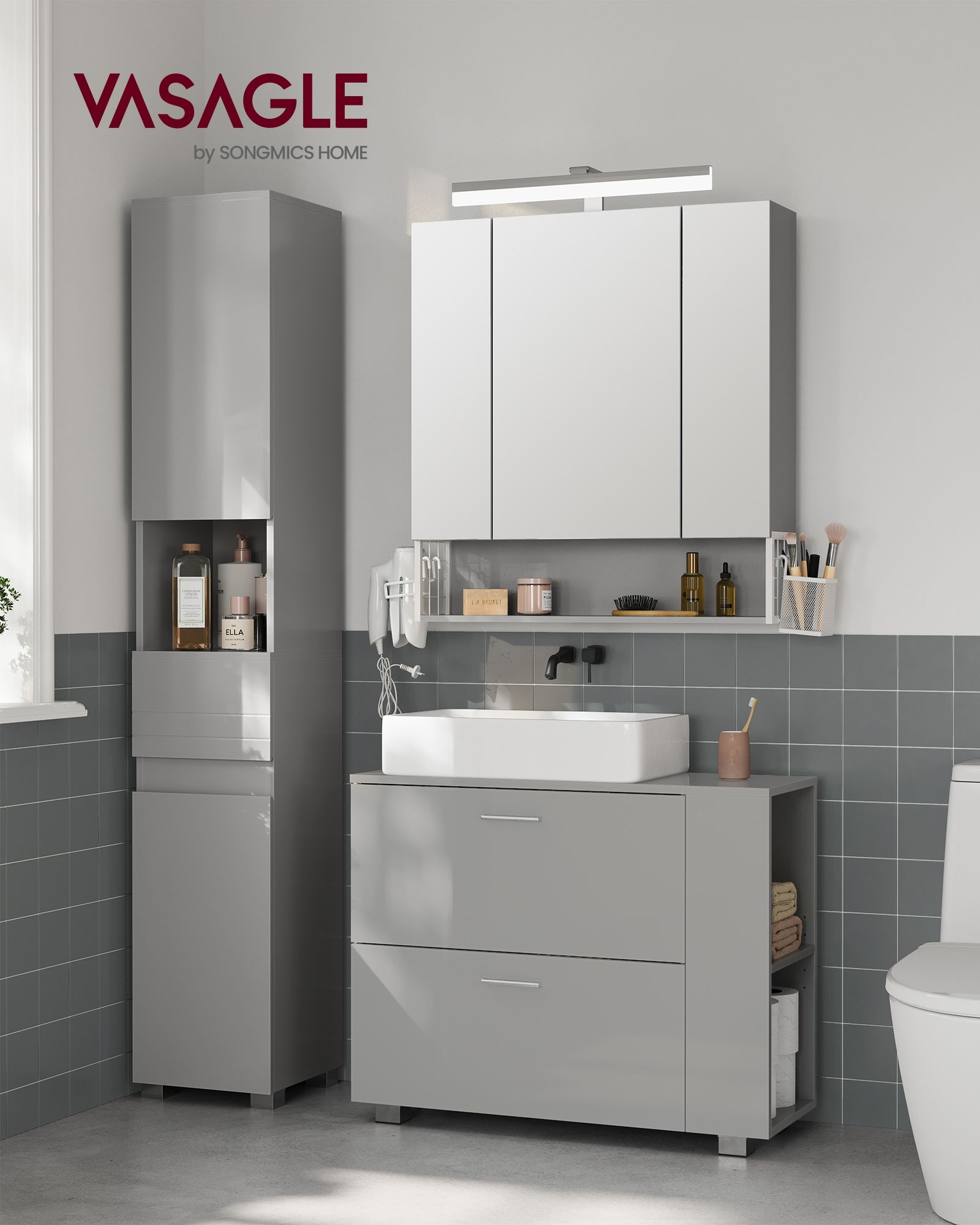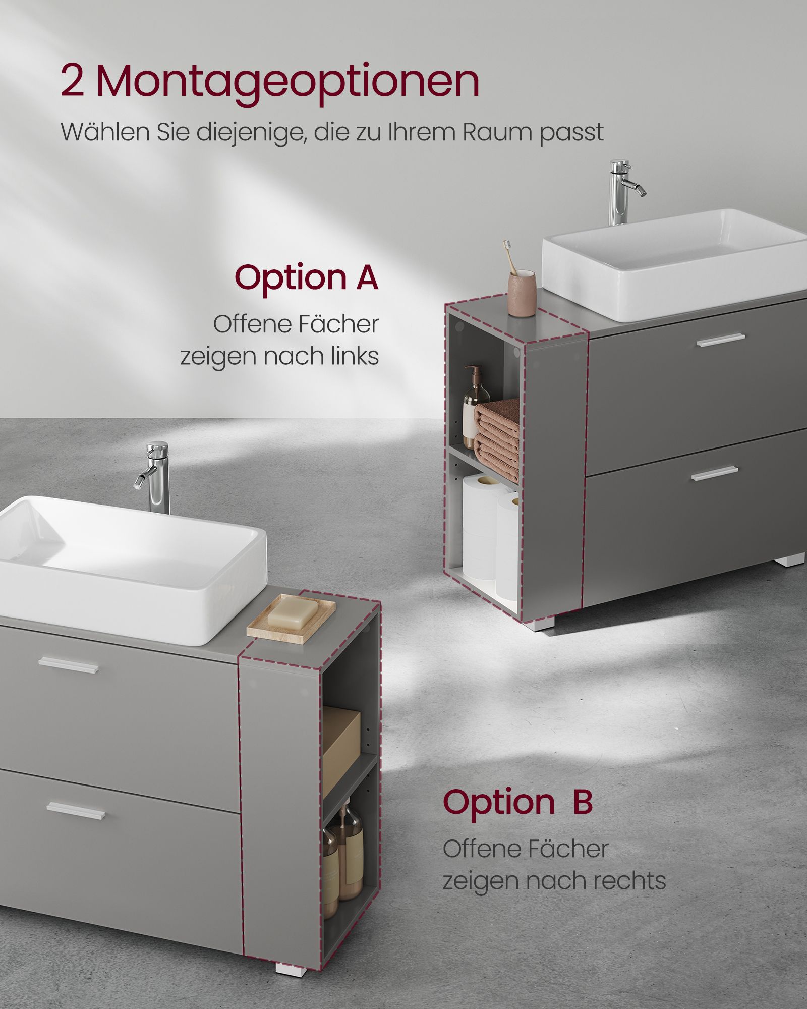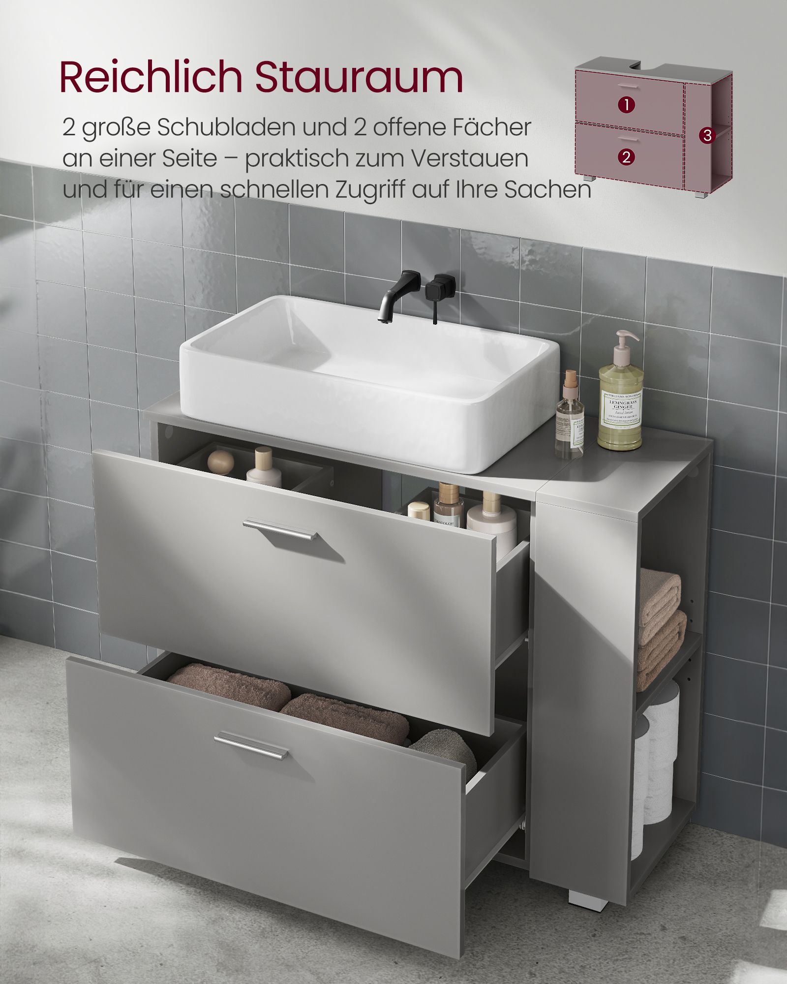 VASAGLE washbasin cabinet, open compartments on one side, interchangeable on the right or left, bathroom cabinet, large opening for siphons, 30 x 80 x 64 cm