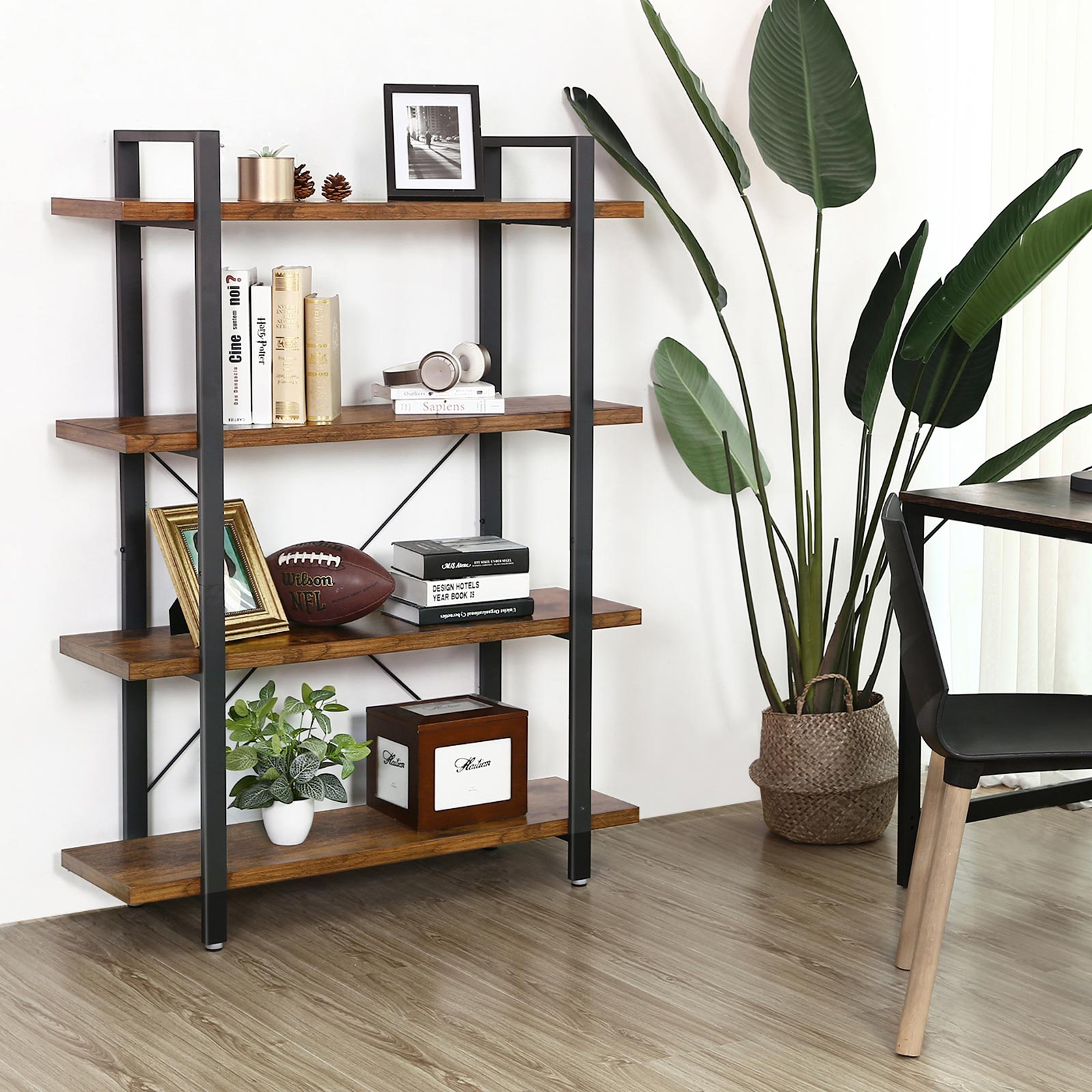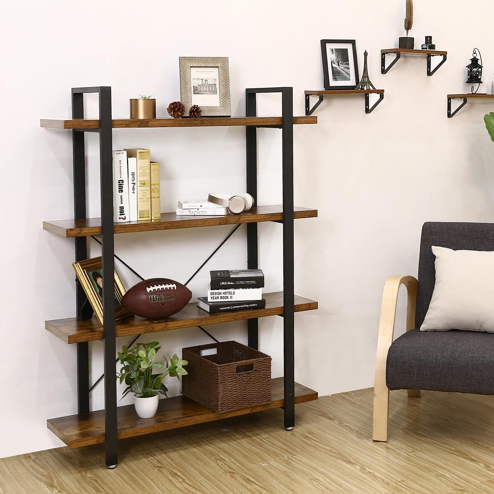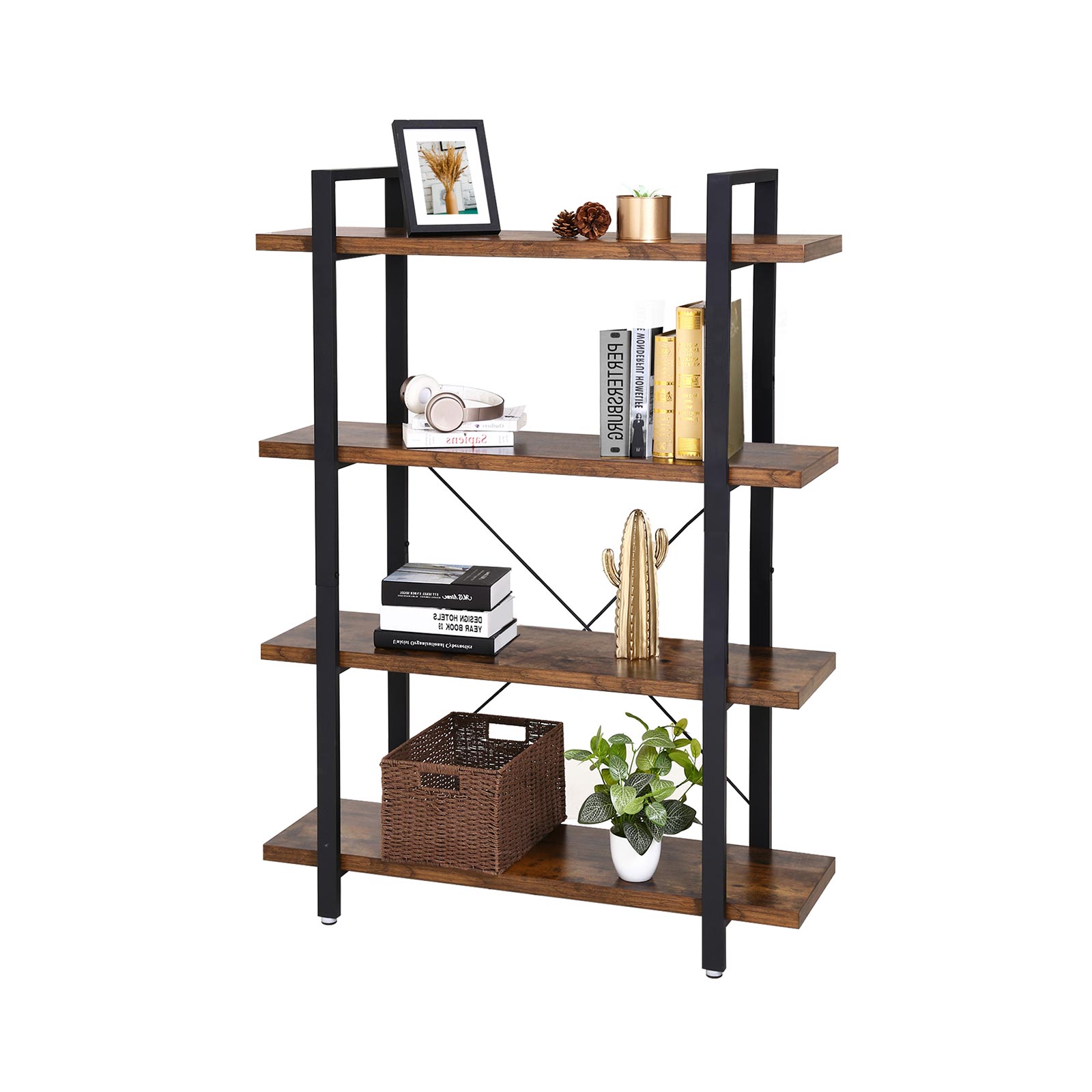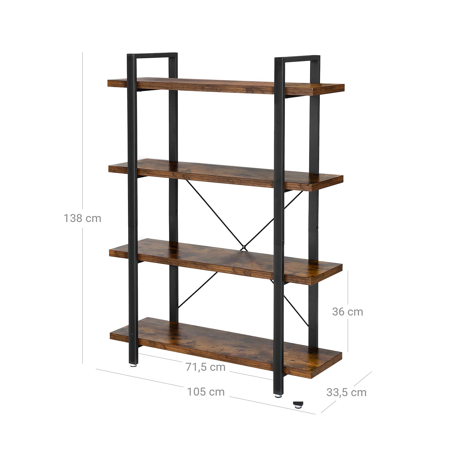 A touch of vintage here, a touch of industrial design there The style of this living room shelf can be described as a composition of an iron frame with a trendy industrial look and precisely crafted vintage wood-based panels. The special design with wooden shelves protruding beyond the metal frame adds a very special touch. This creates an exciting look and a piece of furniture that is robust, attractive, and functional at the same time. Perfect for bookworms If you like to curl up on the couch or in bed with a good book on gray rainy days, or if you need to have helpful reference books at your fingertips in your office, this simple bookshelf is just the thing. Four sturdy shelves provide plenty of space to neatly store thick tomes, romance novels, and encyclopedias. Add the finishing touches to this understated piece of furniture with plants, decorations, or picture frames! The sturdy standing shelf can also be combined perfectly with other furniture from the VASAGLE industrial design series! Product details: – Color: Vintage – Material: Chipboard, iron frame – Size: 105 x 33.5 x 138 cm (L x W x H) – Distance between shelves: 35 cm – Weight: 25 kg – Max. Load capacity per shelf: 30 kg Scope of delivery: – 1 x bookshelf – 1 x container with accessories – 1 x Allen key – 1 x instructions (DE, EN, FR, ES, IT) VASAGLE notes: – Please place the product in a dry place indoors. – The maximum load capacity of a shelf is 30 kg. Please do not place any heavier items on the product. – Please use the included anti-tip device.