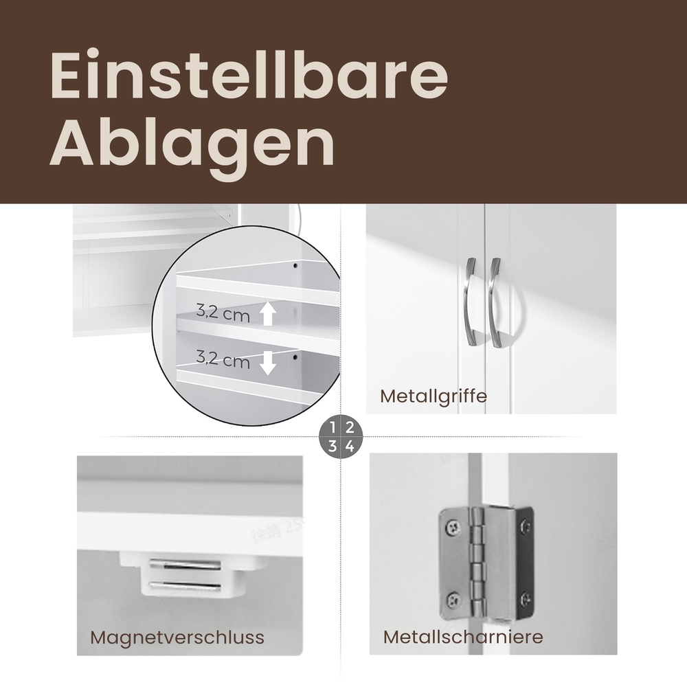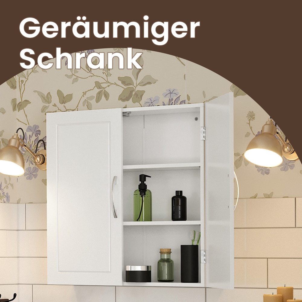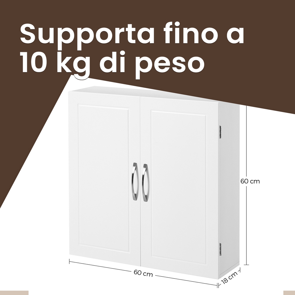 How can you save space in the bathroom? With this wall cabinet! Is your bathroom too small to store extra makeup? No need to worry! This wall cabinet, which takes up no floor space, expands the limited space in your bathroom. Put all your skincare items in it and get your bathroom clutter under control. How can you keep your bathroom clean? With this wall cabinet too! Tired of playing hide and seek with your comb? Do you keep tripping over the shower gel bottles on the floor? Keep all your toiletries neatly organized in this bathroom cabinet with 2 shelves (adjustable to 3 heights) and keep your bathroom tidy at all times. What’s more, the 2 doors keep all your items clean and dust-free. Perfect! Product details: – Color: Matte white – Material: E1-grade MDF (medium-density fiberboard) – Size: 60 x 18 x 60 cm (L x W x H) – Weight: 10 kg – Max. total static load capacity: 10 kg Scope of delivery:- 1 x bathroom cabinet – 1 x accessory pack – 1 x instructions (DE, EN, FR, ES, IT) VASAGLE notes: – For safety reasons, children are not allowed to climb on or play with the product.