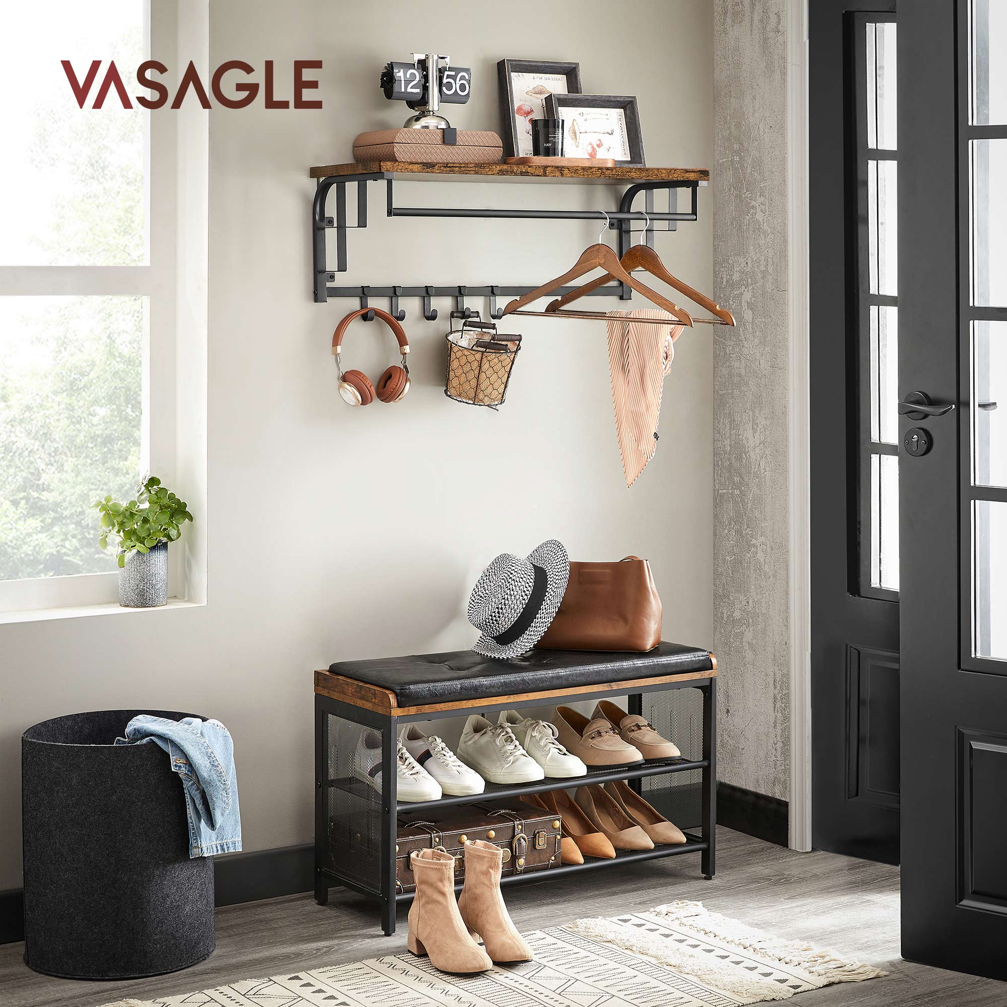 Product details: Color: Greige-black Material: Chipboard, steel Dimensions: 80 x 30 x 27 cm (L x W x H) Weight: 3.3 kg Max. load capacity of shelf: 15 kg Max. load capacity per hook: 3 kg Max. load capacity of hanging rod: 10 kg Scope of delivery: 1 x wall coat rack 1 x accessory package 1 x instructions (DE, EN, FR, ES, IT) VASAGLE Notes: A screwdriver, spirit level, drill, and hammer are required for assembly.