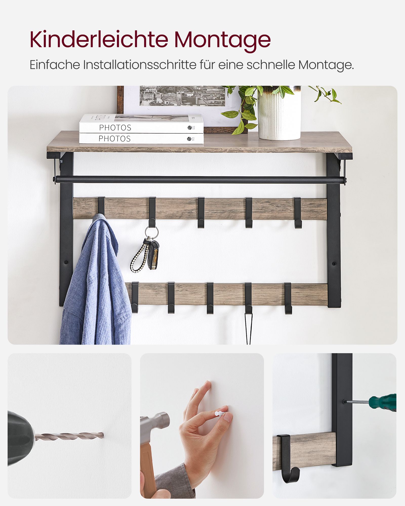 Product details: – Color: Greige-black – Material: Chipboard, steel – Overall size: 30 x 65 x 42 cm (D x W x H) – Shelf size: 30 x 65 x 1.5 cm (D x W x H) – Weight: 3.7 kg – Max. static load capacity of the shelf: 16 kg – Max. static load capacity per hook: 4 kg – Max. static load capacity of the clothes rail: 20 kg Scope of delivery: – 1 x wall coat rack – 1 x accessory pack – 1 x instructions VASAGLE Notes:- Please mount the product on a solid wall. If you want to mount it on a plasterboard wall, you must first purchase special screws from a specialist retailer.