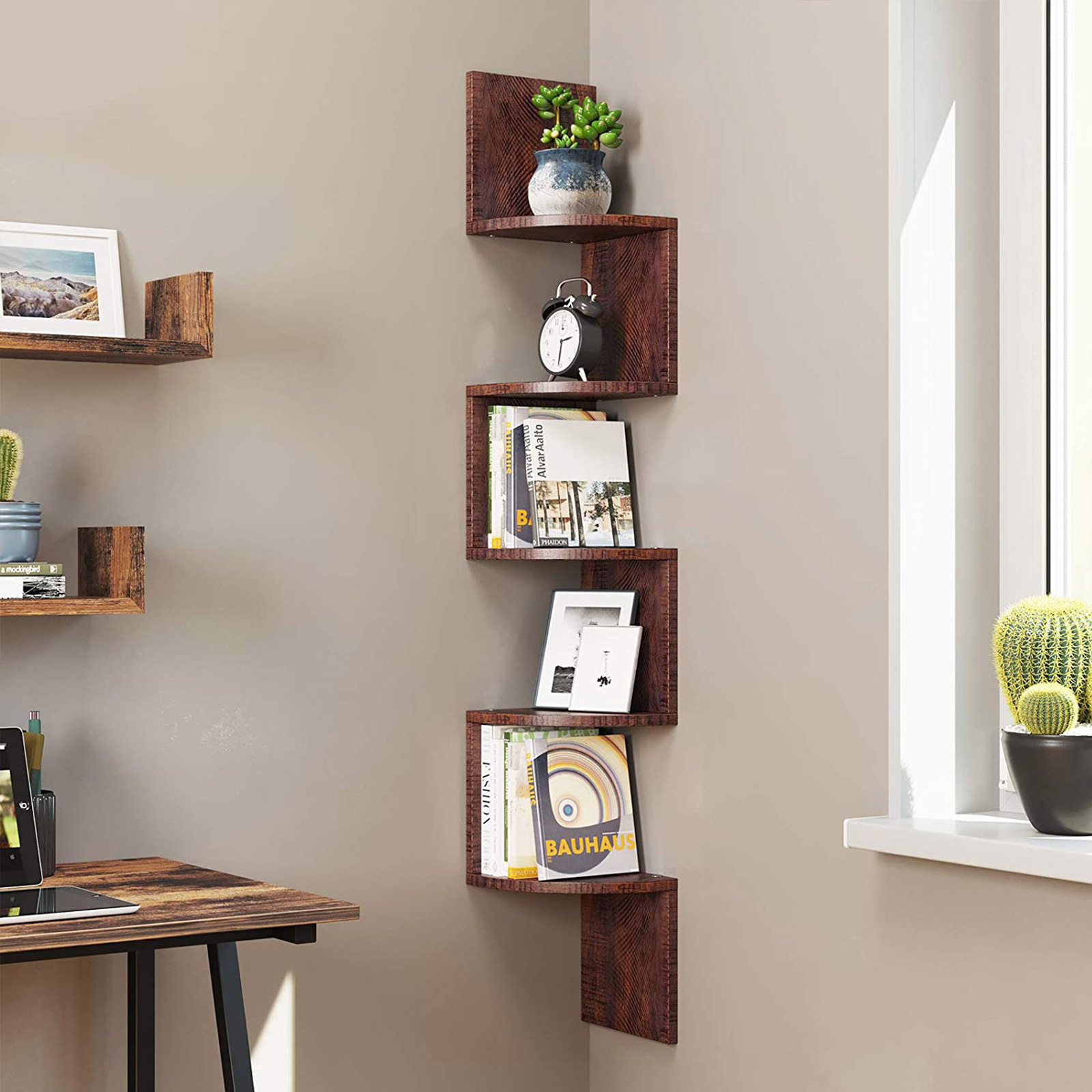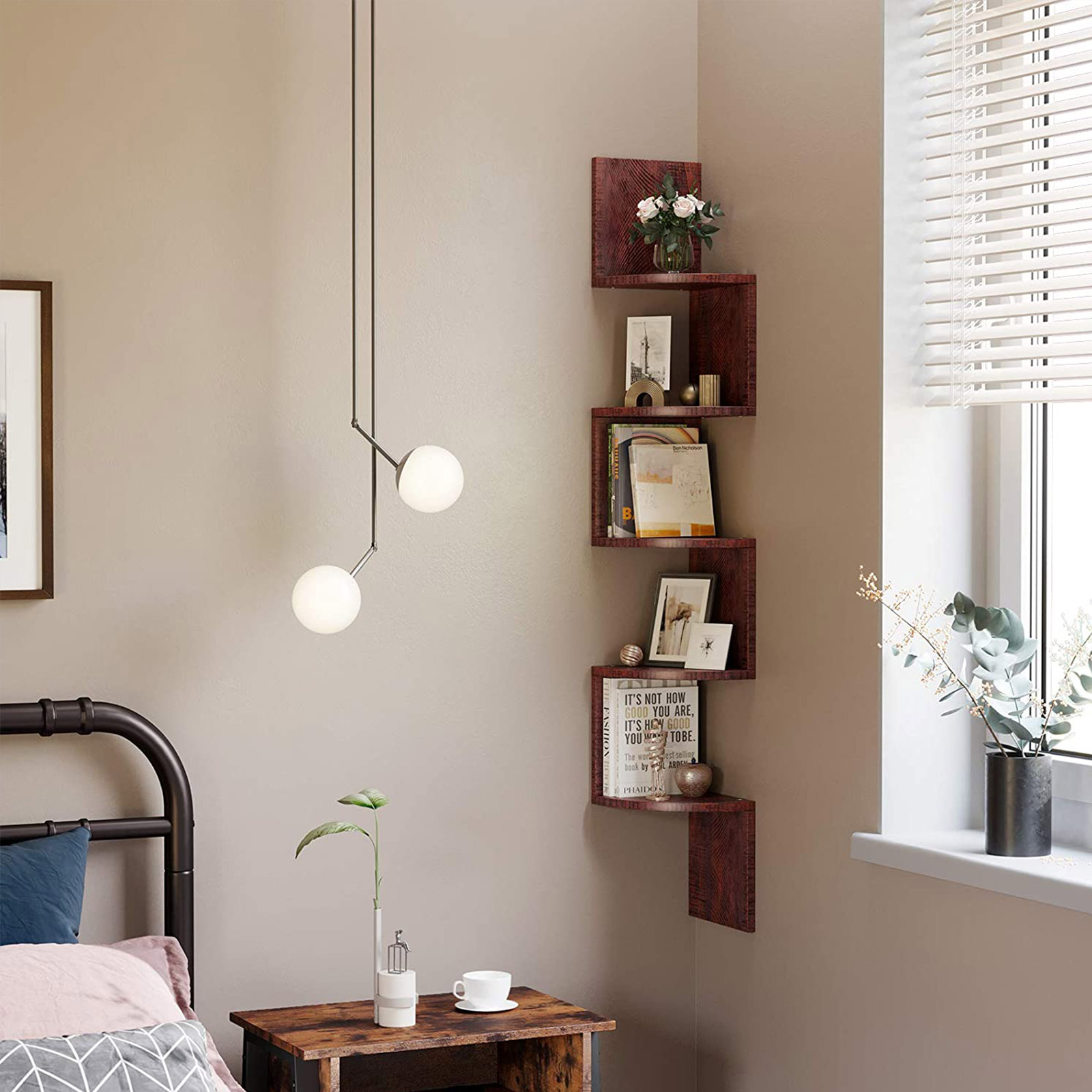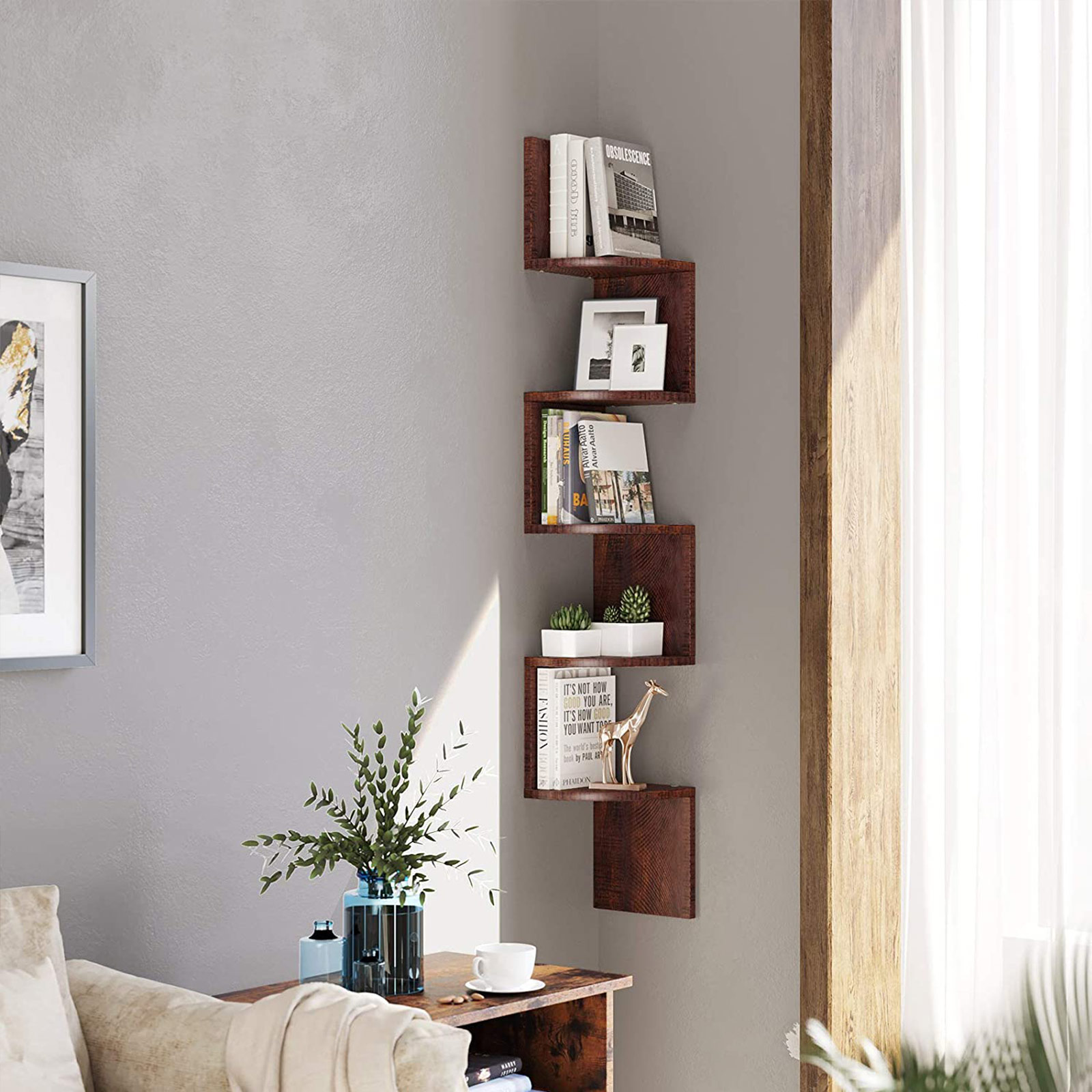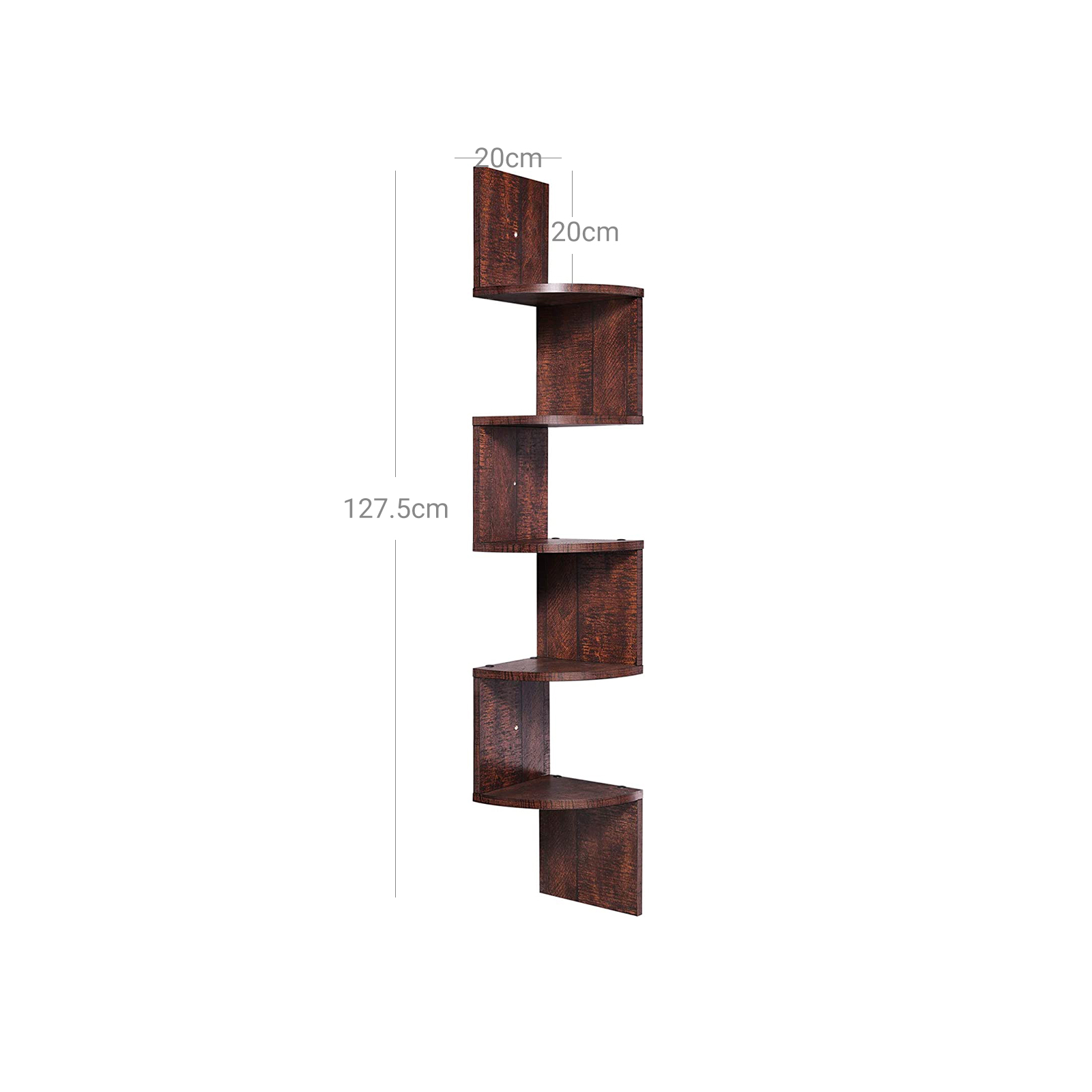 Chic and practical This corner shelf offers plenty of space for decorative items, household items, and books, and fits beautifully into your living environment. Unique look The artistic shape is what makes this corner shelf so special. All edges are also sealed so that they are nice and smooth and do not splinter. All screws can also be covered with the included stickers so that they do not detract from the unique look of the floating shelf. Plenty of storage space Use the bookcase for toys or books in the children’s room, hang it next to your reading chair in the living room, or use it in the bedroom for your accessories. Product details:- Color: Walnut- Material: Chipboard- Product dimensions: 20 x 20 x 127.5 cm (L x W x H)- Weight: 4.5 kg- Max. static load capacity per shelf: 15 kgScope of delivery:- 1 x bookshelf – 1 x accessory package – 1 x instructions (DE, EN, FR, ES, IT) VASAGLE notes: – Please clean the bookshelf with a damp cloth and then wipe it dry.