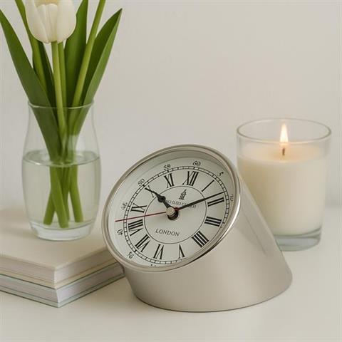 Bordsklocka i metall – CLK-0212 Bordsklockan CLK-0212 i metall ser ut som om den kommer från cockpiten i ett gammalt flygplan. Klockan har en ovanlig form av en avkortad cylinder och är en användbar och originell dekoration för skrivbordet. Den fungerar också bra som sovrumsklocka, som du kan placera på sängbordet. Den vita urtavlan med svarta romerska och arabiska siffror ger en fin kontrast och gör det lätt att avläsa tiden. Romerska siffror anger timmar, arabiska siffror anger minuter. Klockans design är ren och snygg och passar in i moderna interiörer. Produktinformation: Material: trä, metallSiffror: romerska (timmar), arabiska (minuter)Visare: klassiska, svartaFärger: silver, vitt, svartUrtavlan: rundKlockans form: diagonalt avskuren cylinder BatteridrivenStil: ModernMått: 13 x 13 19 cm
