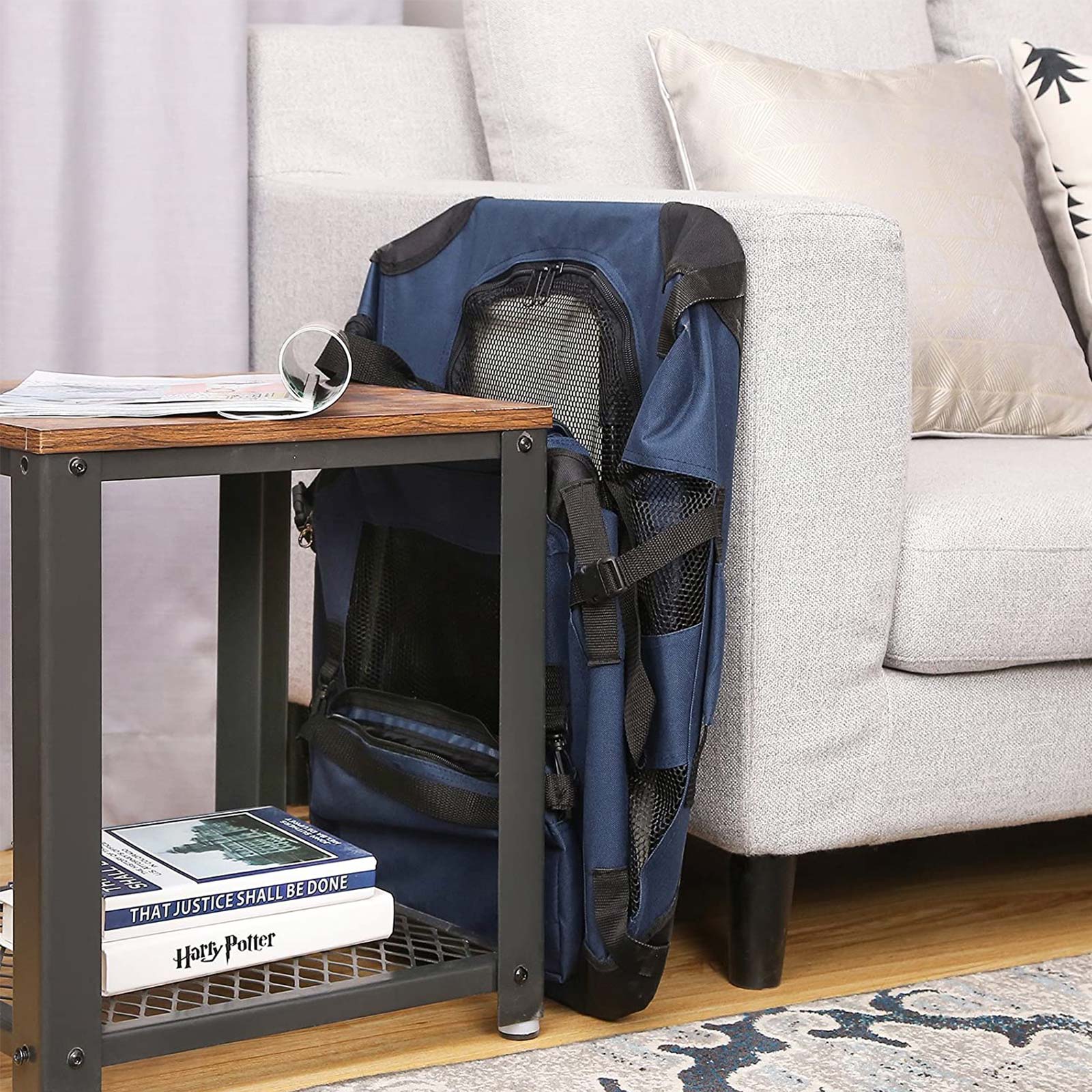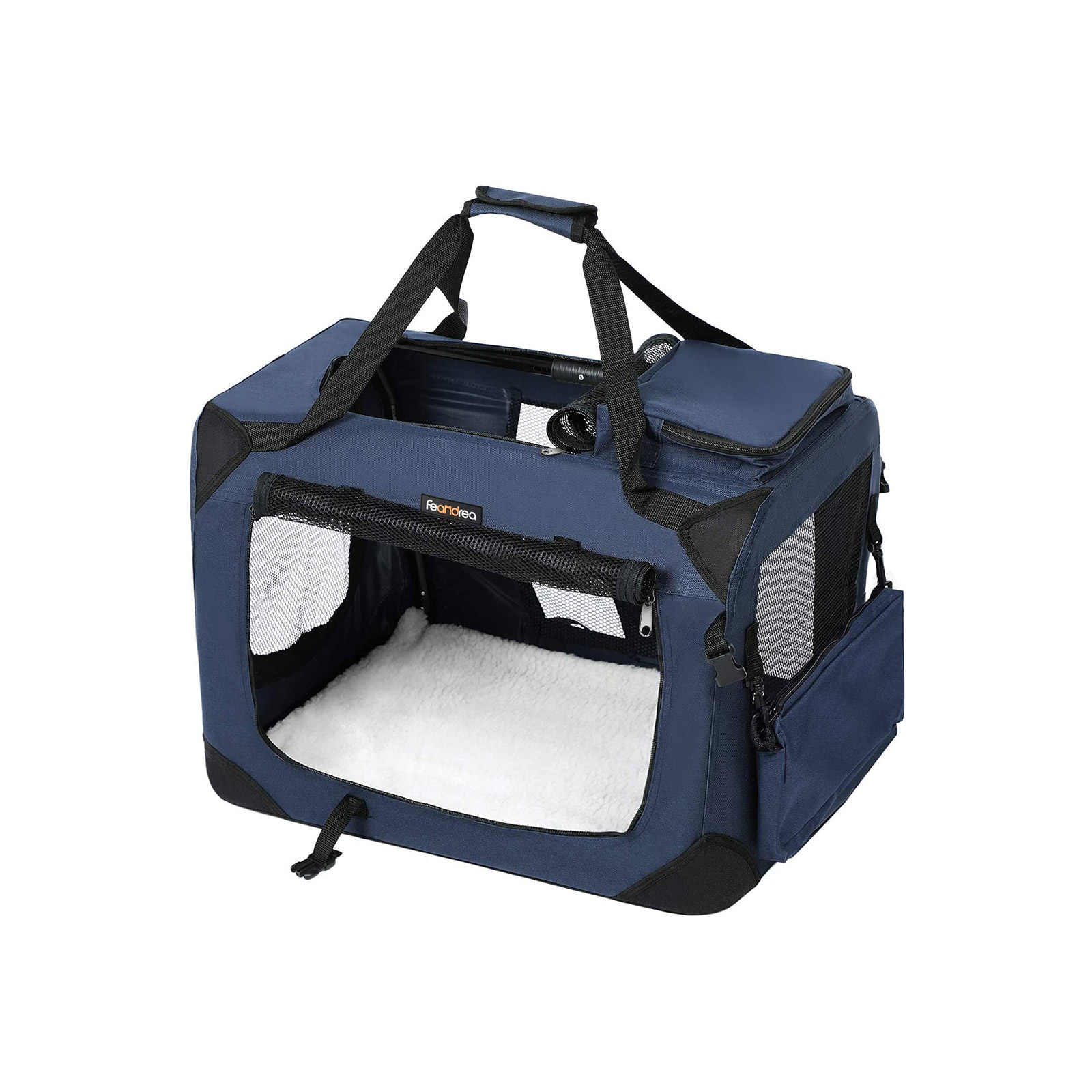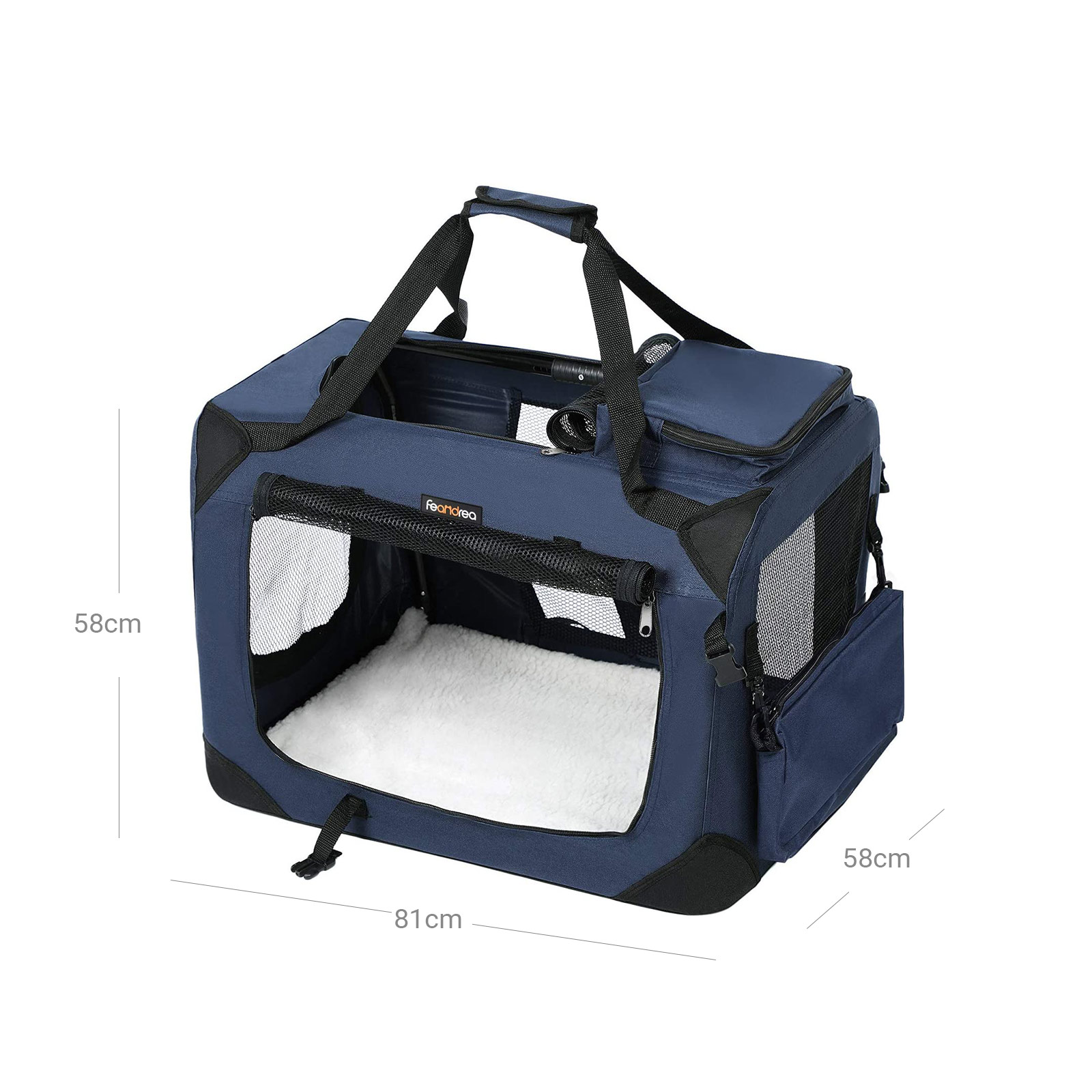 Vart du än ska resa – åker du tåg från München till Berlin för att besöka familj eller vänner? Eller åker du gärna till havet på semestern? Då skulle din hund eller katt säkert vilja följa med, eller hur? Lägg bara din älskling i denna transportväska från FEANDREA, ta tag i handtagen och så är det bara att åka! Alla fördelar med den praktiska hundväskan i korthet: – Metallstomme; ger en stabil struktur – Tillverkad av Oxford-tyg; robust och slitstark – Med en fluffig matta inuti som kan tas ut och med en vattenavvisande PVC-beläggning på undersidan – 2 extra små fack med dragkedja för förvaring av husdjurs tillbehör – Kan monteras eller demonteras på några minuter – Kan enkelt vikas ihop när den inte används och förvaras i ett hörn för att spara utrymme – Fönster av nätmaterial och rymligt innerutrymme så att ditt husdjur känner sig som hemma Produktdetaljer:- Färg: Mörkblå – Material: Metallstomme, Oxford-tyg, PVC-beläggning, fleece – Storlek: 81 x 58 x 58 cm (L x B x H) – Vikt: 4,1 kg Leveransomfattning: – 1 x hundväska FEANDREA Anmärkningar: – Husdjur får endast vistas i transportväskan utan halsband och koppel.- Mät ditt husdjur innan du beställer denna produkt för att säkerställa att det passar i väskan.