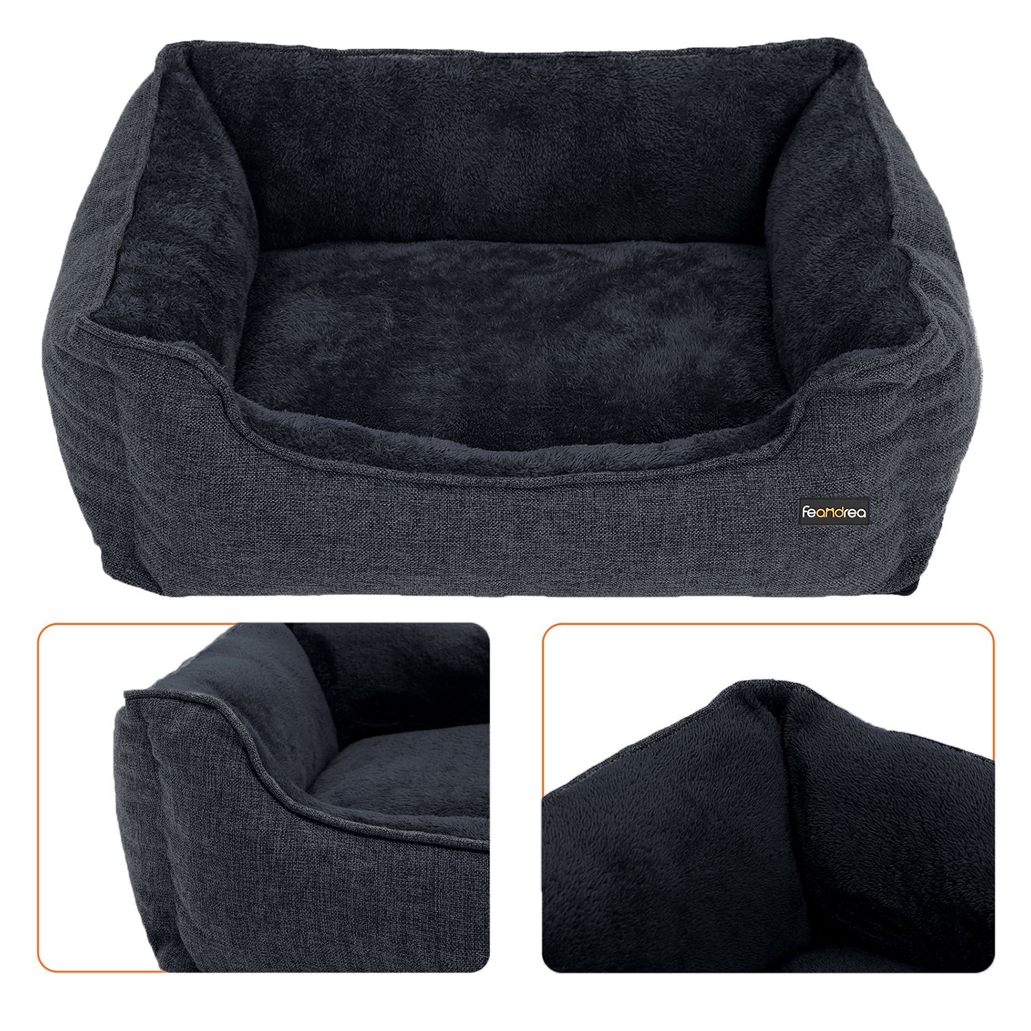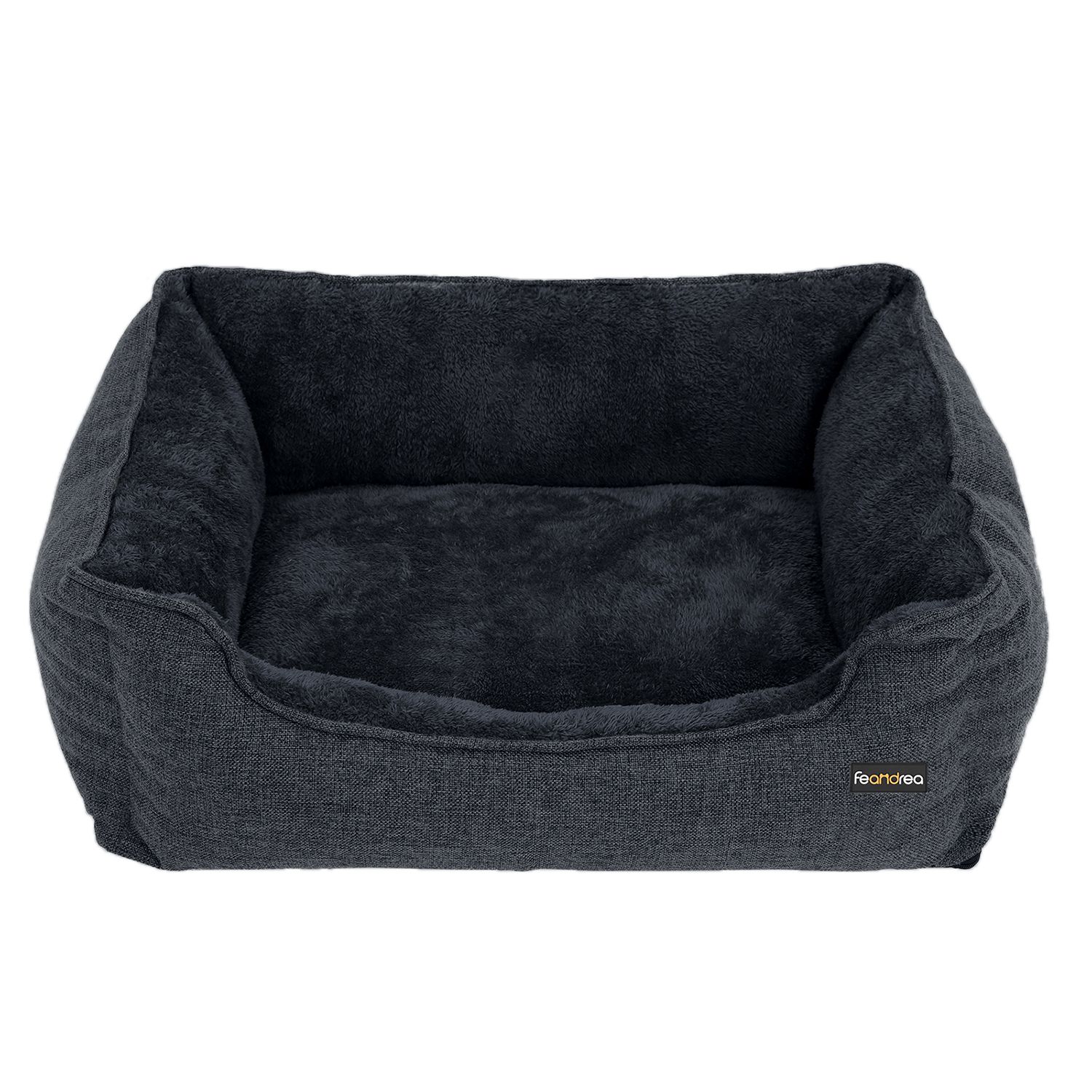Ge din fyrbenta vän en egen säng! Äntligen får din hund en egen säng som är mysig och bekväm. FEANDREA vill att din fyrbenta vän ska känna sig som en del av familjen, därför har vi utvecklat denna hållbara hundsäng som säkert kommer att bli din hunds absoluta favoritplats. Tack vare den extra mjuka liggytan kan han koppla av ordentligt. Dessutom är överdraget avtagbart och tvättbart i maskin, så att dålig lukt undviks. Ge din hund denna hundsäng, den förtjänar ett mysigt hem! Produktdetaljer: Färg: Mörkgrå Material: imiterat linne, polyestertyg med noppor, PP-fyllning, plysch Storlek: 90 x 75 x 25 cm (L x B x H) Vikt: 2,2 kg Leveransomfattning: 1 x hundbädd FEANDREA Anmärkningar: Utsätt inte produkten för direkt solljus och placera den inte i en fuktig miljö.Produkten får inte komma i kontakt med vassa föremål. Hundbädden är inte ett tuggleksak för dina fyrbenta vänner; se till att din hund inte biter på bädden. Vår hundbädd är hopvikt för förpackningsändamål. Det kan därför ta 2-3 dagar innan den återfår sin normala form. På grund av sömsmånen kan produkter av denna typ avvika upp till 3 cm från de mått vi anger. Använd inte denna produkt i närheten av värmekällor över 40 °C. Om det finns golvvärme, använd en extra underläggsmadrass.