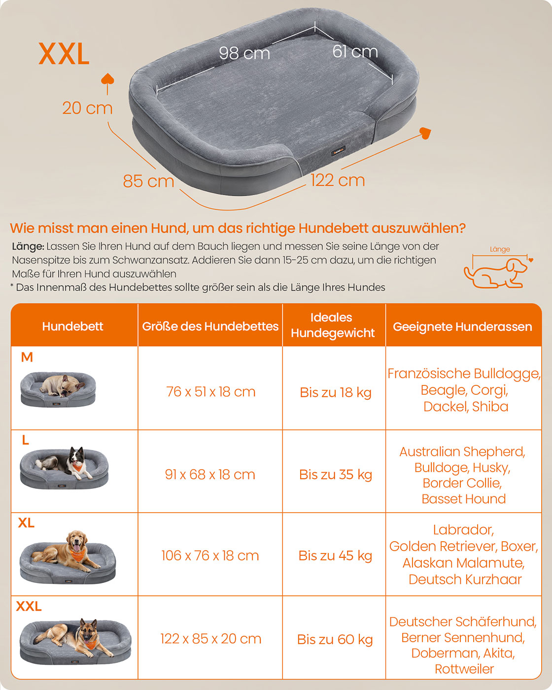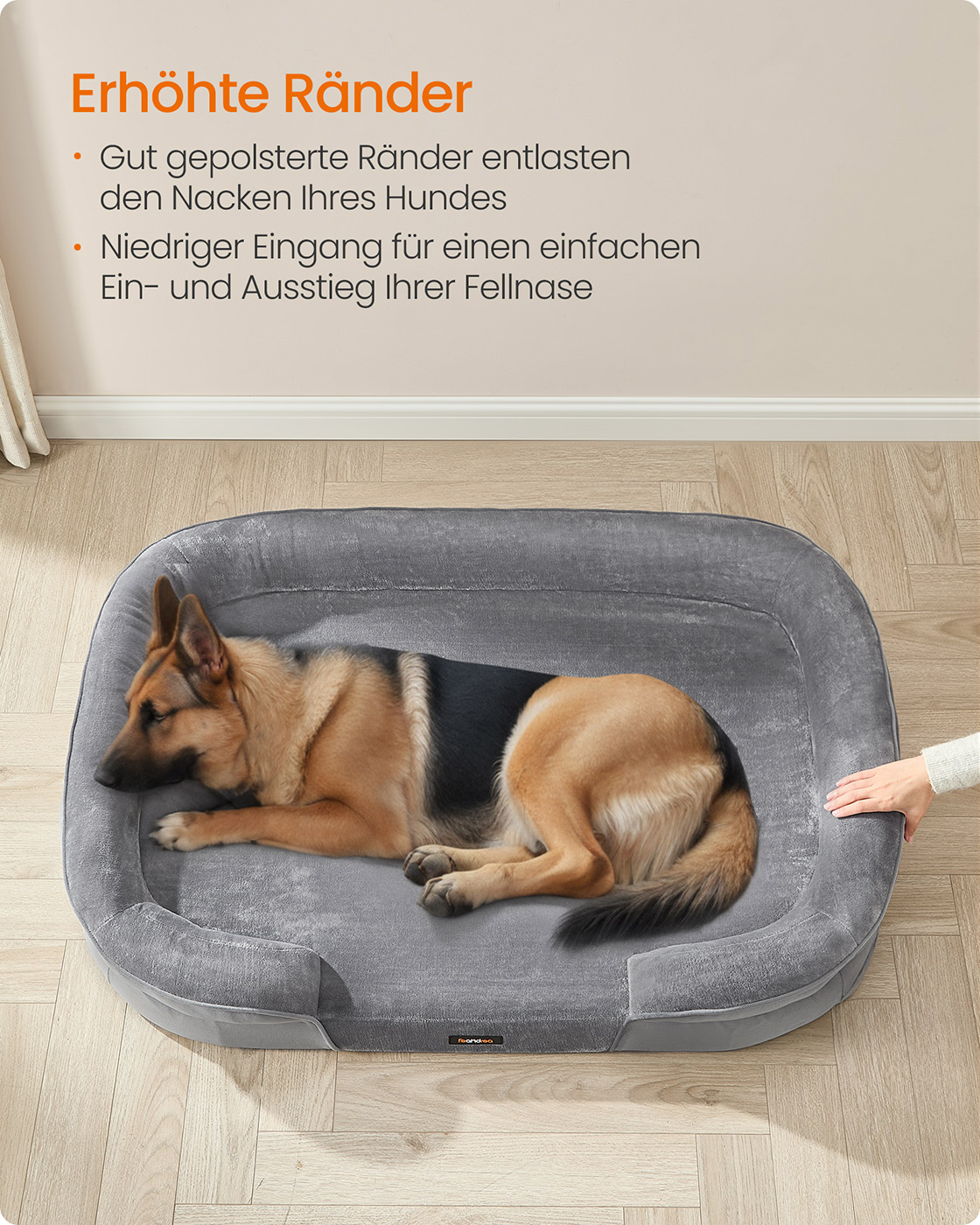 Feandrea hundbädd, hundkudde, för stora hundar, 91 x 68 x 18 cm, ortopedisk, vattentät innerlager, upphöjda kanter, avtagbart, tvättbart överdrag, halkfritt, ljusgrått PGW282G01