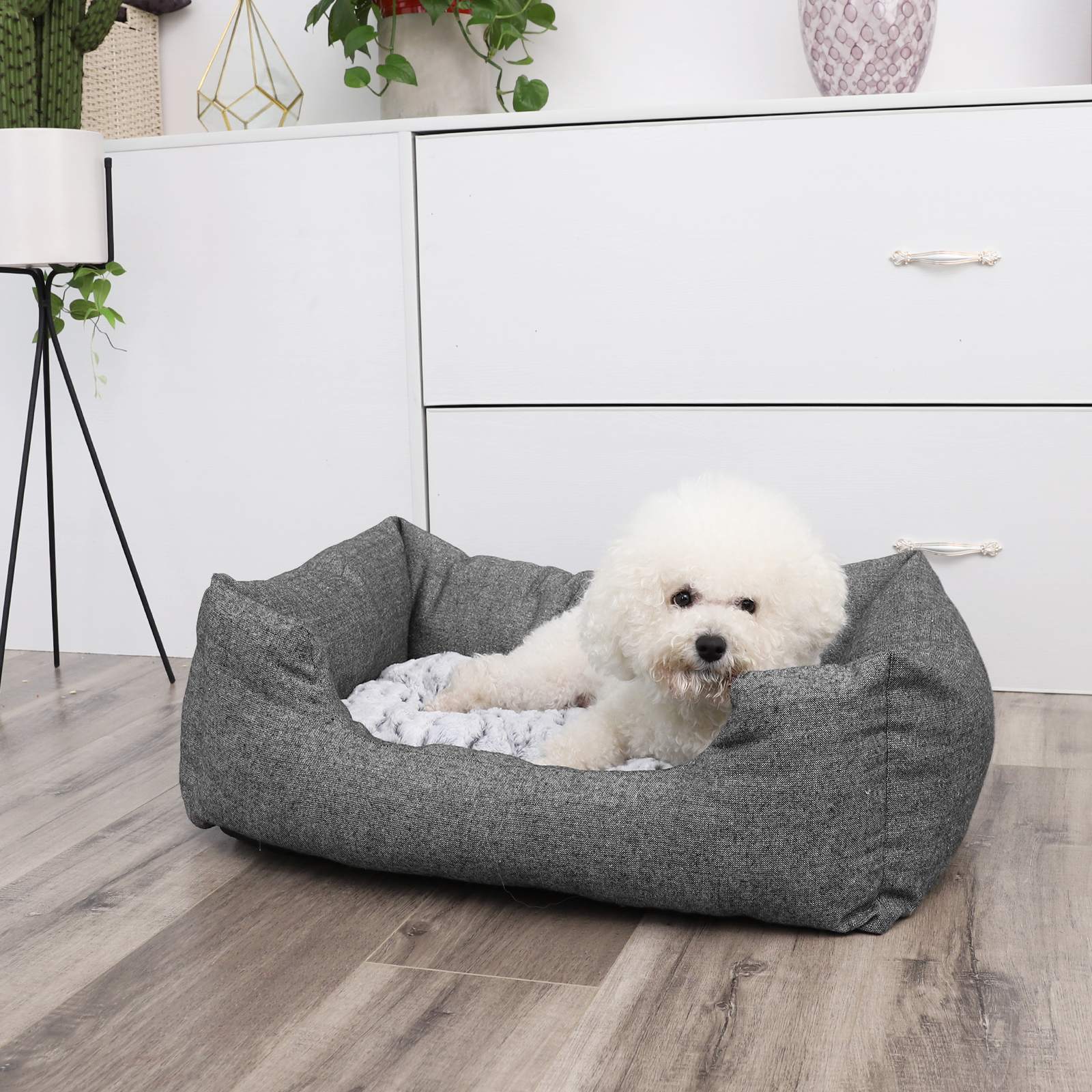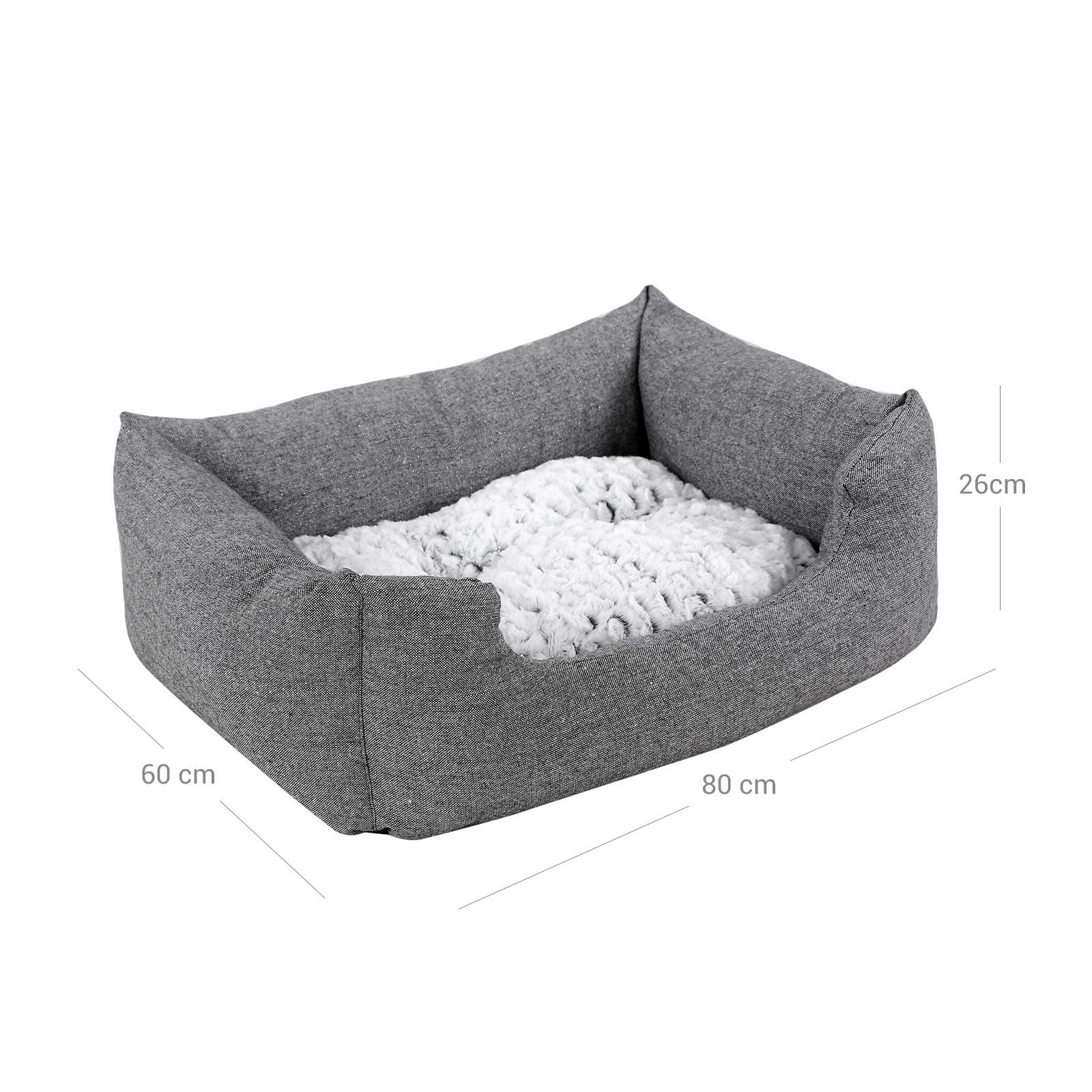 Husdjursbädden från FEANDREA är en perfekt sov- och viloplats för din älskling! Husdjursbädden i fyrkantig form kännetecknas av sin robusthet och höga kvalitet. Utsidan är tillverkad av robust olyester-tyg. De glittrande silvertrådarna ger produkten ett vackert utseende. Insidan är tillverkad av mjukt flortyg. Man kan vända på insidan beroende på hur man vill ha det. Din hund kommer att trivas riktigt bra i denna säng. Tack vare den mjuka stoppningen känner sig din fyrbenta vän väl skyddad och trygg från alla håll. Även drag och kyla undviks tack vare de höga väggarna och stoppningen i liggkudden. Denna modell garanterar lång livslängd. Den passar till nästan alla inredningsstilar.Produktdetaljer: – Färg: Grå melerad – Material: Blandväv (bomull, polyester), PV-fleece, polypropenfyllning – Yttermått: 80 x 60 x 26 cm (L x B x H) – Innermått: 53 x 40 cm – Nettovikt: 2 kg Leveransomfattning: – 1 x hundbädd – 1 x avtagbart innerkudde FEANDREA Obs! – Ej lämplig för maskintvätt. Borsta endast av vid smuts. Om hundhår lossnar i stor mängd kan du rengöra ytan med en dammsugare.- På grund av sömsmån kan produkter av denna typ avvika upp till 3 cm från de mått vi anger. – Observera att textiletiketten på denna produkt har ersatts med en högkvalitativ etikett i konstläder. Det är därför möjligt att du får den gamla modellen eller den nya varianten. Leveransen av den ena eller andra modellen sker slumpmässigt.
