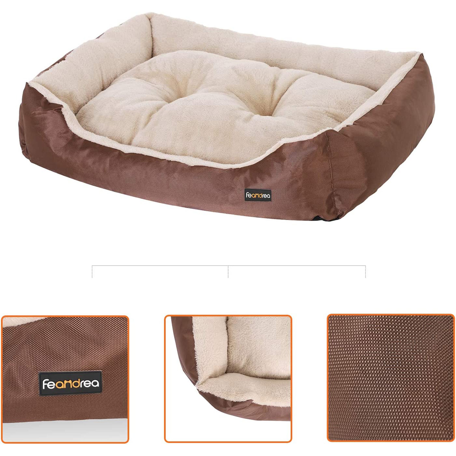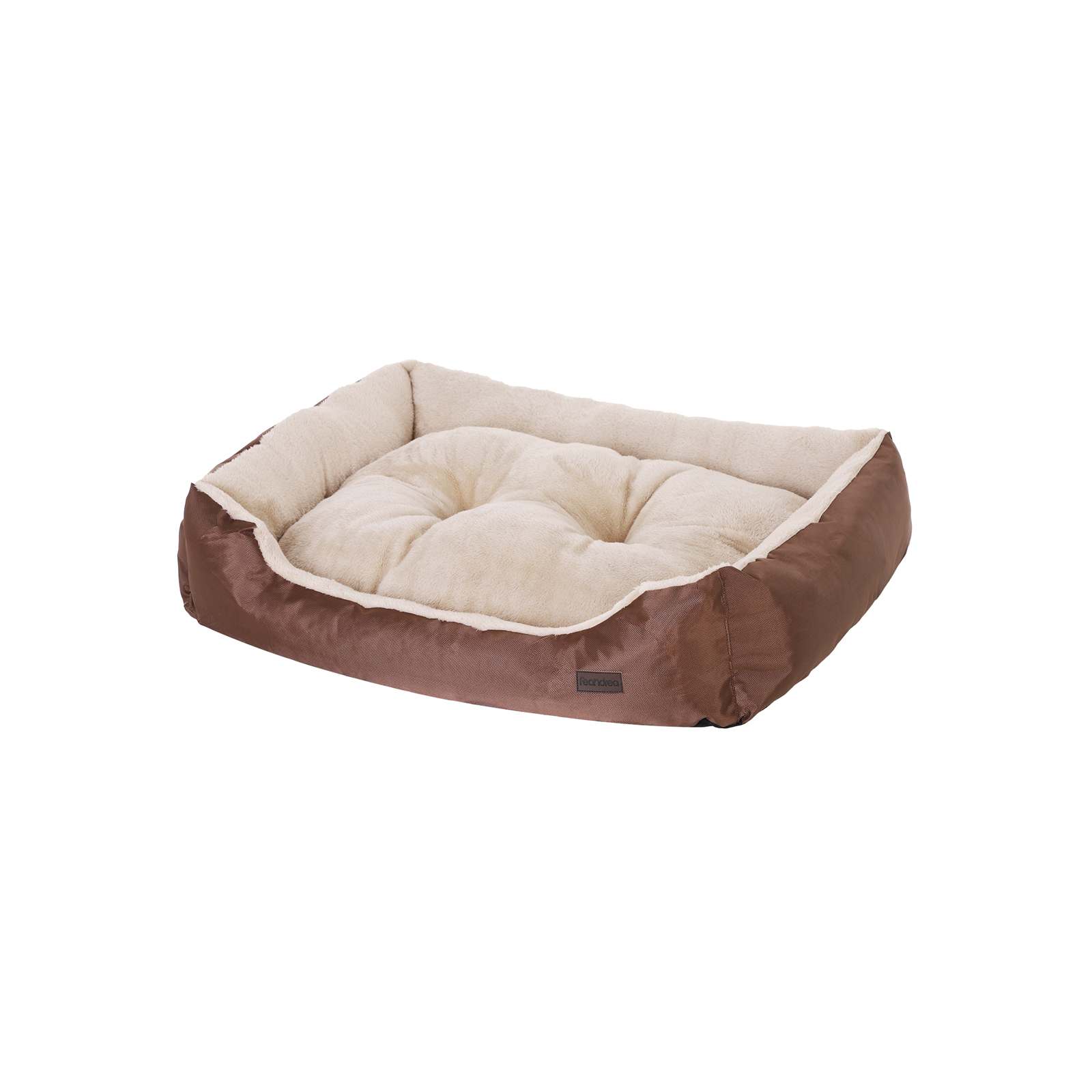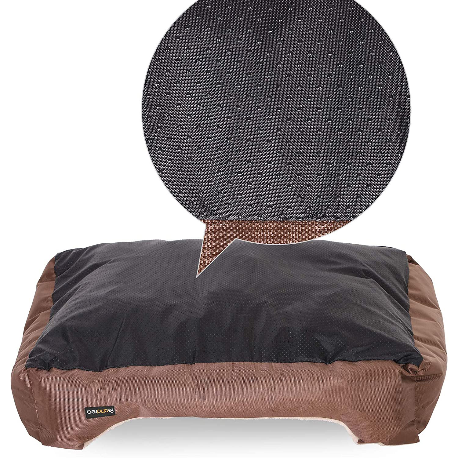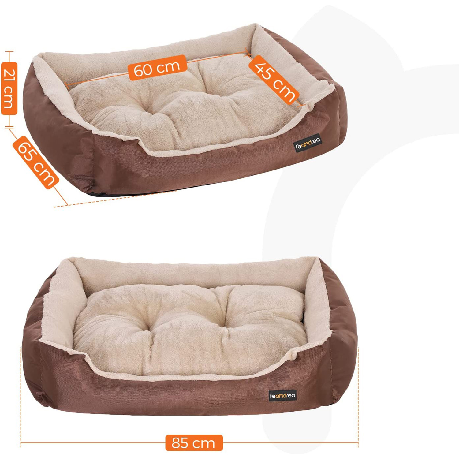 Uppfinnarna bakom vårt nya varumärke FEANDREA vet att ditt husdjur spelar en mycket speciell roll i ditt liv och att du vill ge det ett så bekvämt och roligt liv som möjligt. Med detta i åtanke har de skapat bekväma, funktionella, snygga och framför allt djurvänliga möbler för husdjur, såsom den hundbädd som visas ovan. Kvalitet eller stil? Med denna säng för husdjur behöver du inte ställa dig den frågan, eftersom den förenar båda komponenterna. Det robusta Oxford-tyget på utsidan tål även hårdare klösningar, men tack vare det eleganta bruna tyget är hundsoffan samtidigt en stilfull inredningsdetalj. Till detta bidrar även det ljusa vändbara kudden i fleece, som bildar en effektfull kontrast till det mörkare bruna yttertyget.En trygg plats Tack vare de upphöjda kanterna på denna hundkorg känner sig din fyrbenta vän helt skyddad. Framför allt drag och kyla från golvet hålls borta tack vare de höga väggarna och den utmärkta stoppningen. Saknar din hund fortfarande en mysig säng? Beställ då denna hundkorg för djur upp till 30 kg. Produktdetaljer: – Färg: brun-beige – Material: 150D Oxford-tyg, fleece, polypropylen-fyllning – Storlek: 85 x 65 x 21 cm (L x B x H) – Vikt: 1,7 kg Leveransomfattning: – 1 x hundbädd FEANDREA Anmärkningar: – Utsätt inte produkten för direkt solljus och placera den inte i en fuktig miljö. – Hundbädden är inte ett tuggleksak för dina fyrbenta vänner; se till att din hund inte tuggar på bädden. – Vår hundbädd är hopvikt för förpackningsändamål. Det kan därför ta 2–3 dagar innan den återfår sin normala form. På grund av sömsmånen kan produkter av denna typ avvika upp till 3 cm från de mått vi anger.