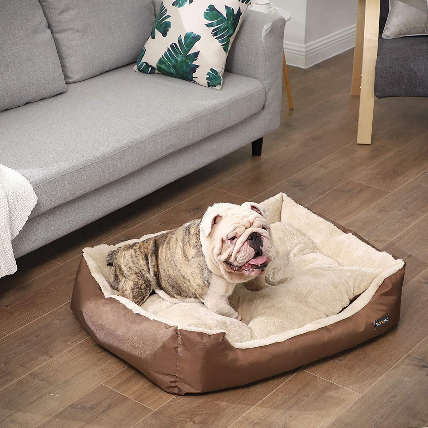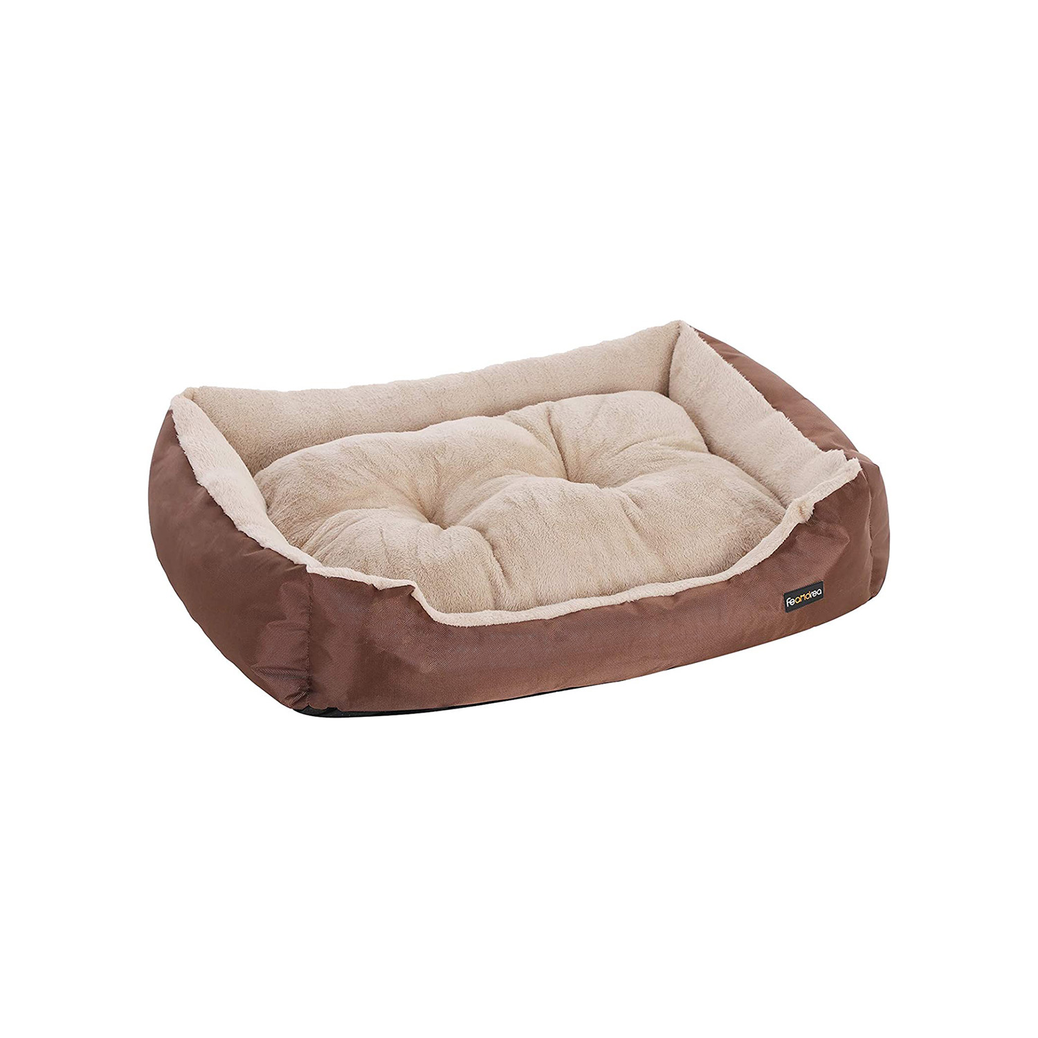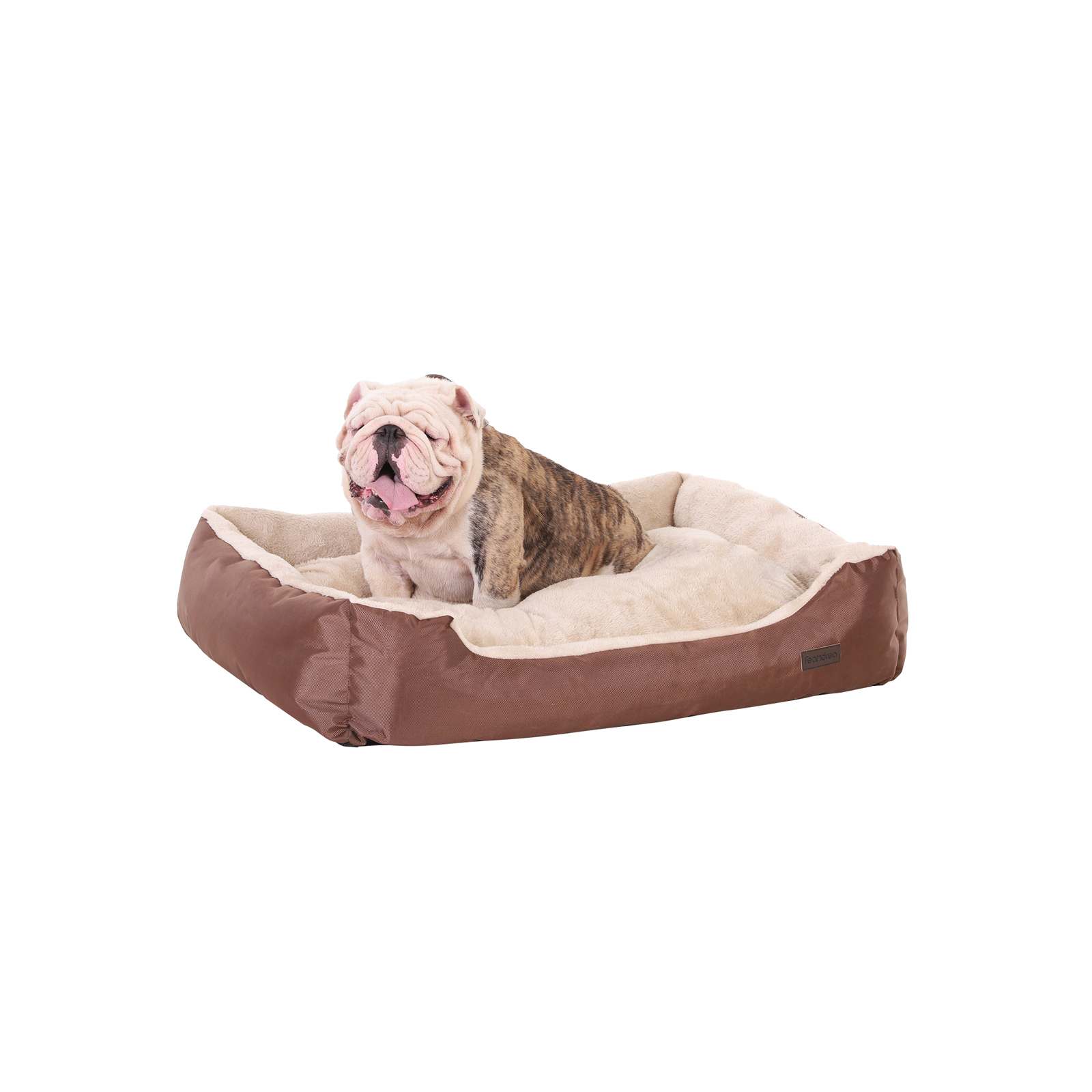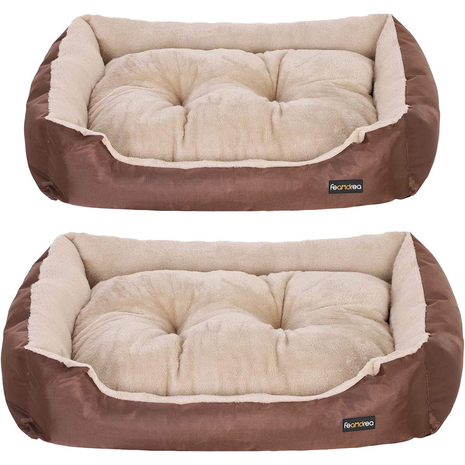 Uppfinnarna bakom vårt nya varumärke FEANDREA vet att ditt husdjur spelar en mycket speciell roll i ditt liv och att du vill ge det ett så bekvämt och roligt liv som möjligt. Med detta i åtanke har de skapat bekväma, funktionella, snygga och framför allt djurvänliga möbler för husdjur, såsom den hundbädd som visas ovan. Kvalitet eller stil? Med denna säng för husdjur behöver du inte ställa dig den frågan, eftersom den förenar båda komponenterna. Det robusta Oxford-tyget på utsidan tål även hårdare klösningar, men tack vare det eleganta bruna tyget är hundsoffan samtidigt en stilfull inredningsdetalj. Till detta bidrar även det ljusa vändbara kudden i fleece, som bildar en effektfull kontrast till det mörkare bruna yttertyget.En trygg plats Tack vare de upphöjda kanterna på denna hundkorg känner sig din fyrbenta vän helt skyddad. Framför allt drag och kyla från golvet hålls borta tack vare de höga väggarna och den utmärkta stoppningen. Saknar din hund fortfarande en mysig säng? Beställ då denna hundkorg för djur upp till 30 kg. Produktdetaljer: – Färg: brun-beige – Material: 150D Oxford-tyg, fleece, polypropylen-fyllning – Storlek: 85 x 65 x 21 cm (L x B x H) – Vikt: 1,7 kg Leveransomfattning: – 1 x hundbädd FEANDREA Anmärkningar: – Utsätt inte produkten för direkt solljus och placera den inte i en fuktig miljö. – Hundbädden är inte ett tuggleksak för dina fyrbenta vänner; se till att din hund inte tuggar på bädden. – Vår hundbädd är hopvikt för förpackningsändamål. Det kan därför ta 2–3 dagar innan den återfår sin normala form. På grund av sömsmånen kan produkter av denna typ avvika upp till 3 cm från de mått vi anger.