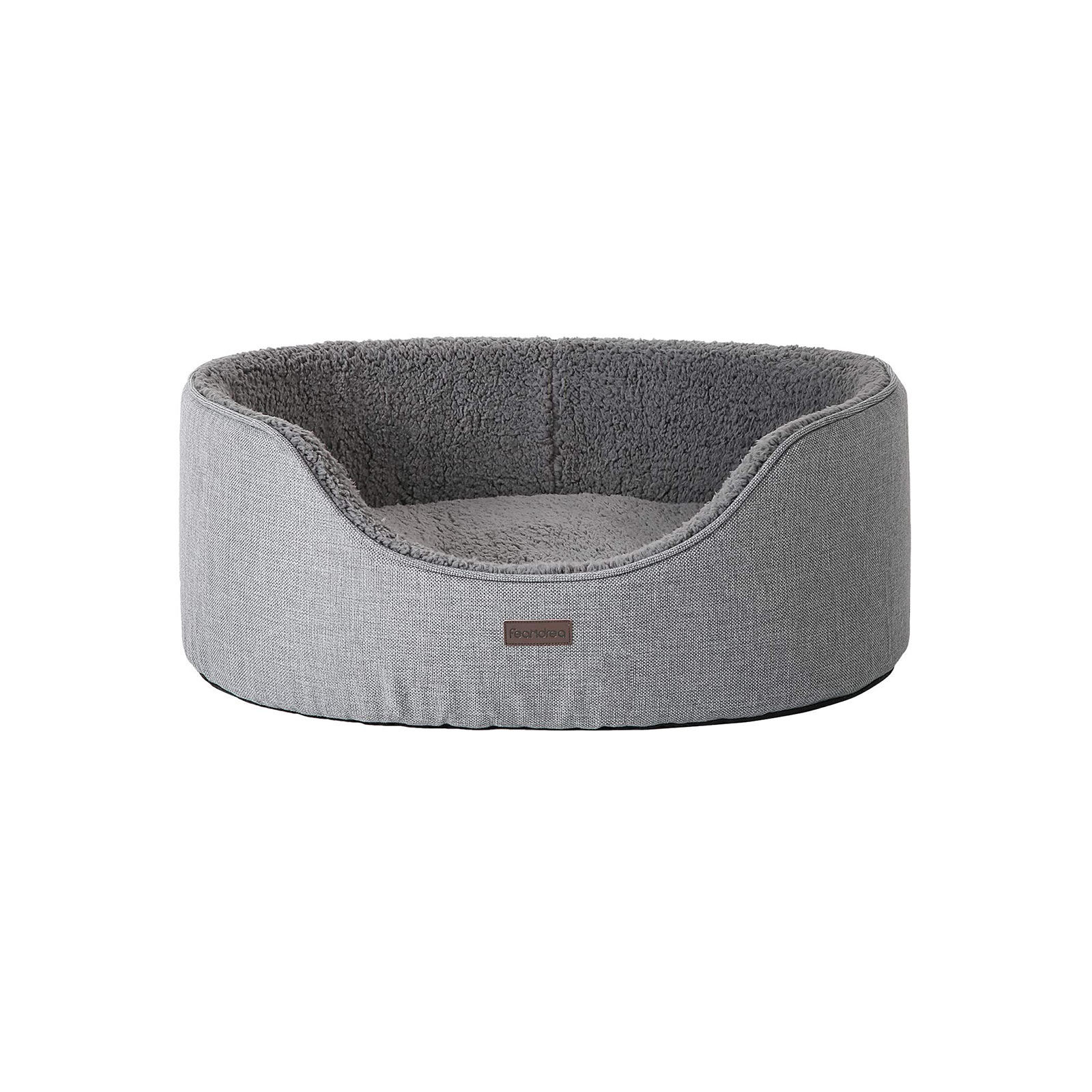 Hoppa in i korgen! Med denna runda hundbädd får din fyrbenta vän en mysig plats att dra sig tillbaka till, där han kan vila och sova. Korgen, som mäter 92 x 72 x 27 cm, är särskilt lämplig för medelstora till stora hundraser som golden retriever, labrador eller bobtail. Vänd den, tack! Hundbädden har några små finesser: Kudden kan tas av och vändas, så att din hund kan mysa med antingen imitationsläder eller plysch. Överdraget på kudden är dessutom avtagbart, så att du enkelt kan tvätta det i maskinen. Dessutom har hundkorgen en hög kant som omger din fyrbenta vän på ett säkert sätt. Produktdetaljer: – Färg: Grå – Material: Imitation av linne, plysch, PP-fyllning (polypropen) – Storlek: 92 x 72 x 27 cm (L x B x H) – Vikt: 1,7 kg Leveransomfattning: – 1 x hundbädd FEANDREA Anvisningar: – Utsätt inte produkten för direkt solljus och placera den inte i en fuktig miljö. – Produkten får inte komma i kontakt med vassa föremål.- Vi rekommenderar att du tvättar produkten för hand. – Hundbädden är inte ett tuggleksak för din fyrbenta vän; se till att din hund inte tuggar på bädden. – Vår hundbädd är hopvikt för förpackningsändamål. Det kan därför ta 2–3 dagar innan den återfår sin normala form. På grund av sömsmånen kan produkter av denna typ avvika upp till 3 cm från de mått vi anger. – Använd inte denna produkt i närheten av värmekällor över 40 °C. Om det finns golvvärme, använd en extra underlägg.