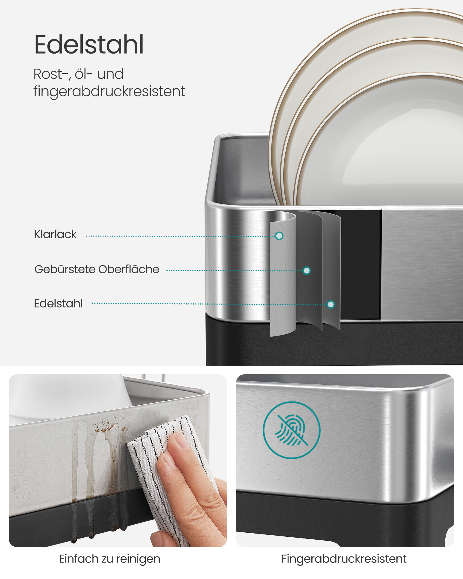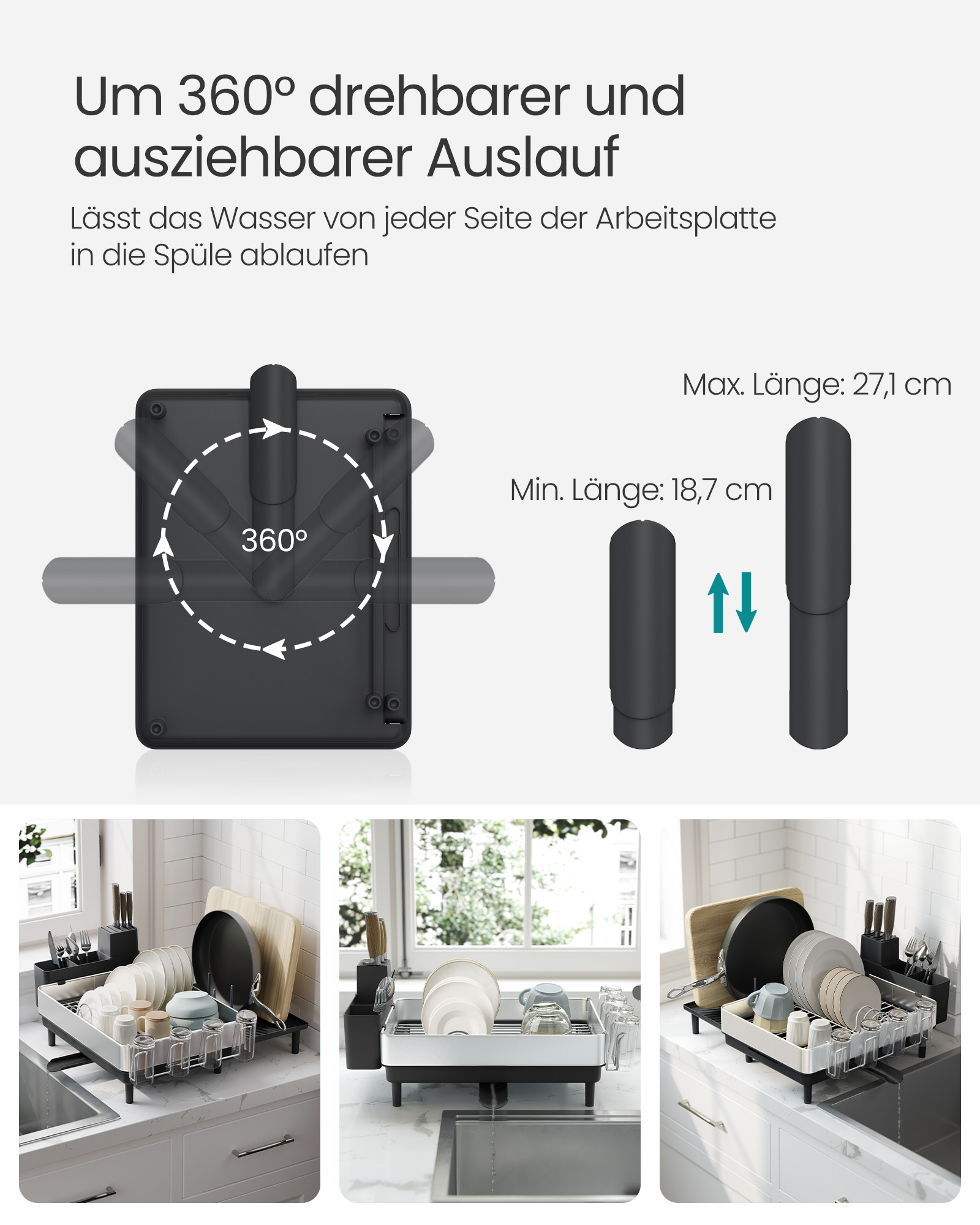 SONGMICS diskställ, diskställ i rostfritt stål, utdragbart, vridbart utlopp, med hållare för bestick, koppar, glas, skärbräda och kastruller, silver-svart KCS037B01