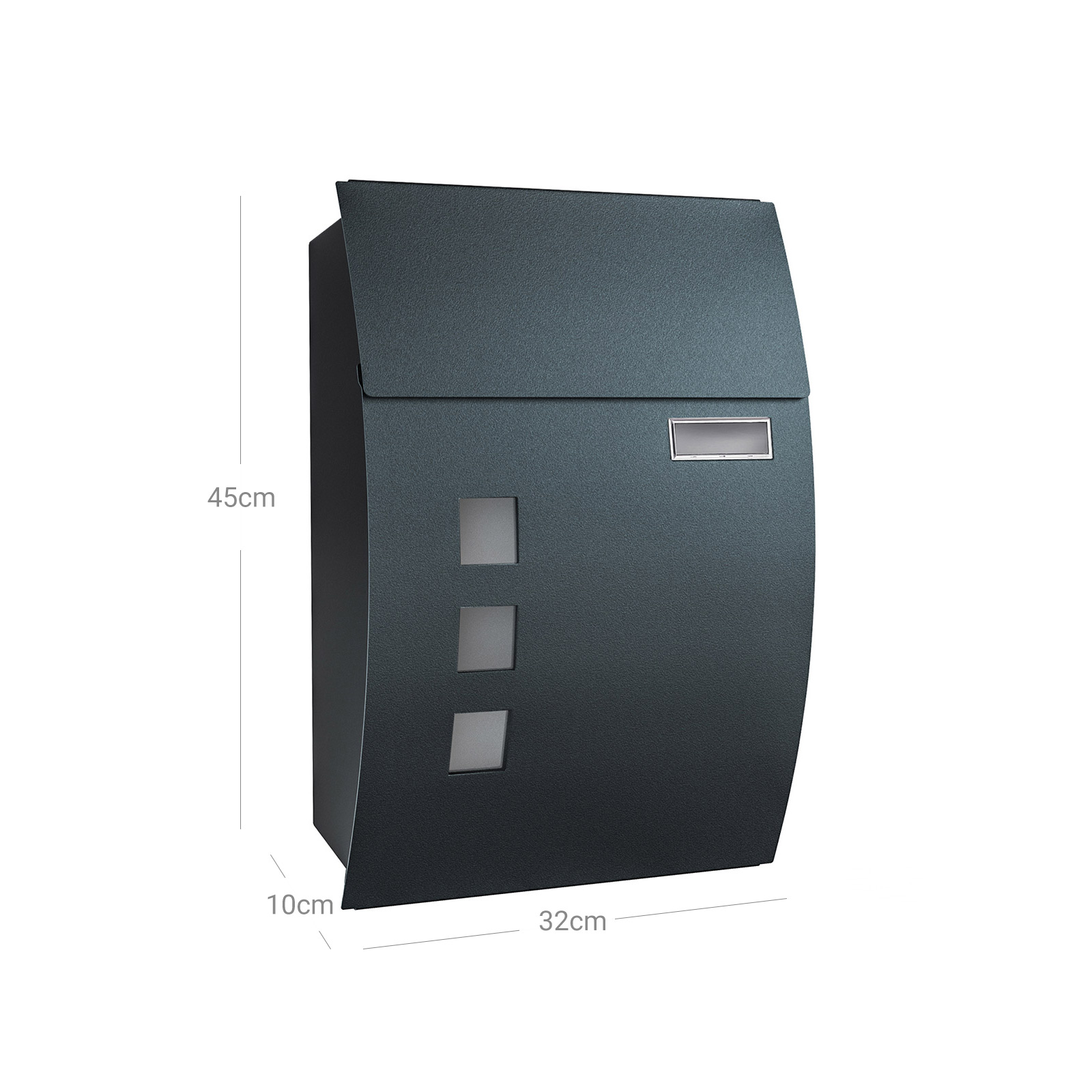 En fristad för dina brev: Lägger brevbäraren alltid dina brev på marken framför din dörr? Detta är särskilt irriterande på regniga dagar. Dessutom kan din post helt enkelt försvinna. Denna brevlåda från SONGMICS kommer till din hjälp och erbjuder dina brev ett litet skydd. Den är tillverkad av pulverlackerat metall, skyddar trycksakerna från väder och vind och har dessutom en lång livslängd.Detaljerna gör skillnaden: Följande genomtänkta detaljer gör att denna brevlåda sticker ut från mängden: Locket på brevlådan skyddar låset från regnvatten; fönstret visar när dina brev har kommit; hållaren för namnskyltar säkerställer att dina brev når rätt mottagare; de medföljande monteringsdetaljerna gör det enkelt att montera. Produktdetaljer:Färg: AntracitMaterial: Pulverlackerat stålStorlek: 32 x 10 x 45 cm (L x B x H)Vikt: 2,3 kgLeveransomfattning:1 x brevlåda1 x tillbehörspåseSONGMICS Anmärkningar:Det rekommenderas att placera brevlådan på en väderskyddad plats för att säkerställa en längre livslängd.