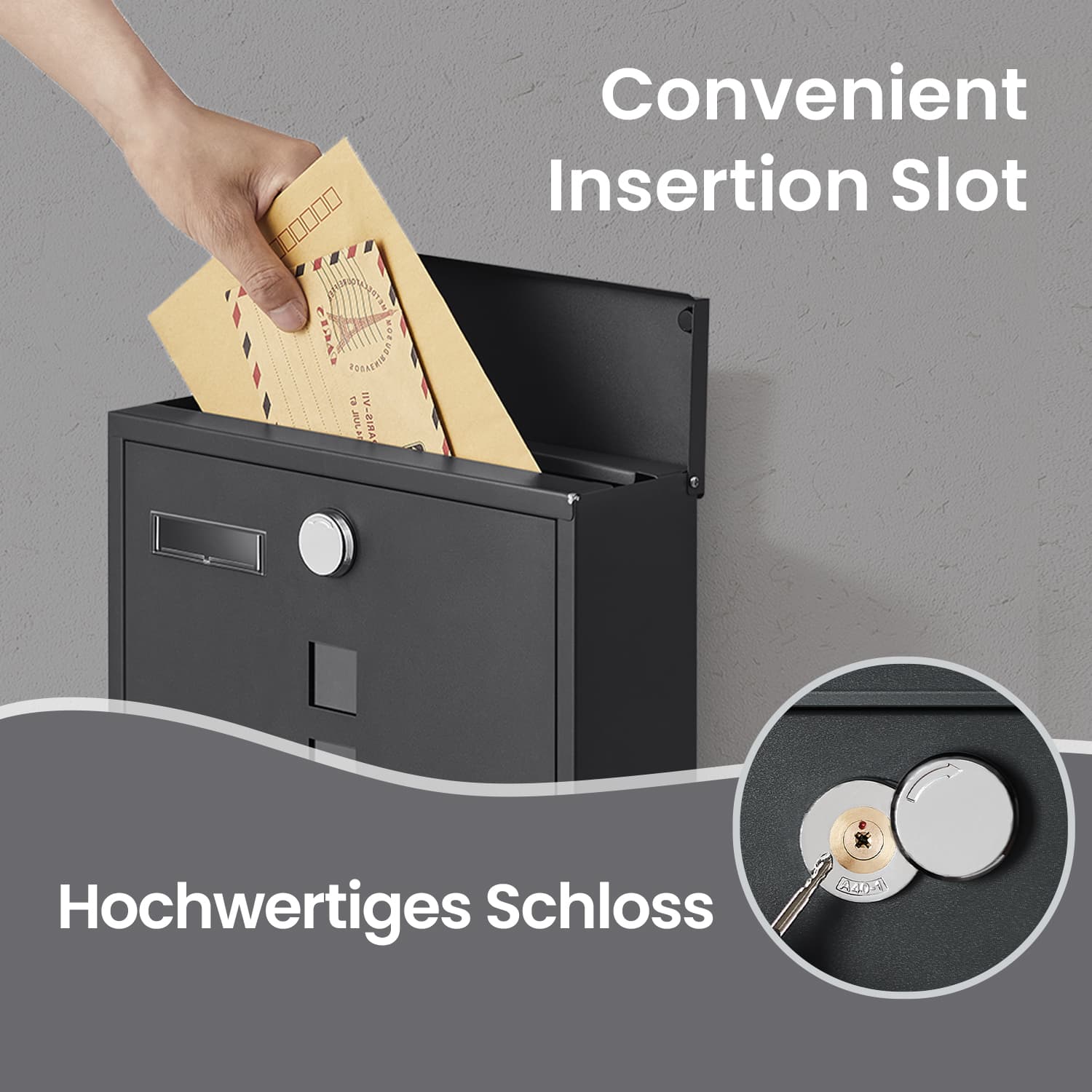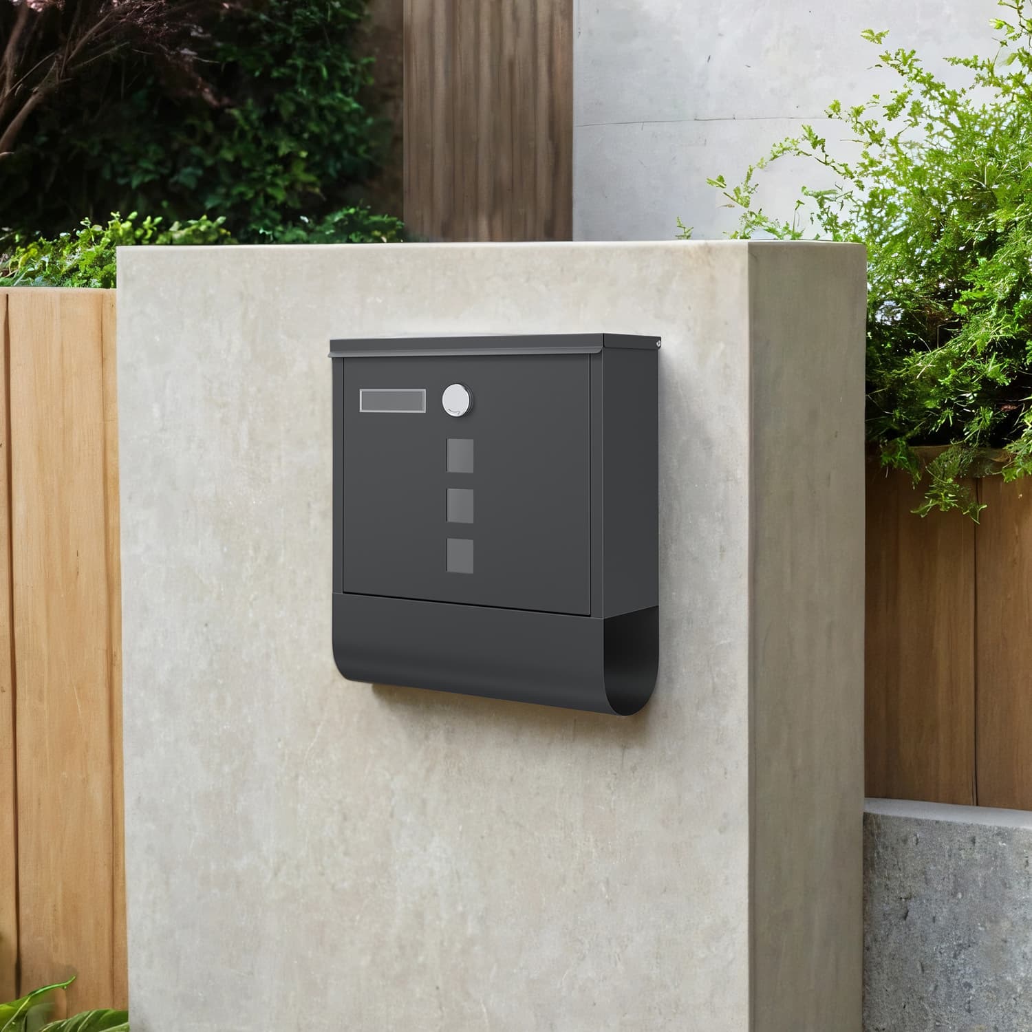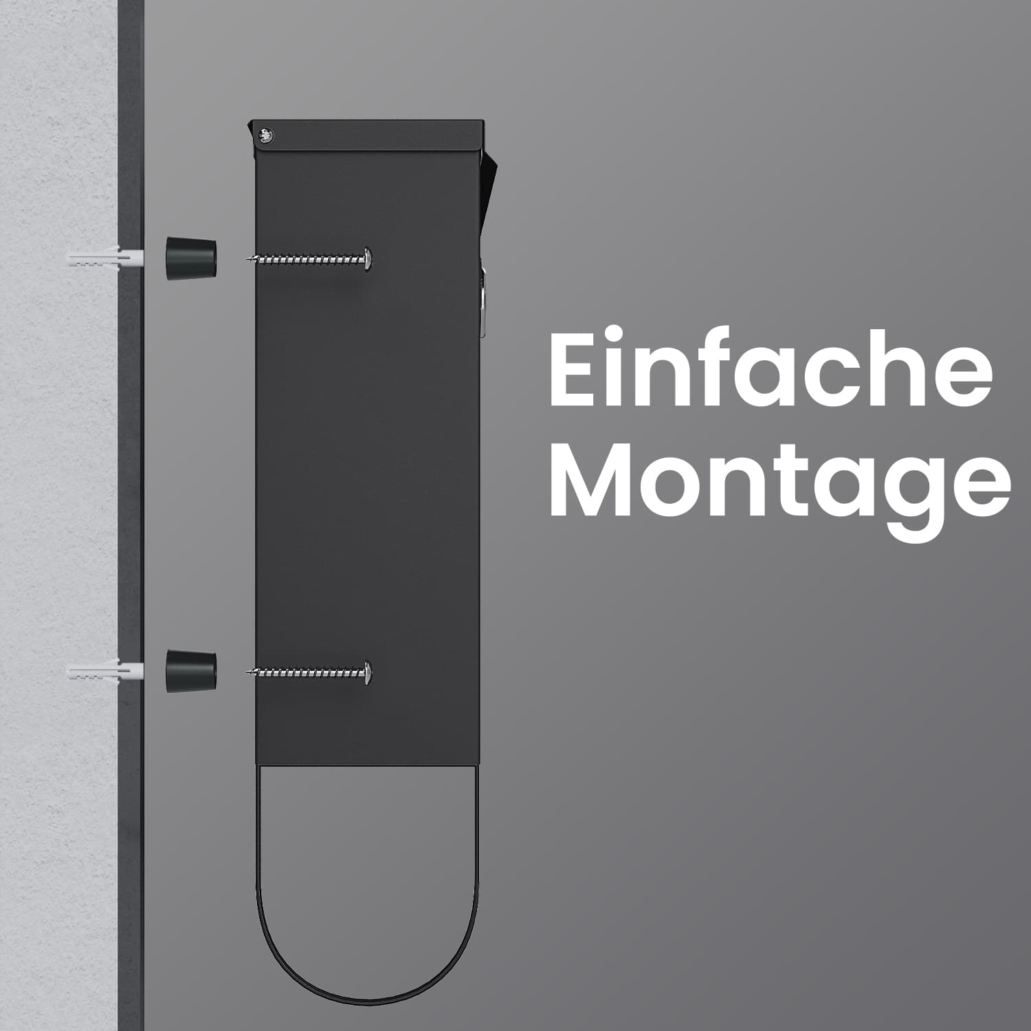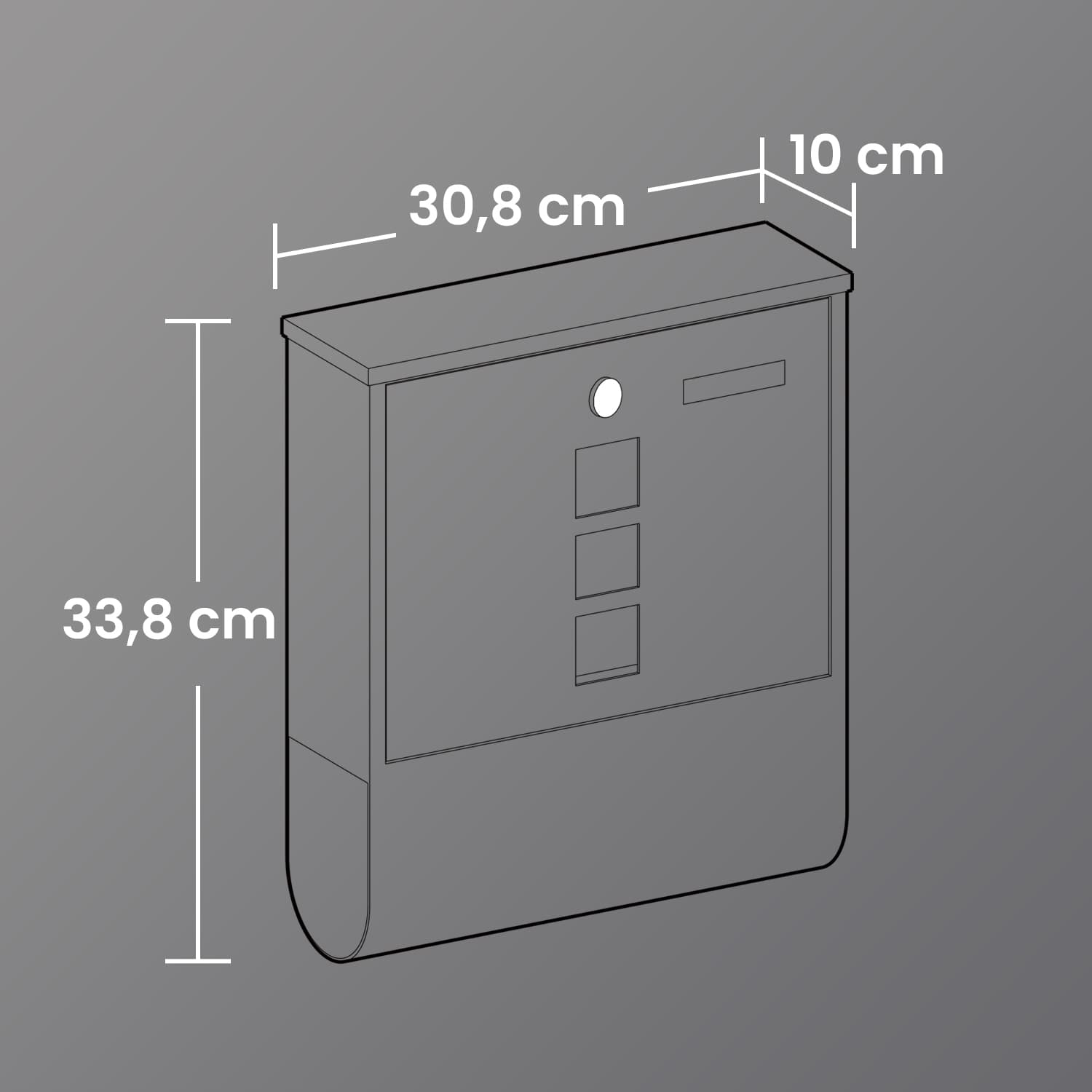 Produktdetaljer: Färg: Svart Material: Pulverlackerat stål Storlek: 30,5 x 9,5 x 33,3 cm (L x B x H) Vikt: 1,6 kg Leveransomfattning: 1 x brevlåda 1 x tillbehörspaket SONGMICS Anmärkningar:Det rekommenderas att placera brevlådan på en plats som är skyddad mot väder och vind för att säkerställa en längre livslängd.