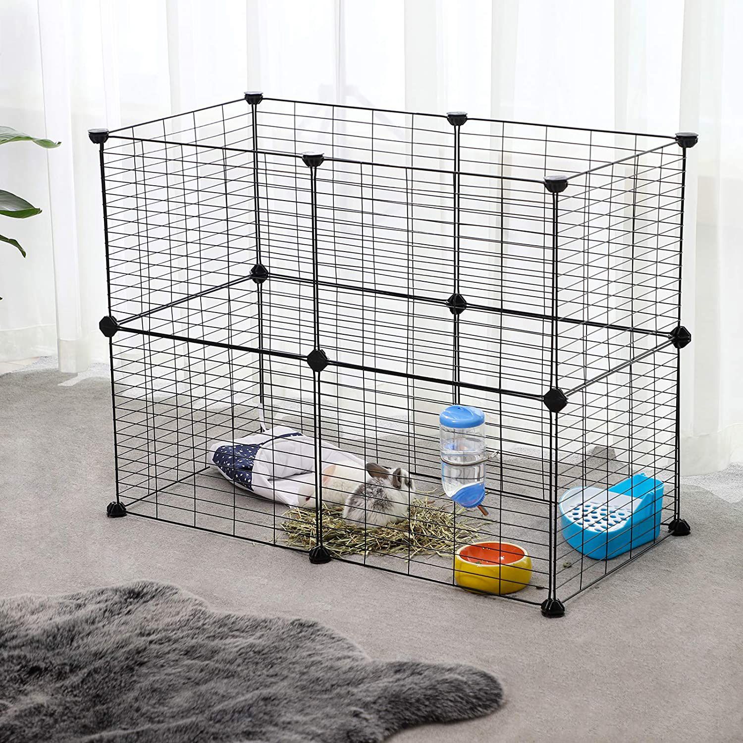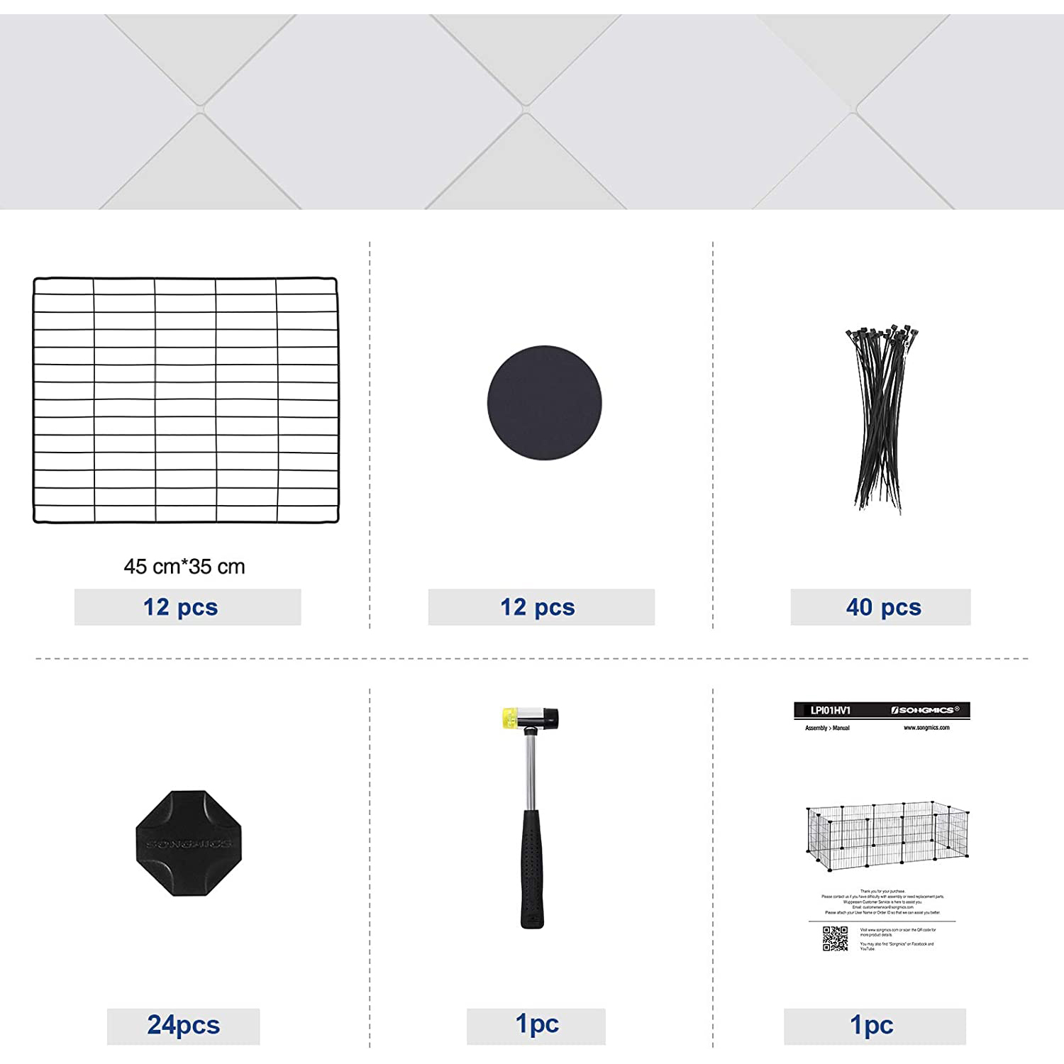 När dina husdjur mår bra kommer de att överösa dig med kärlek. Använd därför denna bur från SONGMICS för att ge ditt husdjur en öppen, rymlig och ändå väl skyddad lekplats. På så sätt känner din lilla pälsboll din gunst och kan leka och springa omkring. Husdjur är familjemedlemmar med behov: Den bur vi har designat kan anpassas efter ditt husdjurs behov. Du kan sätta ihop de 12 gallerplattorna och 24 ABS-plastkopplingarna till olika former. Placera leksaker, en husdjursbädd och en skål med vatten i buren och skapa ett kungarike för ditt husdjur.En säker zon för din älskling: De högkvalitativa ABS-kopplingarna ger redan gallerburarna en hög stabilitet. För att öka stabiliteten ytterligare medföljer 40 buntband som förhindrar att stängslet faller ihop under användning.Gör din fyrbenta vän glad med denna hundgård från SONGMICS och ge den det hem den alltid drömt om! Produktdetaljer: Färg: Svart Material: Metallgaller, plastkopplingar Total storlek: 143 x 73 x 46 cm (L x B x H)Storlek per gallerelement: 35 x 45 cm (L x H) Vikt: 3,9 kg Leveransomfattning: 12 x metallgallerplattor 24 x plastkopplingar 1 x gummiklubba 12 x halkskydd 40 x buntband 1 x bruksanvisning (DE, EN, FR, ES, IT) SONGMICS Anmärkningar:Lägg en matta eller liknande på gallerplattorna som fungerar som gångyta för att skydda dina husdjurs tassar. Slå inte med våld på produkten när du använder hammaren. Låt inte produkten komma i kontakt med vassa eller spetsiga föremål, sitt inte på utrymmet och håll det borta från värmekällor.Ställ inte produkten utomhus permanent. Se till att alla gallerelement är helt insatta i plastkopplingarna under monteringen. Vi rekommenderar att du använder halkskydd för att säkerställa att buren står stadigt.