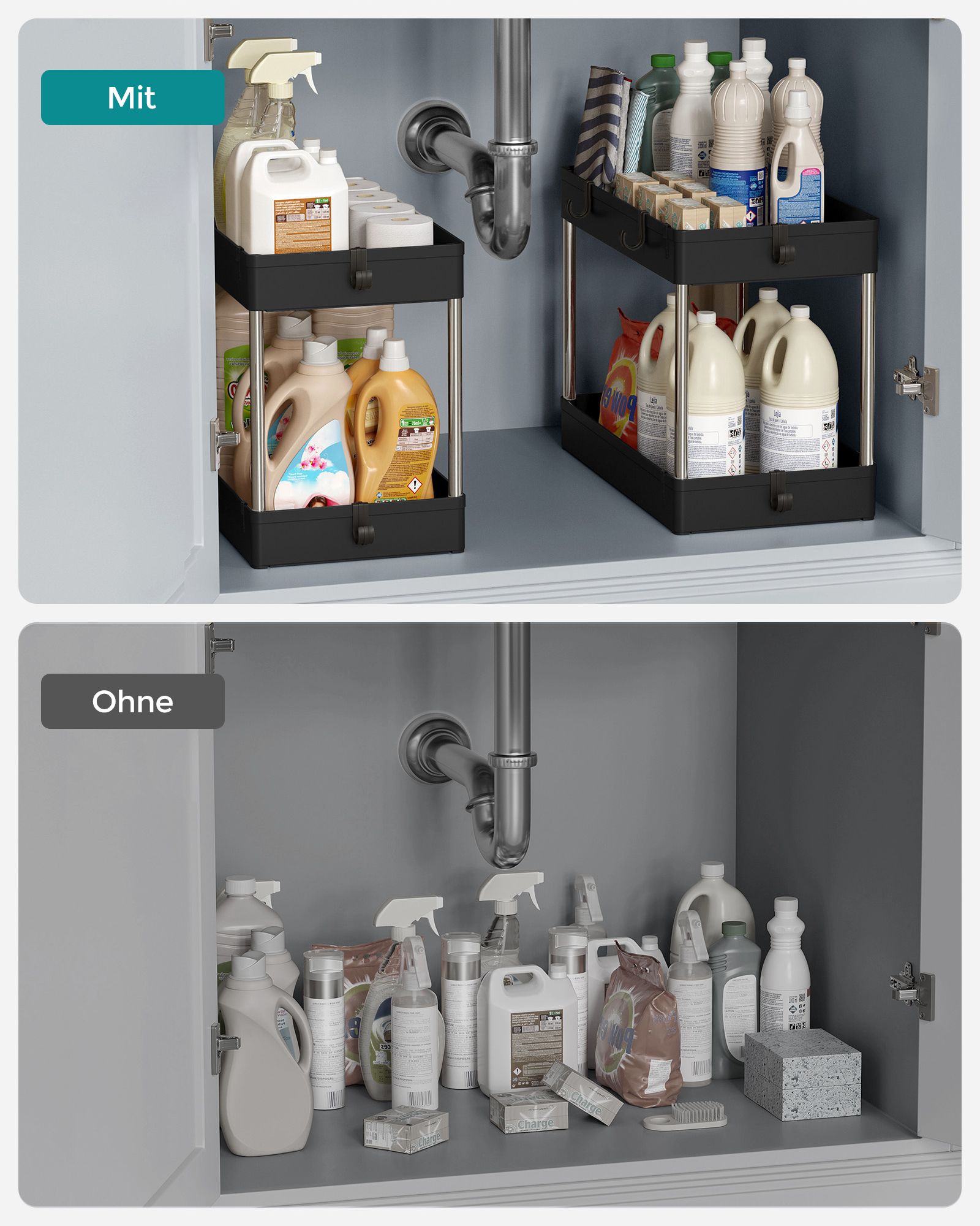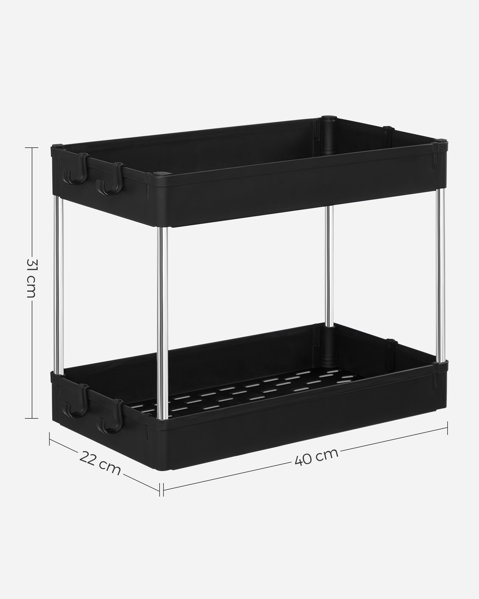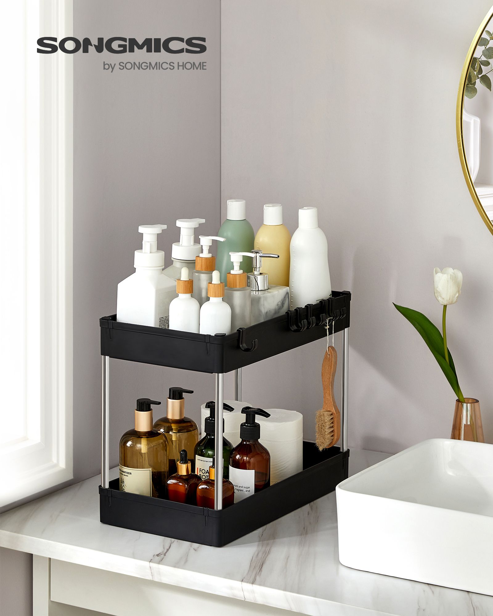 SONGMICS kökshylla, under diskbänken, underskåpshylla, badrumshylla, under handfatet, diskbänkshylla, med 2 hyllplan, 6 krokar, förvaring under diskbänken, för kök, badrum, vit BUO001W01