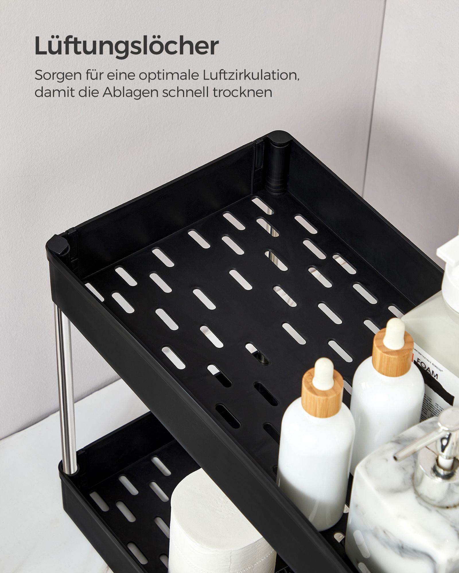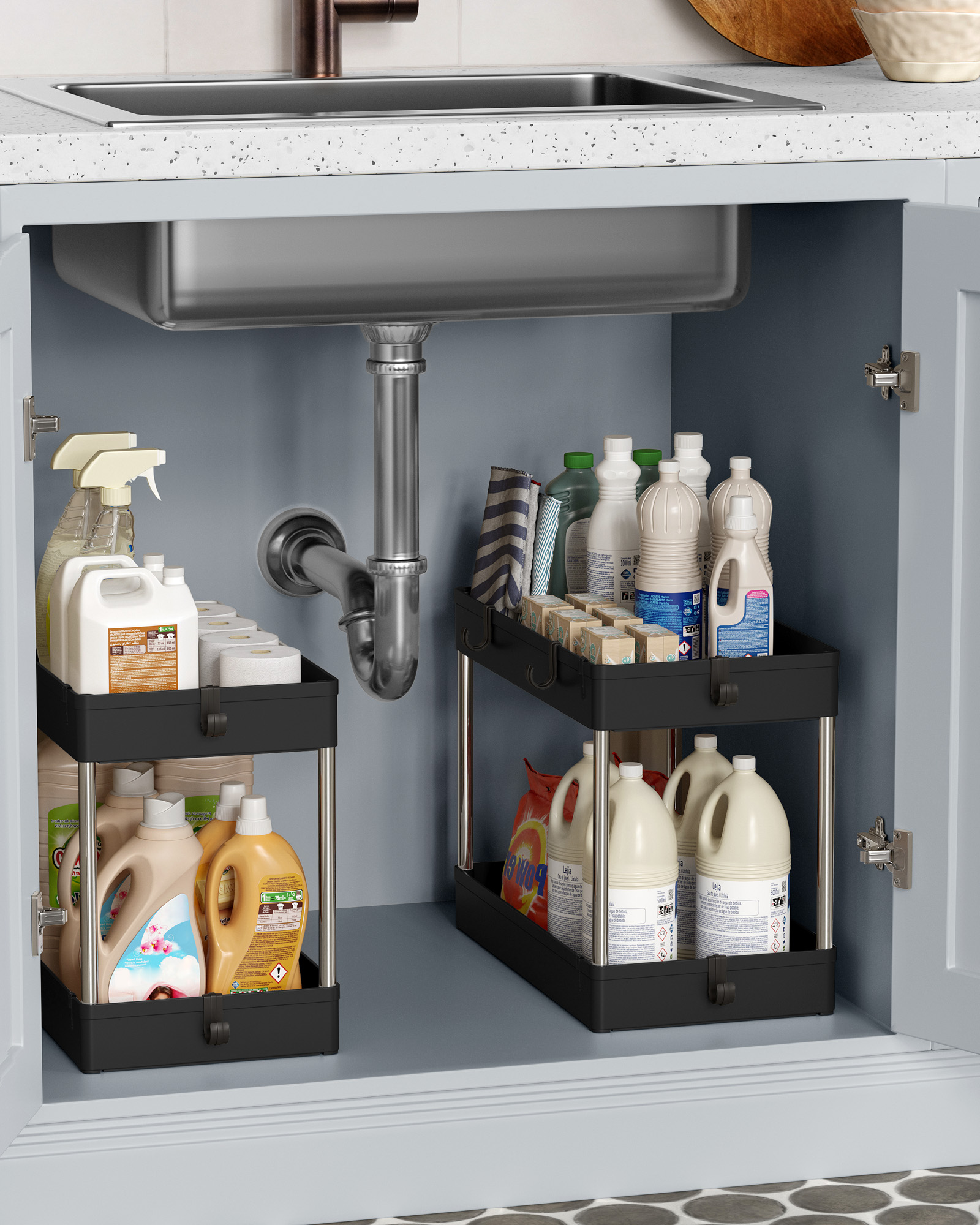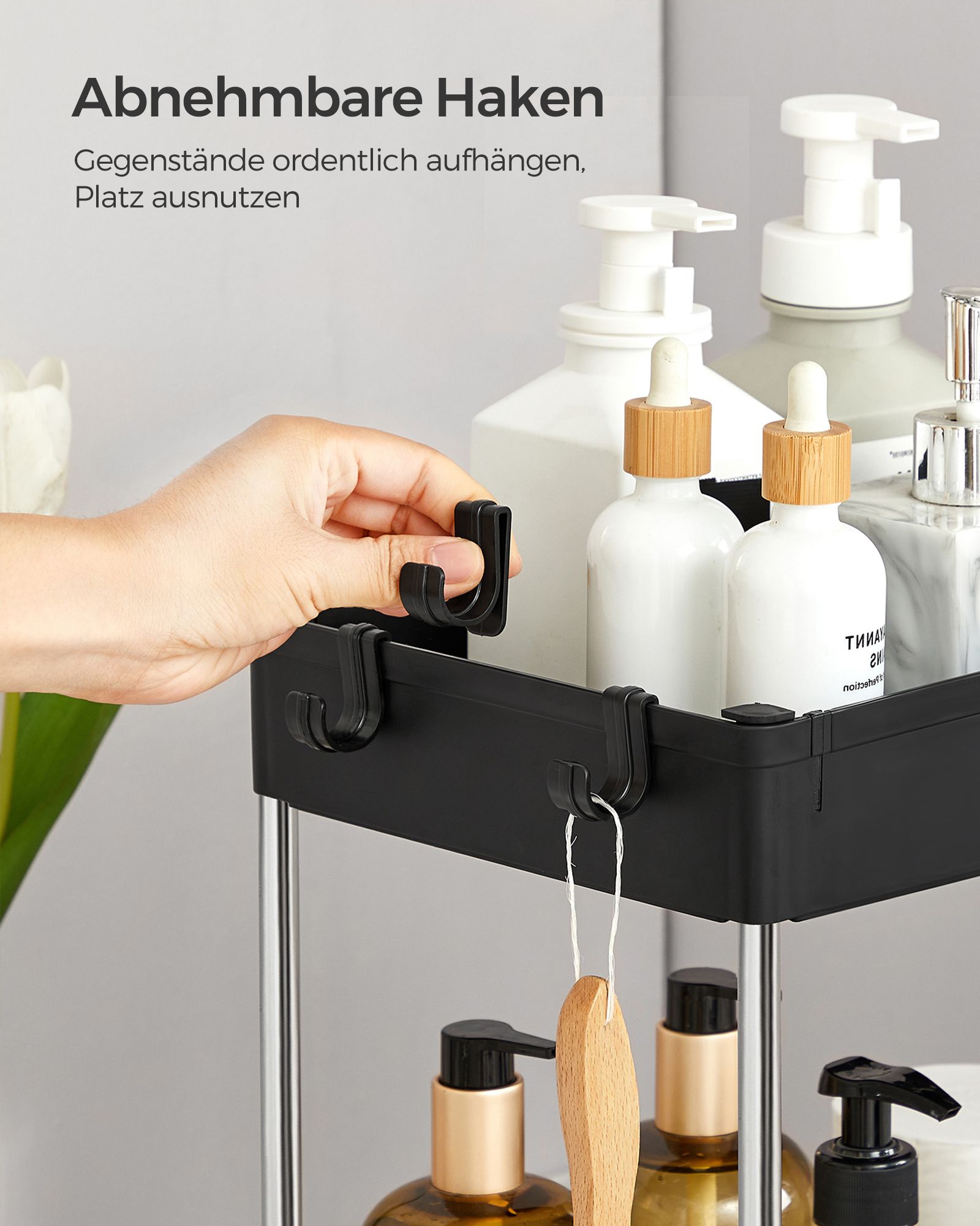 SONGMICS kökshylla, under diskbänken, underskåpshylla, badrumshylla, under handfatet, diskbänkshylla, med 2 hyllplan, 6 krokar, förvaring under diskbänken, för kök, badrum, vit BUO001W01