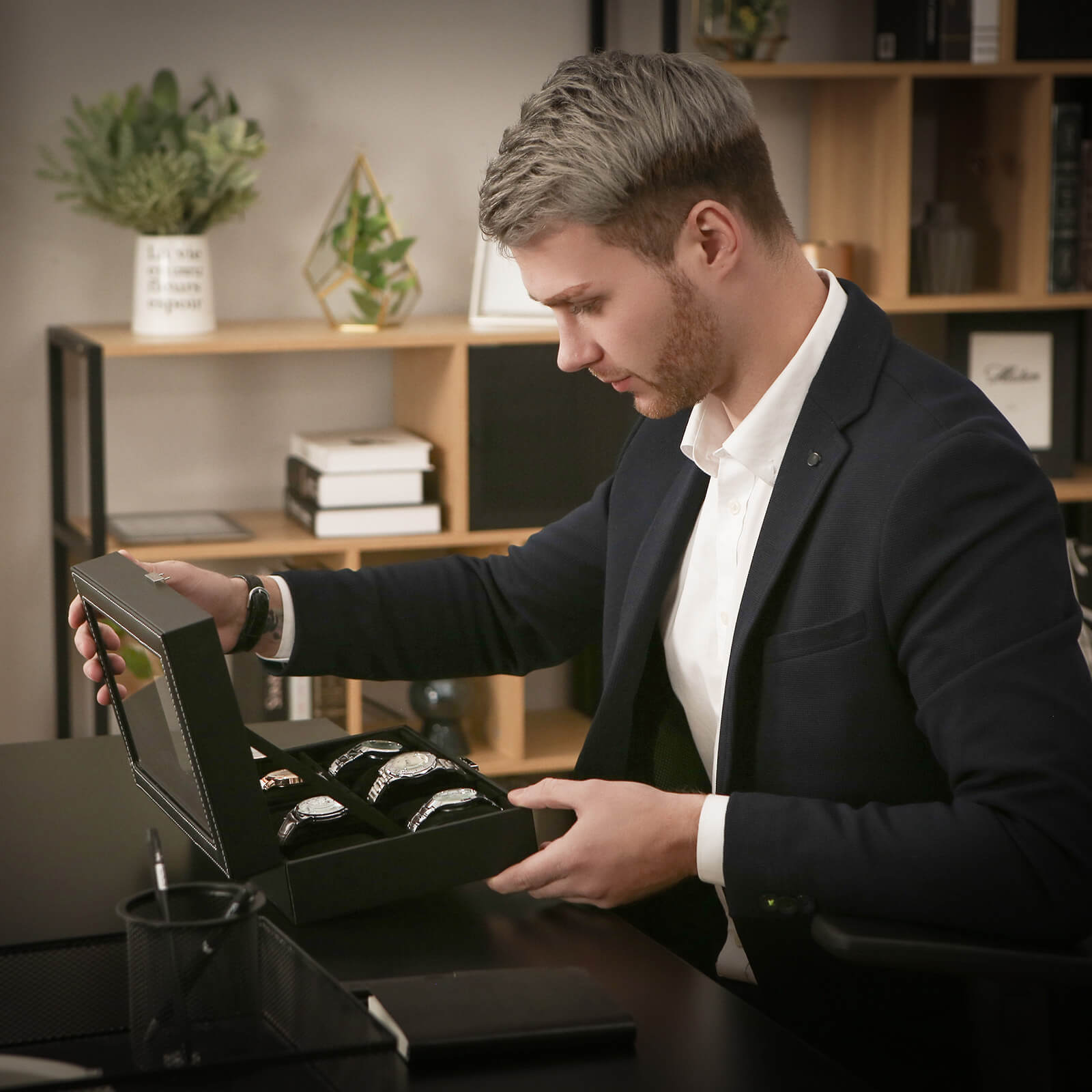 Nyckeln till framgång ligger i detaljerna: Denna klockbox från SONGMICS är genomtänkt in i minsta detalj: För att skydda dina klockor från obehörig åtkomst har den försetts med ett lås. Dessutom har vi förstärkt skiljeväggarna mellan klockfacken, vilket ger dina klockor ett stabilt grepp.Bakom en enkel fasad döljer sig ett drömhus för klockor: Klockboxen ser enkel och diskret ut, men när du öppnar locket kommer du att överraskas av dess lyxiga inredning: Boxen är klädd med ett mjukt sammetfoder och även klockkuddarna är klädda med sammet. Här hittar dina klockor eller armband ett passande hem. Tack vare de avtagbara klockkuddarna kan du även förvara andra smycken i denna låda, vilket är ytterligare en fördel med denna låda. Denna investering är väl värd pengarna: Klocklådan skyddar dina dyrbara klockor från smuts, repor, skador etc. På så sätt sparar du kostnader för reparation eller underhåll av din klocka. Det råder alltså ingen tvekan om att köpet av en klocklåda är en klok investering. Produktdetaljer: Färg: svart Material: MDF, PU, sammet, glas Totala mått: 30 x 21 x 8,5 cm (L x B x H) Mått per klockfack: 7 x 4,8 cm Mått per klockkudde: 7 x 3,5 x 4,8 cm (B x H x D) Vikt: 1,12 kg Leveransomfattning: 1 x klockbox