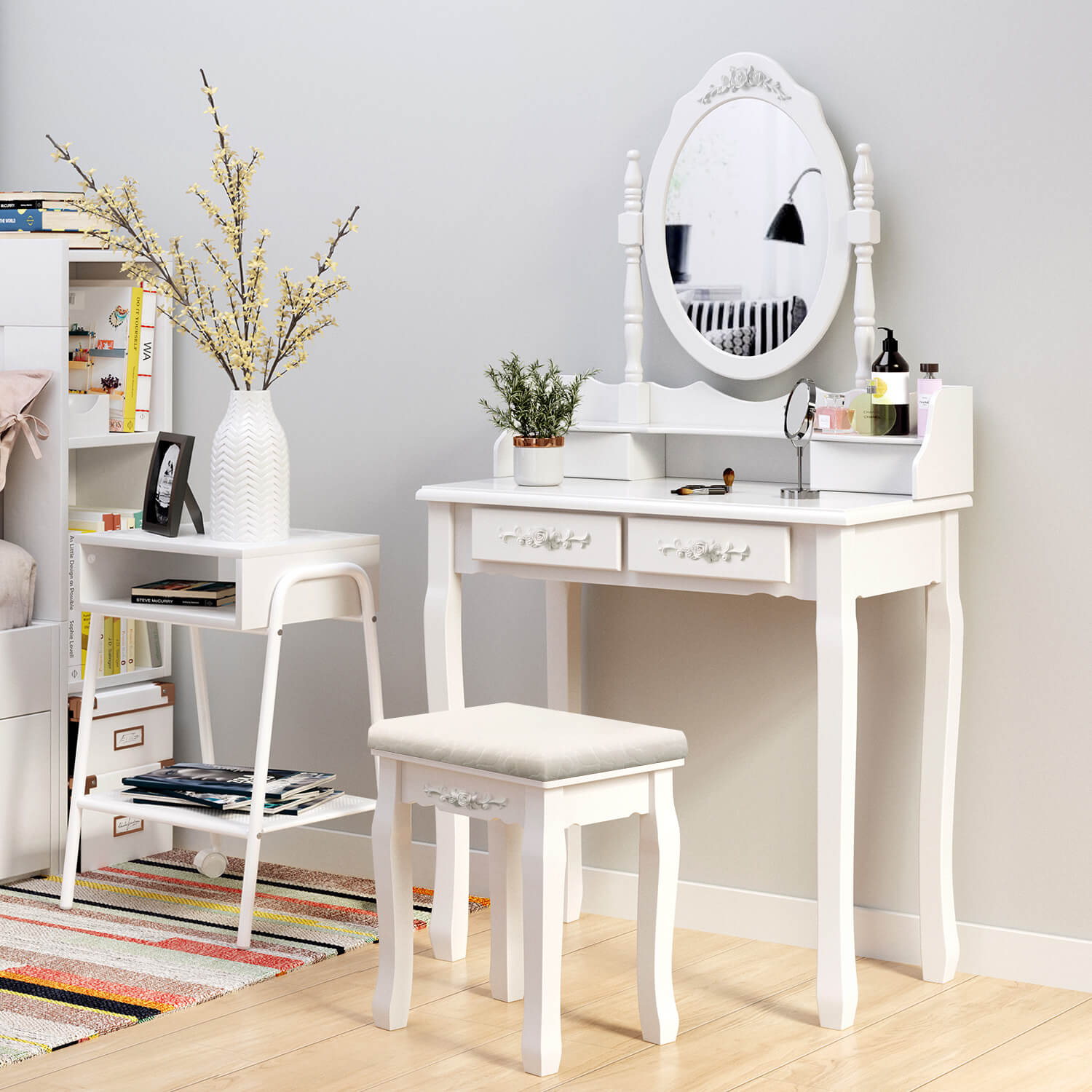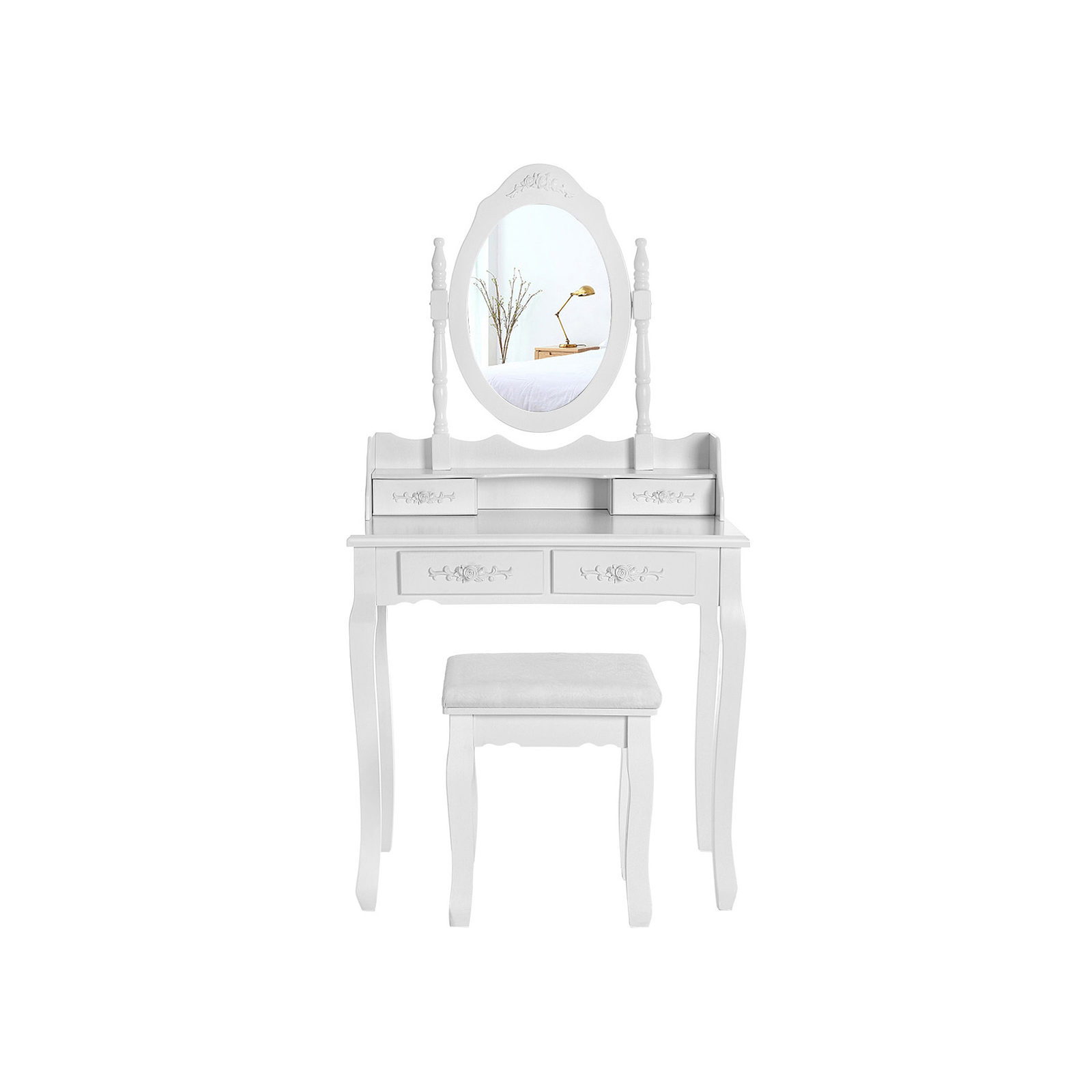 Vi presenterar ett högkvalitativt sminkbord i vitt till ett oslagbart pris! Det tar liten plats men erbjuder många möjligheter. Produktdetaljer: – Färg: vit – Mått: 145 x 75 x 40 cm – Mått bordsskiva: 75 x 40 cm – Mått spegel: 54 x 38 cm (B x H) – Mått pall: 45 x 37 x 28 cm – Mått liten låda: 17,5 x 7,5 x 5,5 cm (BxDxH) – Mått stor låda: 27 x 22,5 x 6 cm (BxDxH) – Material: Massivt trä + MDF klass E1 Obs! – För att undvika att pallen välter, sitt inte på stolskanten. Skaka inte på pallen och låt dig inte bara falla ner på den. När du sitter ska du använda hela sittytan och alla fyra benen ska alltid vara på golvet. – Använd inte en akku-skruvdragare för montering, utan den medföljande inbussnyckeln. – Undvik generellt all kontakt mellan ytan och vassa eller spetsiga föremål för att undvika repor. – Följ underhållsinstruktionerna innan du underhåller bordet. – För att de förborrade gängorna i benen inte ska skadas och skruvarna inte ska sitta snett, ska du först skruva i skruvarna när du monterar benen, efter att alla borrhål har anpassats till varandra. – Försök inte montera bordet med våld. Detta skadar produkten. Vid problem, vänligen kontakta vår kundtjänst. Leveransomfattning: – 1x sminkbord – 1x pall – 2 x underhållare – 1x monteringsanvisning (DE, FR, EN, ES, IT)