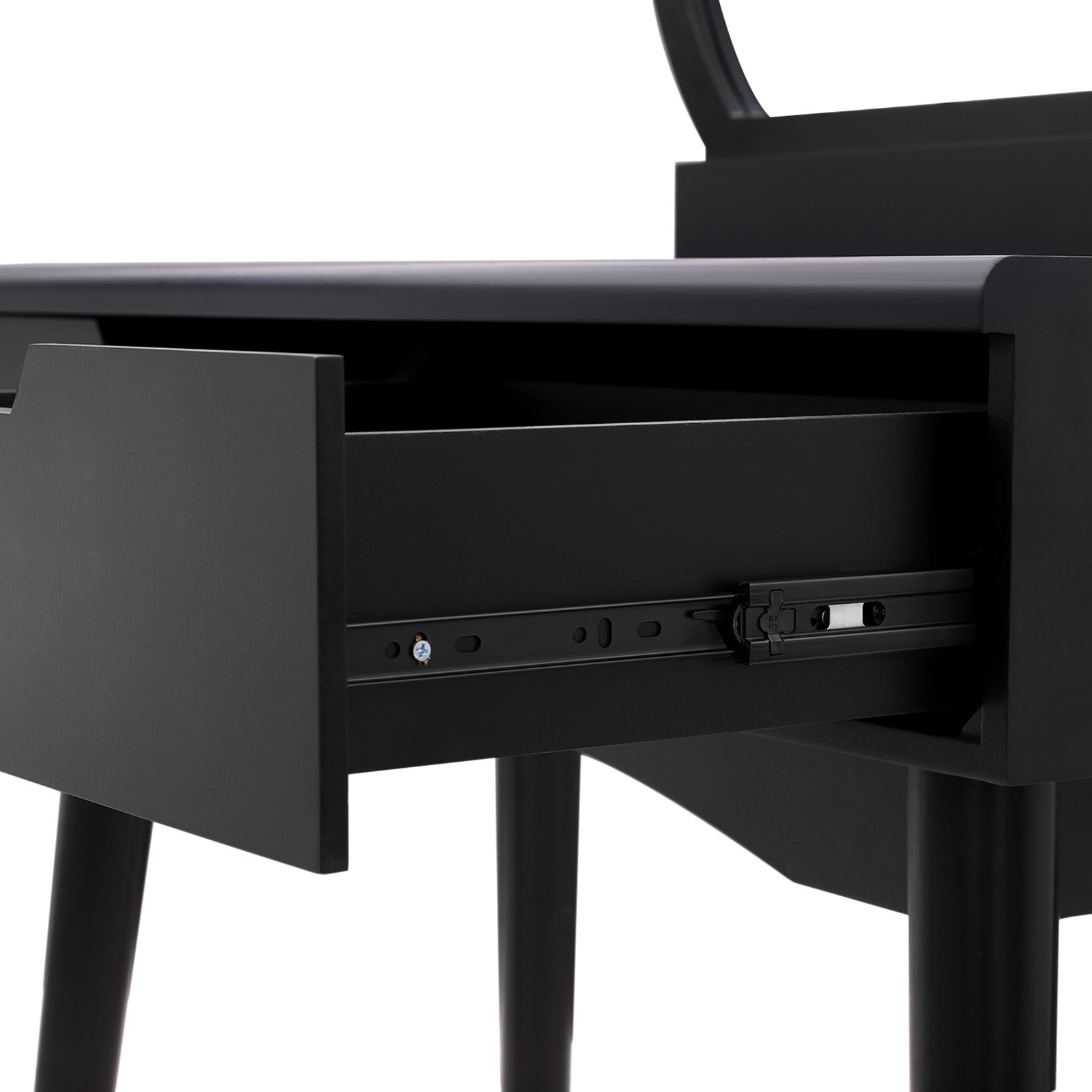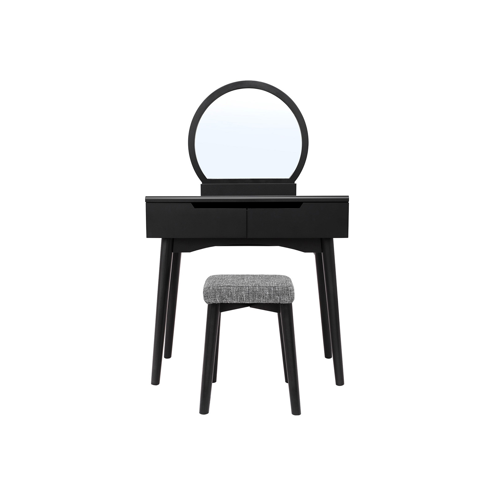 Produktdetaljer: Färg: svart Material: MDF-skiva, furu, gummiträ Mått: 80 x 128 x 40 cm (sminkbord) 32,5 x 45,5 x 32,5 cm (pall) Vikt: 20,1 kg Leveransomfattning: 1 x sminkbord 1 x spegel 1 x pall 1 x bruksanvisning (DE, EN, IT, FR, ES)