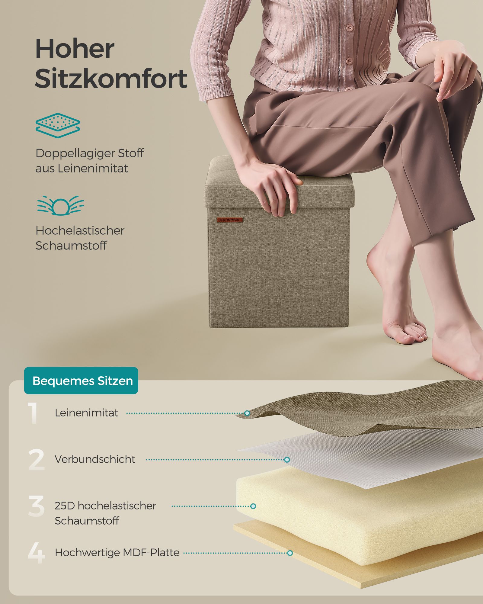 Material: MDF (medeldensitetsfiberplatta), imiterat linne, 25D högelastiskt skumplast