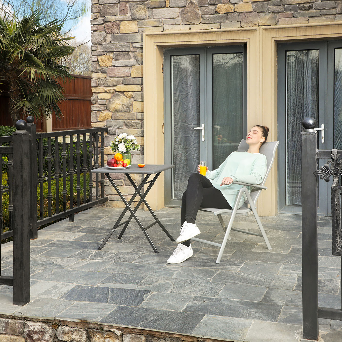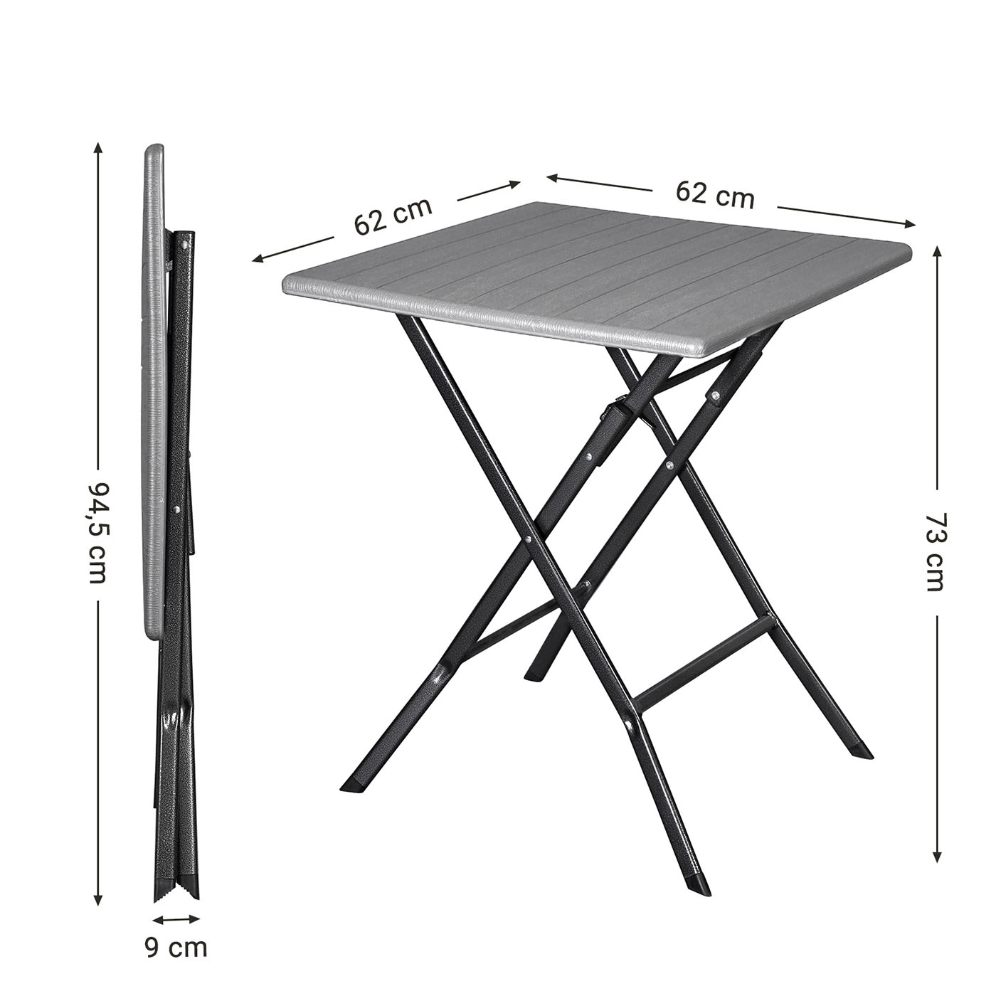 Produktbeskrivning:SONGMICS – Detta varumärke står inte bara för stilfulla och prisvärda inredningsartiklar. Vi vill också erbjuda praktiska, väderbeständiga och stabila möbler för utomhusbruk som gör att du kan njuta ännu mer av din fritid.Ett fällbart bord för alla tillfällen – Om du gillar att tillbringa din fritid på campingen eller i trädgården är bordet ovan ett praktiskt komplement till dina trädgårds- eller campingmöbler, som är lätt att transportera. I hopfällt läge är det flexibla campingbordet bara 9 cm brett, så det får plats både i bagageutrymmet och i ett hörn av källaren eller på vinden.Oavsett om du vill ställa grillkorv och öl på bordet på campingen eller en vacker krukväxt och din kaffekopp på balkongen, garanterar de stabila järnbenen, säkerhetslåset och de hovliknande fötterna en hög stabilitet för denna utemöbel.Kolla även in de matchande trädgårdsstolarna från SONGMICS! Produktdetaljer: Färg: Grå Material: HDPE-plast (högdensitetspolyeten), järn Storlek i uppfällt läge: 62 x 62 x 73 cm (L x B x H)Storlek hopfälld: 94,5 x 62 x 9 cm (L x B x H) Vikt: 5,5 kg Max. statisk belastningskapacitet: 60 kg Leveransomfattning: 1 x fällbord 1 x bruksanvisning (DE, EN, FR, ES, IT) SONGMICS Anmärkningar: Utsätt inte produkten för starkt solljus under en längre tid.Lyft inte bordet och flytta det inte medan du använder det. Det finns risk att det fälls ihop oavsiktligt och att du skadar dig eller att föremål faller ner.