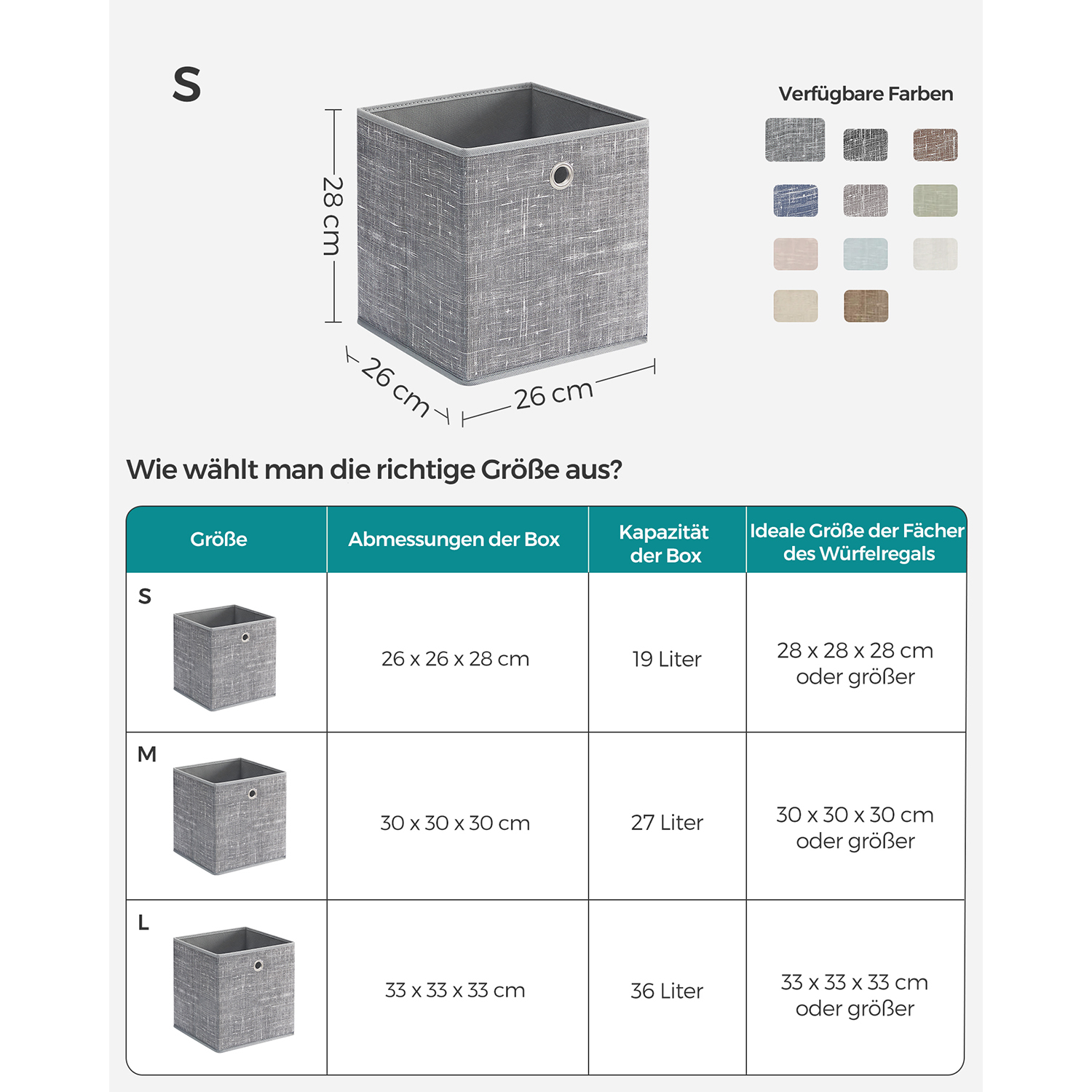 Storlek per låda: 26 x 26 x 28 cm (L x B x H)