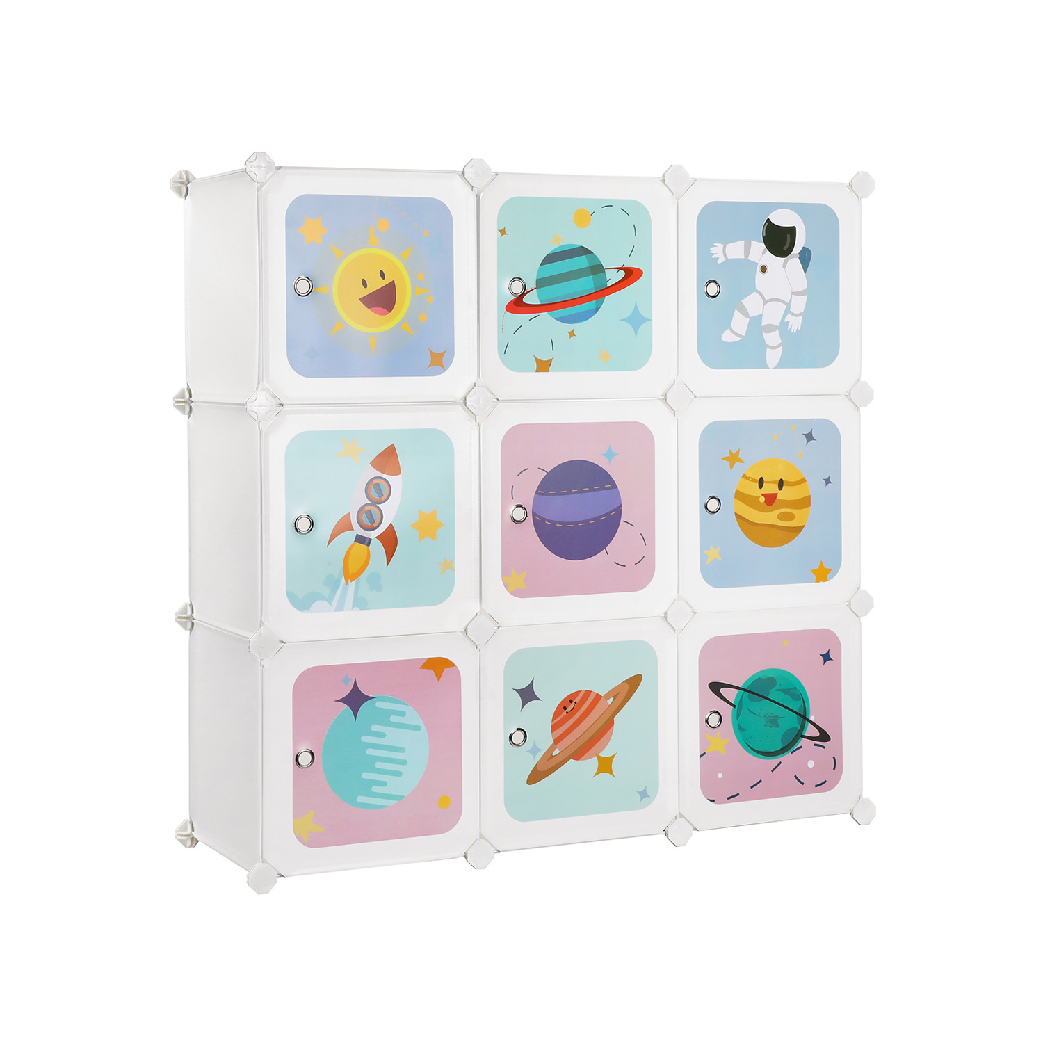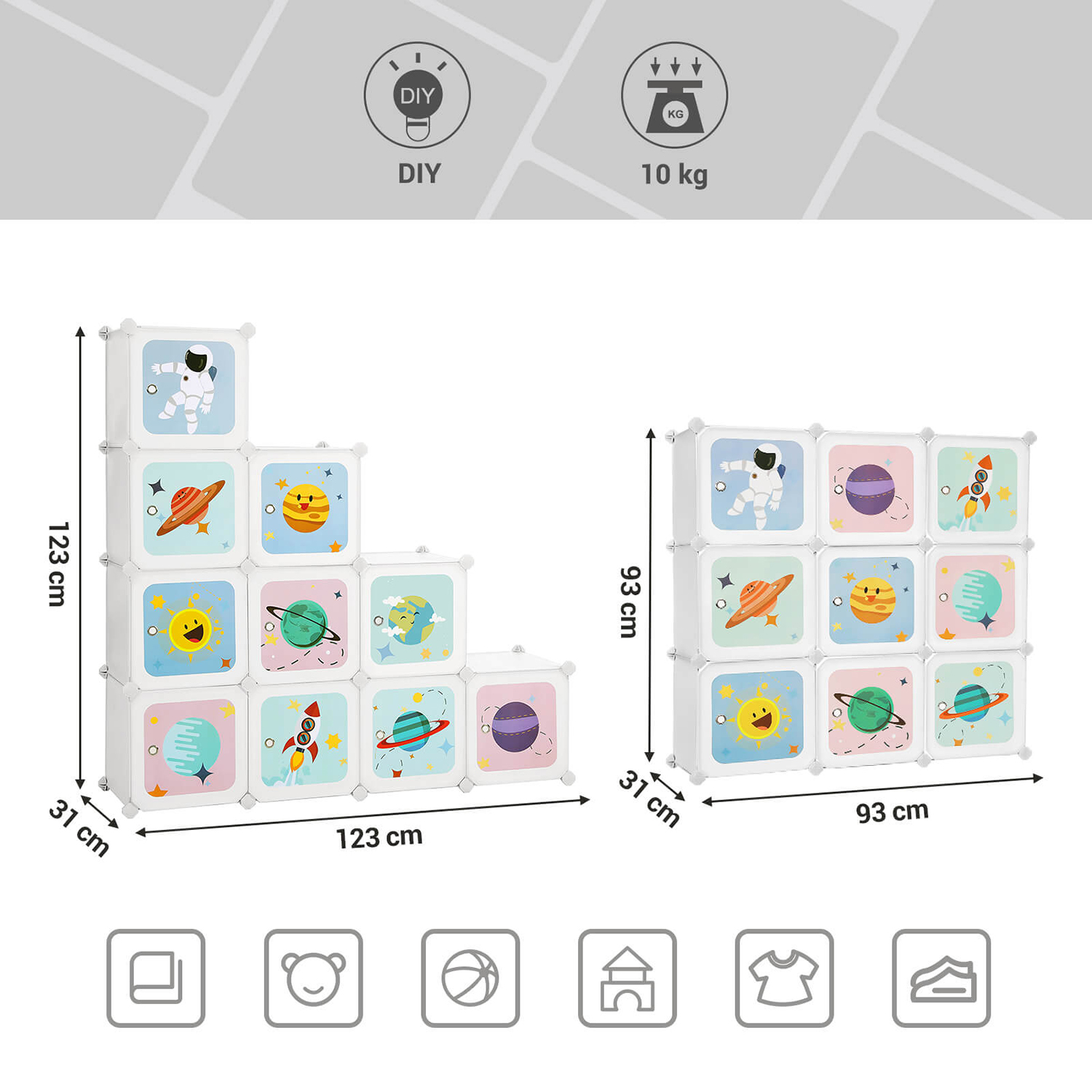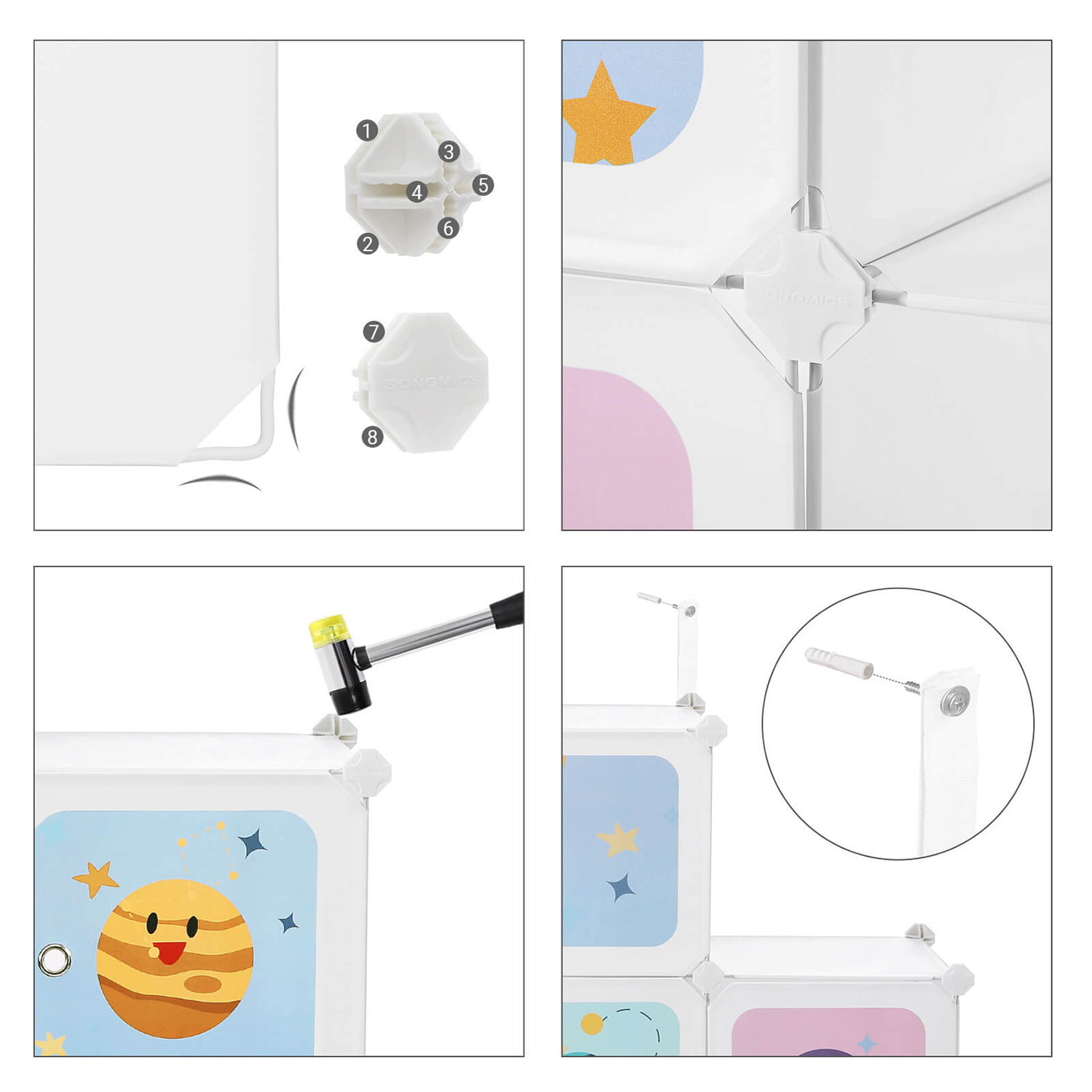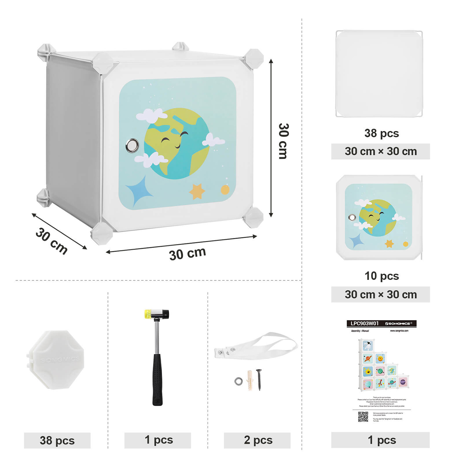 Ett riktigt blickfång Unika mönster, söta färger – ge dina barn detta hyllsystem med rymdtema så att de kan låta fantasin flöda fritt – små upptäcktsresande tycker att en resa till rymden är riktigt häftig! Upptäck ännu fler möjligheter Detta plugghyllsystem erbjuder många olika användningsmöjligheter. Du kan bygga det individuellt och anpassa det efter ditt utrymme. De söta rymdmotiven uppmuntrar dessutom dina barn att städa och fungerar som en påminnelse om i vilket fack respektive föremål ska placeras. TÜV-testad kvalitet Inom ramen för följande tester utförda av TÜV Rheinland kunde ingen farlig ”utsläpp av 19 produktelement” enligt EN 71-3:2019 samt ”utsläpp av aluminium” enligt direktiv (EU) 2019/1922 från kommissionen, tillägg till direktiv 2009/48/EG (rapportnr: 244235596a 001). Produktdetaljer: – Färg: Vit – Material: PP-plastskivor med metallram, ABS-plastkopplingar – Storlek: 123 x 31 x 123 cm (L x B x H) – Storlek per kub: 30 x 30 x 30 cm (L x B x H) – Vikt: 7,2 kg – Max. statisk belastningskapacitet per kub: 10 kg – Max. statisk belastningskapacitet totalt: 80 kg SONGMICS Anvisningar:- Fäst denna produkt på väggen med den medföljande tippskyddet för att garantera säker användning. – Ej lämplig för barn under 3 år. Barn över 3 år får endast använda produkten under uppsikt av en vuxen. – Alla plastplattor ska tryckas helt ned under monteringen. Kontrollera efter varje rad att trådramarna är helt nedtryckta i kopplingsdelen för att öka produktens stabilitet.