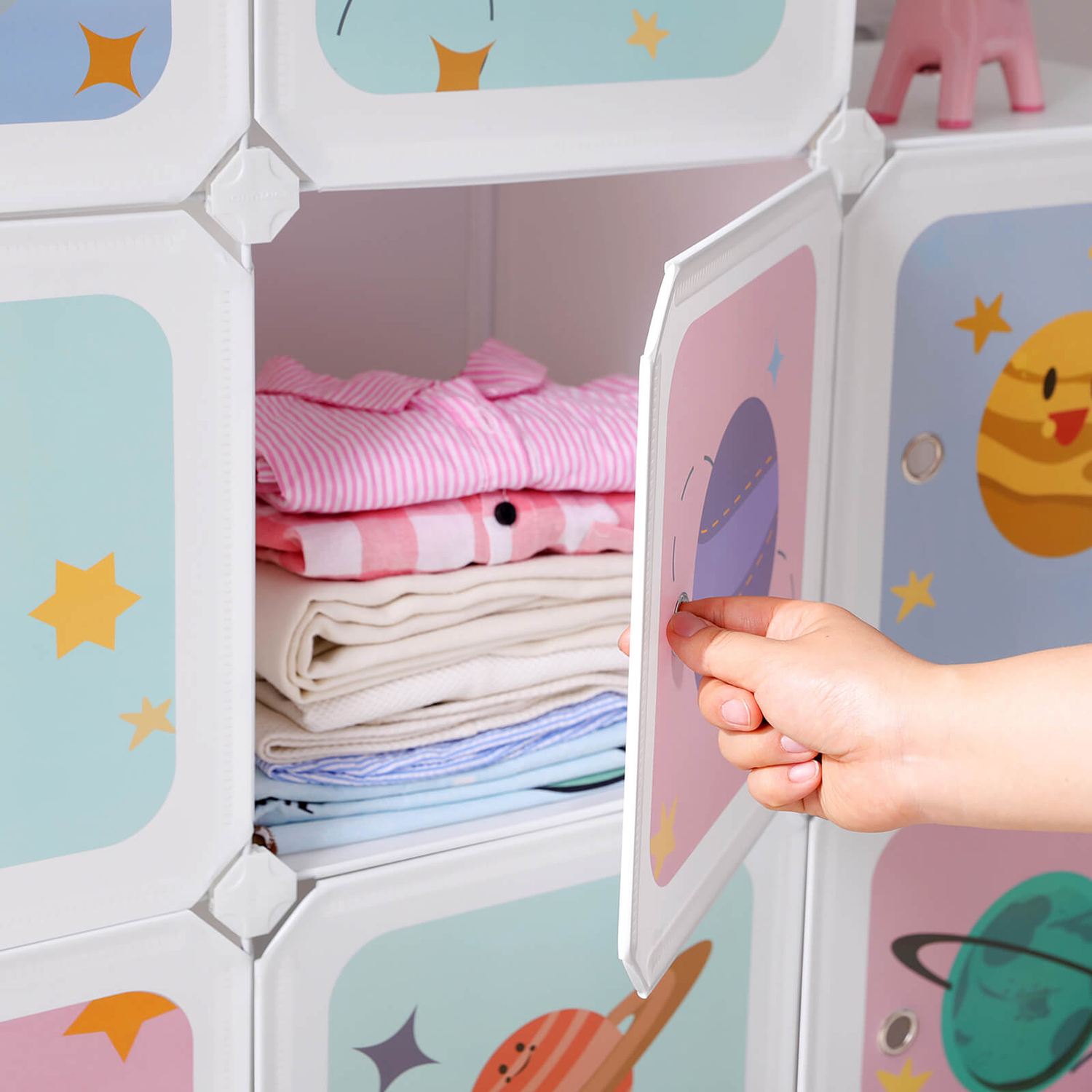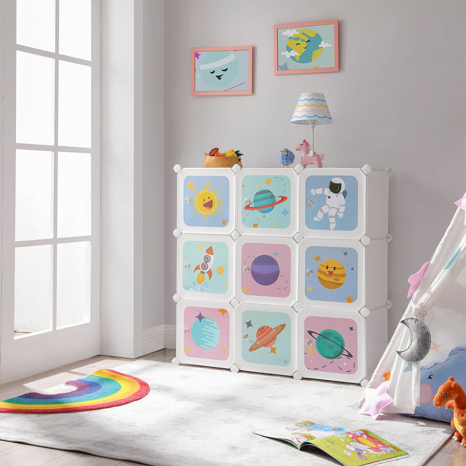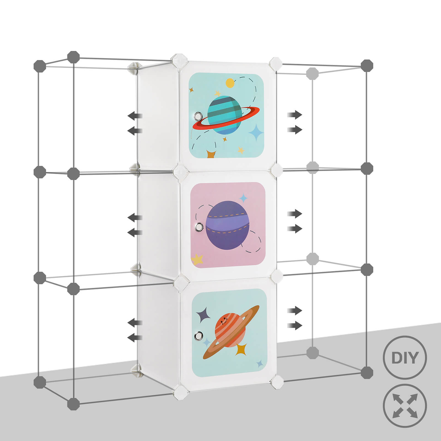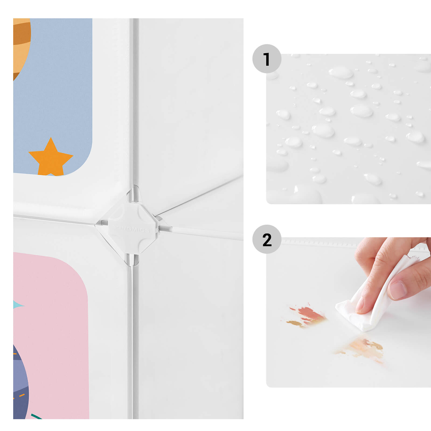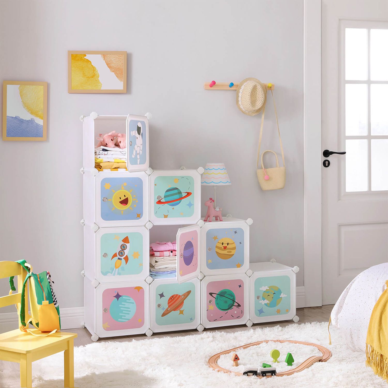 Ett riktigt blickfång Unika mönster, söta färger – ge dina barn detta hyllsystem med rymdtema så att de kan låta fantasin flöda fritt – små upptäcktsresande tycker att en resa till rymden är riktigt häftig! Upptäck ännu fler möjligheter Detta plugghyllsystem erbjuder många olika användningsmöjligheter. Du kan bygga det individuellt och anpassa det efter ditt utrymme. De söta rymdmotiven uppmuntrar dessutom dina barn att städa och fungerar som en påminnelse om i vilket fack respektive föremål ska placeras. TÜV-testad kvalitet Inom ramen för följande tester utförda av TÜV Rheinland kunde ingen farlig ”utsläpp av 19 produktelement” enligt EN 71-3:2019 samt ”utsläpp av aluminium” enligt direktiv (EU) 2019/1922 från kommissionen, tillägg till direktiv 2009/48/EG (rapportnr: 244235596a 001). Produktdetaljer: – Färg: Vit – Material: PP-plastskivor med metallram, ABS-plastkopplingar – Storlek: 123 x 31 x 123 cm (L x B x H) – Storlek per kub: 30 x 30 x 30 cm (L x B x H) – Vikt: 7,2 kg – Max. statisk belastningskapacitet per kub: 10 kg – Max. statisk belastningskapacitet totalt: 80 kg SONGMICS Anvisningar:- Fäst denna produkt på väggen med den medföljande tippskyddet för att garantera säker användning. – Ej lämplig för barn under 3 år. Barn över 3 år får endast använda produkten under uppsikt av en vuxen. – Alla plastplattor ska tryckas helt ned under monteringen. Kontrollera efter varje rad att trådramarna är helt nedtryckta i kopplingsdelen för att öka produktens stabilitet.