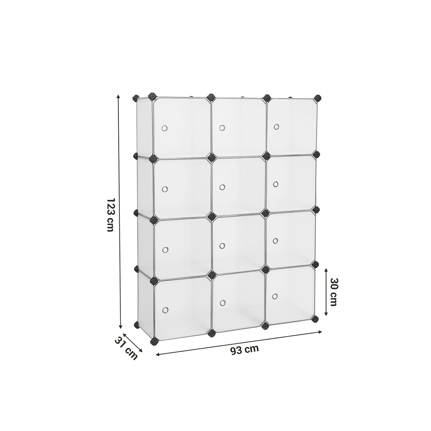 En riktig allroundare: en garderob i sovrummet, ett skoställ i hallen, ett hyllsystem i ett outnyttjat hörn… Denna garderob är en riktig multitalang! Glöm inte att montera dörrkrokarna. För att göra detta behöver du bara sätta in den paraplyformade änden av kroken i kopplingsdelen. Stäng dörrarna och ge dammet ingen chans! Stabil, robust och hållbar: Tillverkad av robusta metalltrådsramar, PP-plastskivor och högkvalitativa ABS-plastkopplingar, har denna garderob en hög belastningskapacitet. Varje kub kan rymma upp till 10 kg kläder eller skor. Dessutom ger tippskyddet extra stabilitet och säker användning. Produktdetaljer: – Färg: Vit – Material: PP-plastskivor, metalltrådsram, ABS-plastkopplingar – Storlek per kub: 30 x 30 x 30 cm (L x B x H) – Total storlek: 93 x 31 x 123 cm (L x B x H) – Vikt: 8 kg – Max. statisk belastningskapacitet per fack: 10 kg – Max. statisk belastningskapacitet totalt: 80 kg Leveransomfattning:- 43 x plastplatta i vitt (30 x 30 cm) – 12 x dörrplatta i vitt (30 x 30 cm) – 44 x plastkoppling i svart – 12 x dörrkrok – 1 x hammare – 2 x tippskydd – 1 x bruksanvisning (DE, EN, FR, ES, IT) SONGMICS Anmärkningar:- Alla plastplattor ska tryckas fast ordentligt i kopplingsdelarna. Efter att varje rad har monterats, knacka på kopplingsdelarna med den medföljande hammaren för att säkerställa en stabil koppling mellan alla delar. – Produktens maximala statiska belastningskapacitet är 80 kg. Överskrid inte denna maximala vikt. – Förvara inte vassa eller skarpa föremål i produkten. – Denna produkt kan endast monteras i olika former med de delar som ingår i leveransen.