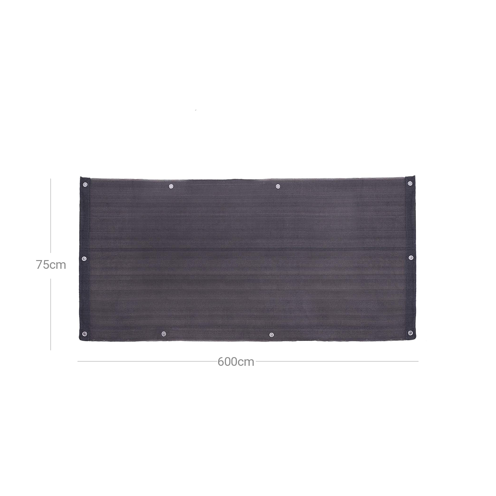 Helt utan borrmaskin Denna 6 x 0,75 m stora insynsskydd är särskilt lämplig för en balkong i standardstorlek. Den smarta beklädnaden har många öglor placerade med 50 cm mellanrum i övre och nedre delen. Kortsidorna är försedda med 3 öglor vardera. Vid montering drar du helt enkelt den medföljande robusta fästlinan av PP (15 m) genom öglorna och fäster den vid din balkong eller staket. De medföljande buntbanden ger dessutom extra stabilitet. Montering helt utan borr, så enkelt är det! Robust material & Högkvalitativ tillverkning Tillverkad av 100 % HDPE-plast (180 g/m²), är denna skyddspresenning vattentät och hållbar. Öglorna på sidorna är dessutom förstärkta med aluminium, vilket också garanterar en lång livslängd. Sömmarna runt öglorna är dessutom extra tjocka, vilket ger dem ett stabilt fäste.Produktdetaljer: Färg: antracit Material: HDPE-plast Storlek: 6 x 0,75 m (L x B) Vikt: 0,85 kg Leveransomfattning: 1 x insynsskyddspresenning 1 x fästlina (15 m) 1 x påse med buntband