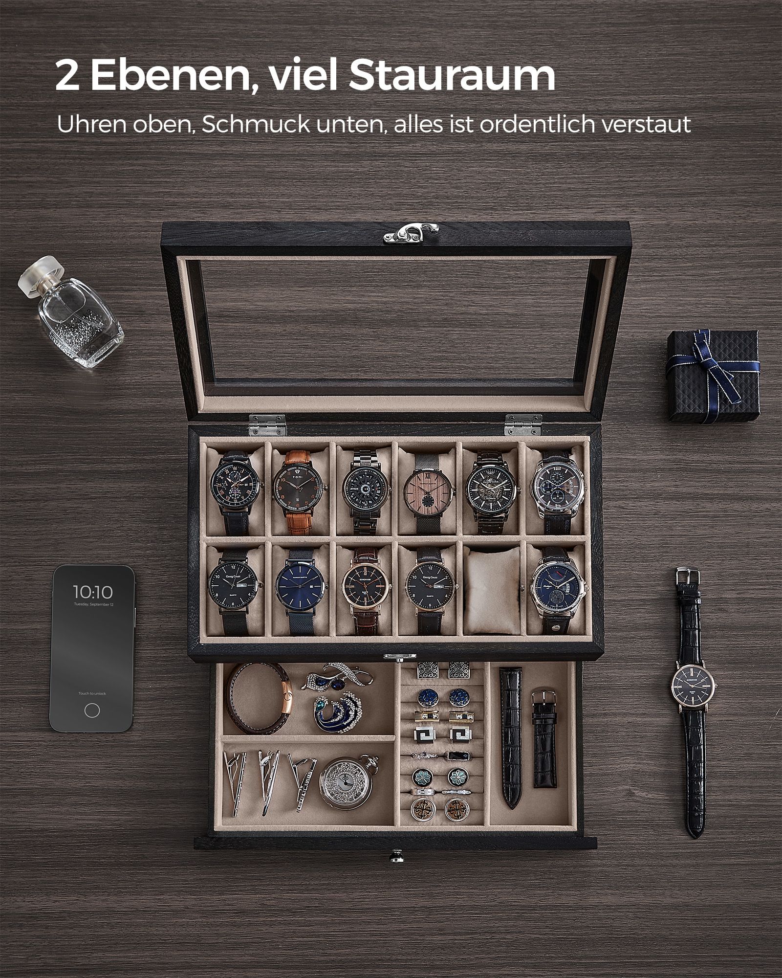 Klocklåda med 8 fack, klocklåda i massivt trä, med glaslock, klockkudde, smyckesförvaring, ebenholts svart