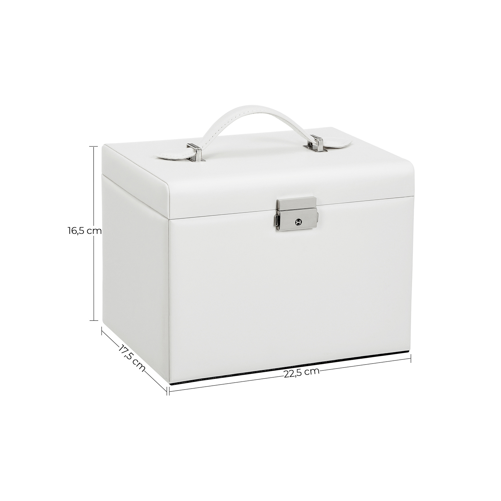 Original – för en lyckad present! Puh… Kommer du att komma tomhänt till dina vänners födelsedagsfest eftersom du inte har någon bra presentidé? Nej, nej, nej! Välj istället denna användbara, praktiska och originella smyckeskrin och överlämna presenten tillsammans med dina bästa önskningar! Vi visar dig alla höjdpunkter i denna smyckeskrin:Storleken passar för hela din smyckessamling. 3 lådor för armband och halsband, 1 låda med avtagbara skiljeväggar. 10 fack för örhängen, broscher och hängen, med avtagbara skiljeväggar med hål för 20 örhängen. 9 fack för ringar. 8 krokar för halsband. 2 fickor för hängen.2 nycklar för att låsa lådan. Produktdetaljer: Färg: Vit Material: MDF (medeldensitetsfiberplatta), sammetfoder Storlek: 22,5 x 17,5 x 16,5 cm (L x B x H) Vikt: 1,6 kg Leveransomfattning: 1 x smyckeskrin 2 x nycklar